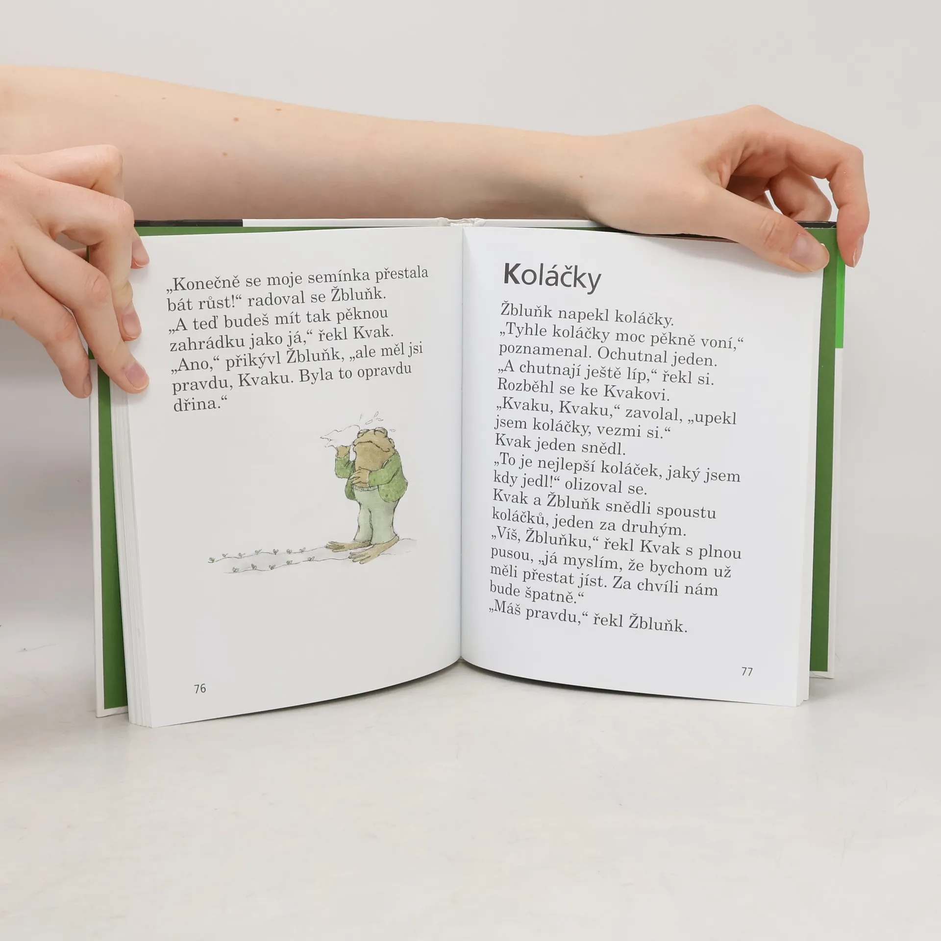 Úsměvné a hřejivé vyprávění o dvou kamarádech, zeleném žabákovi Kvakovi a hnědém ropušákovi Žbluňkovi potěšilo čtenáře nejen v zemi svého vzniku, ale i u nás (včetně dalších pokračování). Kdo by si tedy znovu rád nepřečetl o drobných příhodách a patáliích, které potkaly oba přátelé, když se na jaře probudili ze zimního spánku. Třeba právě o tom, jak hledali ztracený knoflík, jak se koupali v řece, jak pěstovali květiny či jak statečně utíkali před draky a obry. Prolínání fantazie s realitou umocňuje kouzlo této milé knížky, která je přímo stvořená pro začínající čtenáře.