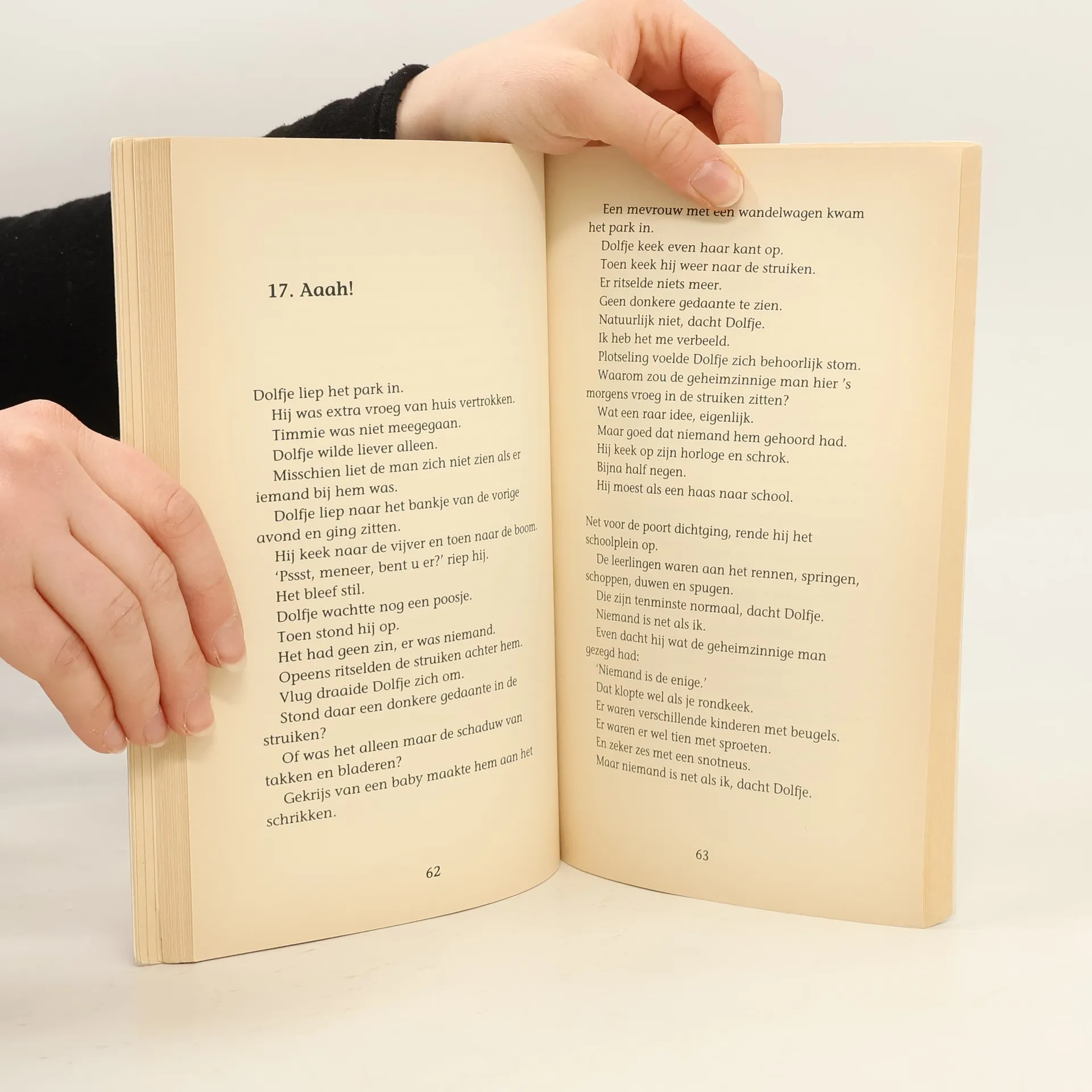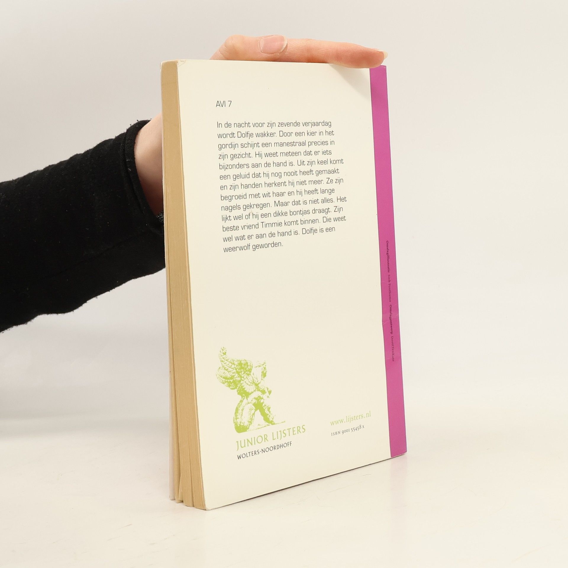 Als Dolfje wakker wordt, is het donker. De maan schijnt in zijn kamer. Het is een bijzondere nacht. Zeven, denkt Dolfje. Eindelijk ben ik zeven jaar. Dan schrikt hij zich rot. Hij ziet opeens overal haar. Zijn handen en voeten zijn poten geworden. En hij heeft een staart. Dan komt Timmie binnen. 'Ik wil dit niet,' gromt Dolfje 'Misschien gaat het vanzelf wel over,' zegt Timmie. 'Ja jij hebt makkelijk praten,' gromt Dolfje. 'En als het niet overgaat? Wat dan?'