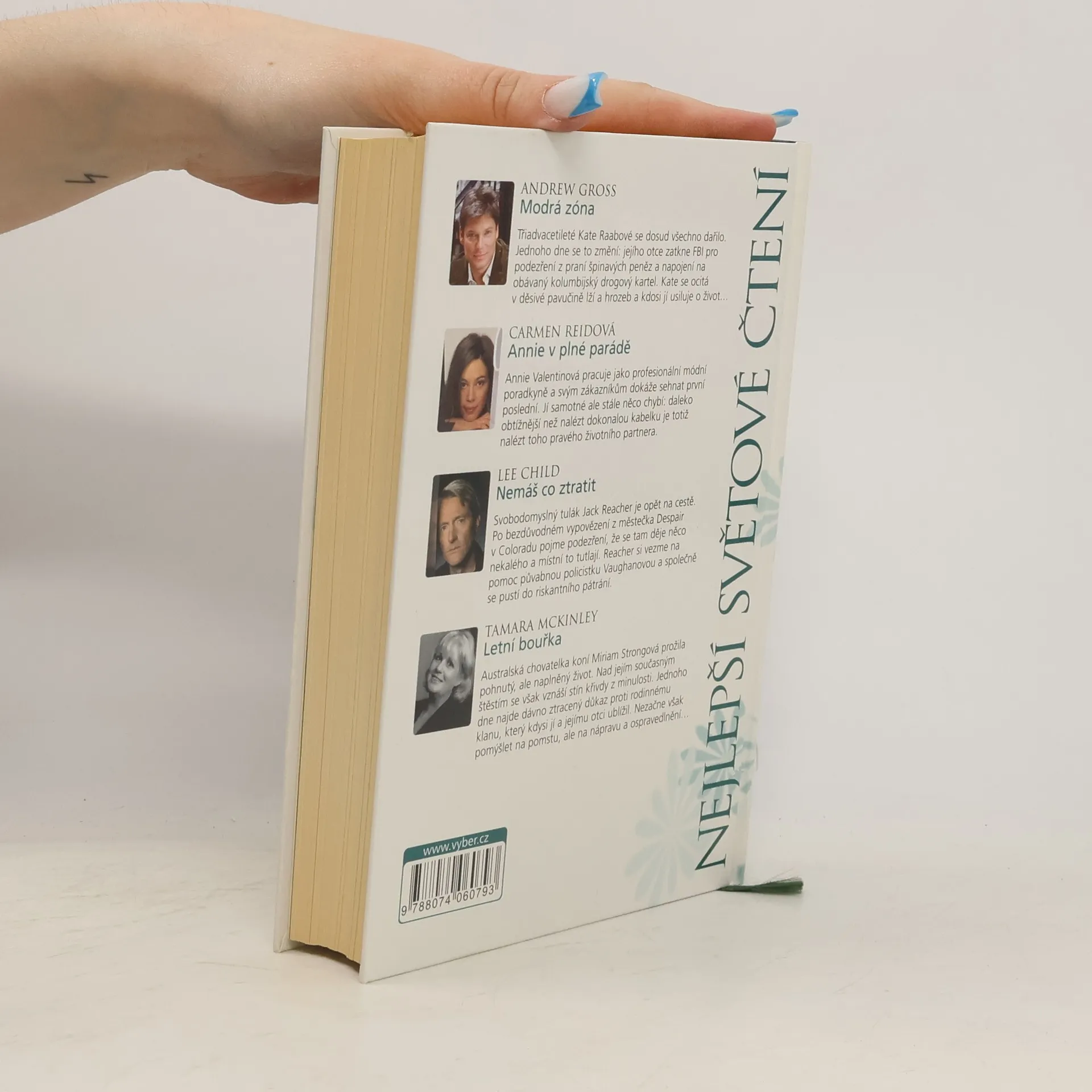 Svazek obsahuje zkrácené verze čtyř úspěšných románů oddychových žánrů od renomovaných angloamerických autorů. Jednotlivé tituly jsou doplněny stručnými informacemi o jejich tvůrcích. 1) Andrew Gross: Modrá zóna - Třiadvacetileté Kate Raabové se dosud všechno dařilo. Jednoho dne se to změní. Jejího otce zatkne FBI pro podezření z praní špinavých peněz a napojení na obávaný kolumbijský drogový kartel. Kate se ocitá v děsivé pavučině lží a hrozeb a kdosi jí usiluje o život ... 2) Carmen Reidová: Annie v plné parádě - Annie Valentinová pracuje jako profesionální módní poradkyně a svým zákazníkům dokáže sehnat první poslední. Jí samotné ale stále něco chybí. Daleko obtížnější než nalézt dokonalou kabelku je totiž nalézt toho pravého životního partnera. 3) Lee Child: Nemáš co ztratit - Svobodomyslný tulák Jack Reacher je opět na cestě. Po bezdůvodném vypovězení z městečka Despair v Coloradu pojme podezření, že se tam děje něco nekalého a místní to tutlají. Reacher si vezme na pomoc půvabnou policistku Vaughanovou a společně se pustí do riskantního pátrání. 4) Tamara McKinley: Letní bouřka - Australská chovatelka koní Miriam Strongová prožila pohnutý, ale naplněný život. Nad jejím současným štěstím se však vznáší stín křivdy z minulosti. Jednoho dne najde dávno ztracený důkaz proti rodinnému klanu, který kdysi jí a jejímu otci ublížil. Nezačne však pomýšlet na pomstu, ale na nápravu a ospravedlnění ...