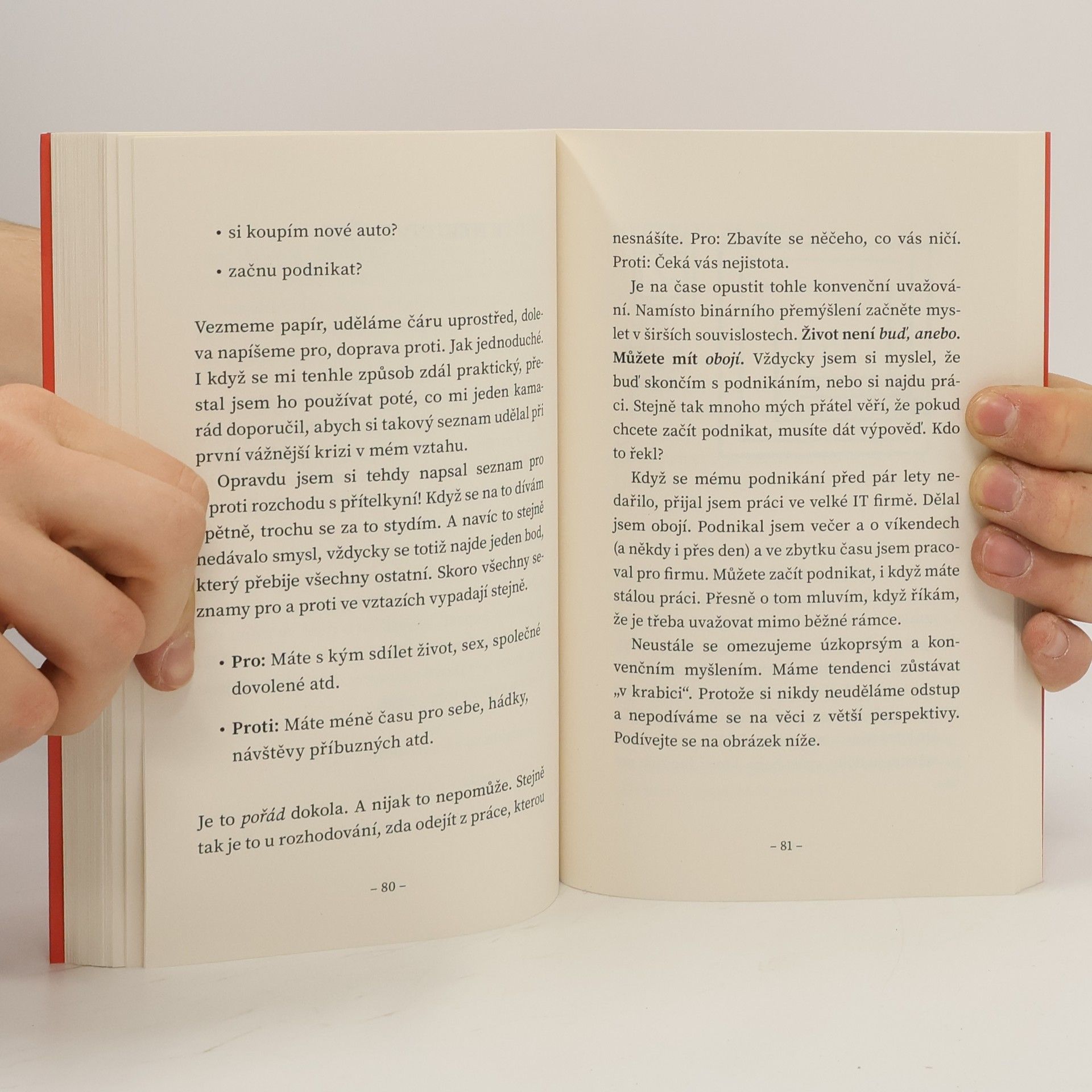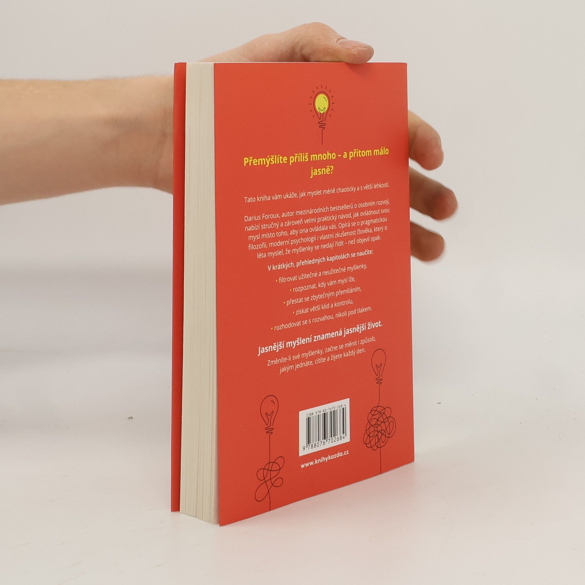 Mysli jasně! je stručný a praktický průvodce, který ukazuje, jak nahradit mentální chaos jasností a použít mysl jako nástroj, nikoli jako zdroj stresu. Darius Foroux propojuje pragmatické principy, vlastní zkušenosti i moderní výzkumy a nabízí jasné a funkční postupy, díky nimž dokážete lépe pracovat se svými myšlenkami. Tato kniha vám ukáže, jak myslet méně chaoticky a víc efektivně. Foroux odhaluje, odkud pramení náš mentální neklid, a dává konkrétní návody, jak převzít kontrolu nad svým myšlením i každodenními rozhodnutími. V krátkých, přehledných kapitolách vás naučí: filtrovat užitečné a neužitečné myšlenky, rozpoznat, kdy vám mysl škodí, získat větší klid a nadhled, rozhodovat se s větší jistotou. Jasnější myšlení znamená jasnější život. Mysli jasně! vás naučí přemýšlet způsobem, který vede k lepšímu prožívání všedních dní.