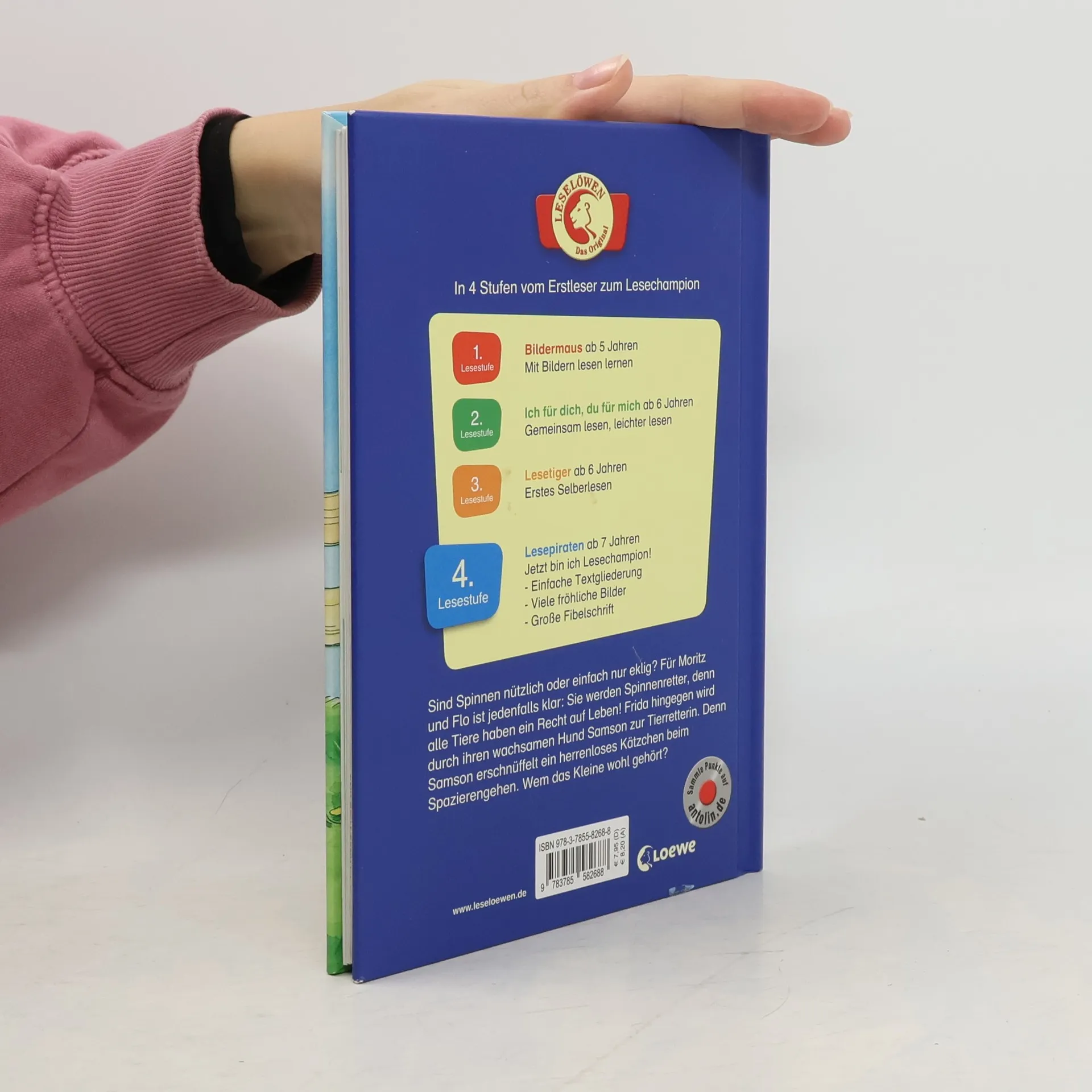 Sind Spinnen nützlich oder einfach nur eklig? Für Moritz und Flo ist jedenfalls klar: Sie werden Spinnenretter, denn alle Tiere haben ein Recht auf Leben! Frida dagegen wird durch ihren wachsamen Hund Samson zur Tierretterin. Denn Samson erschnüffelt ein herrenloses Kätzchen beim Spazierengehen. Wem das Kleine wohl gehört? Durch kurze, einfache Sätze in Fibelschrift und Großbuchstaben können Kinder ab 7 Jahren (1/2 Klasse) mit den Geschichten der 4. Lesestufe Lesepiraten lesen lernen. Die vielen bunten Bilder im Kinderbuch tragen zusätzlich zum Textverständnis bei. So macht Lesen Spaß! Mehr über die Leselöwen, spannende Spiele und Leseproben unter www.leseloewen.de