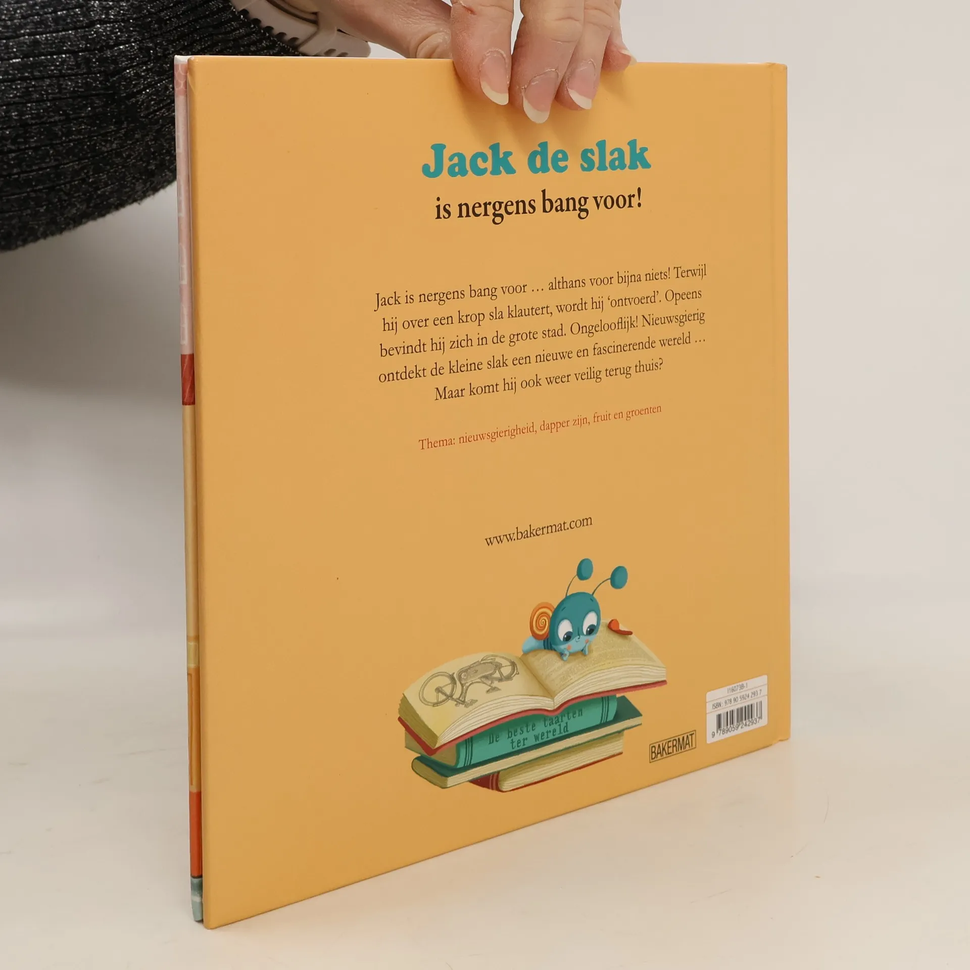Jack de slak komt per ongeluk via een krop sla in de stad terecht. Daar sluit hij vriendschap met Max de hond, die hem de stad laat zien. Vierkant prentenboek met vrolijke kleurenillustraties. Vanaf ca. 4 jaar.