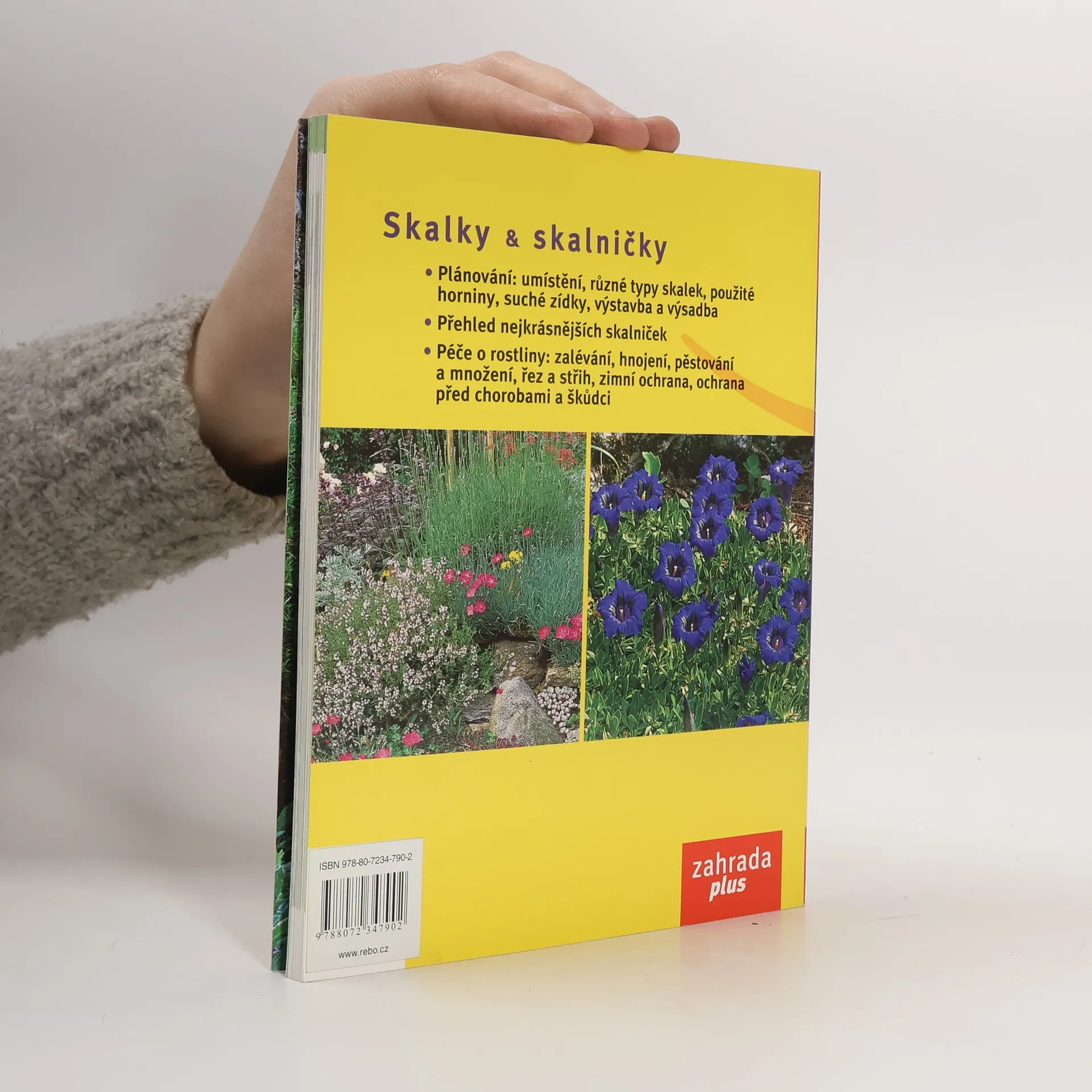 Plánování skalky, různé typy skalek a jejich umístění, použité horniny, suché zídky, výsadba, přehled nejkrásnějších skalniček, péče o rostliny, zalévání , hnojení, množení, řez a střih, ochrana rostlin Bohatá fotodokumentace