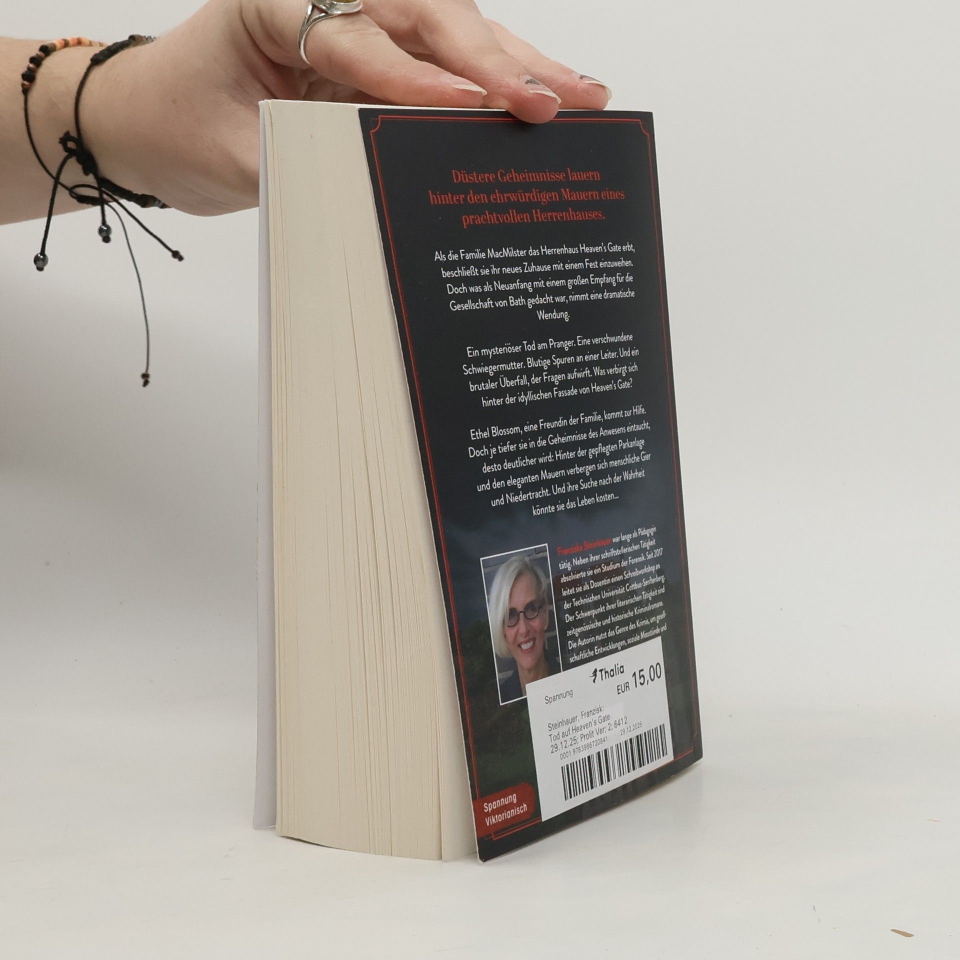Als die Familie MacMilster das Herrenhaus Heaven´s Gate erbt, beschließen sie ihr neues Zuhause mit einem Fest einzuweihen. Doch was als Neuanfang mit einem großen Empfang für die Gesellschaft von Bath gedacht war, nimmt eine dramatische Wendung. Ein mysteriöser Tod im Pranger. Eine verschwundene Schwiegermutter. Blutige Spuren an einer Leiter. Und ein brutaler Überfall, der Fragen aufwirft. Was verbirgt sich hinter der idyllischen Fassade von Heaven's Gate? Ethel Blossom, eine Freundin der Familie, kommt zur Hilfe. Doch je tiefer sie in die Geheimnisse des Anwesens eintaucht, desto deutlicher wird: Hinter der gepflegten Parkanlage und den eleganten Mauern verbergen sich Abgründe menschlicher Gier und Niedertracht. Und ihre Suche nach der Wahrheit könnte sie das Leben kosten...
