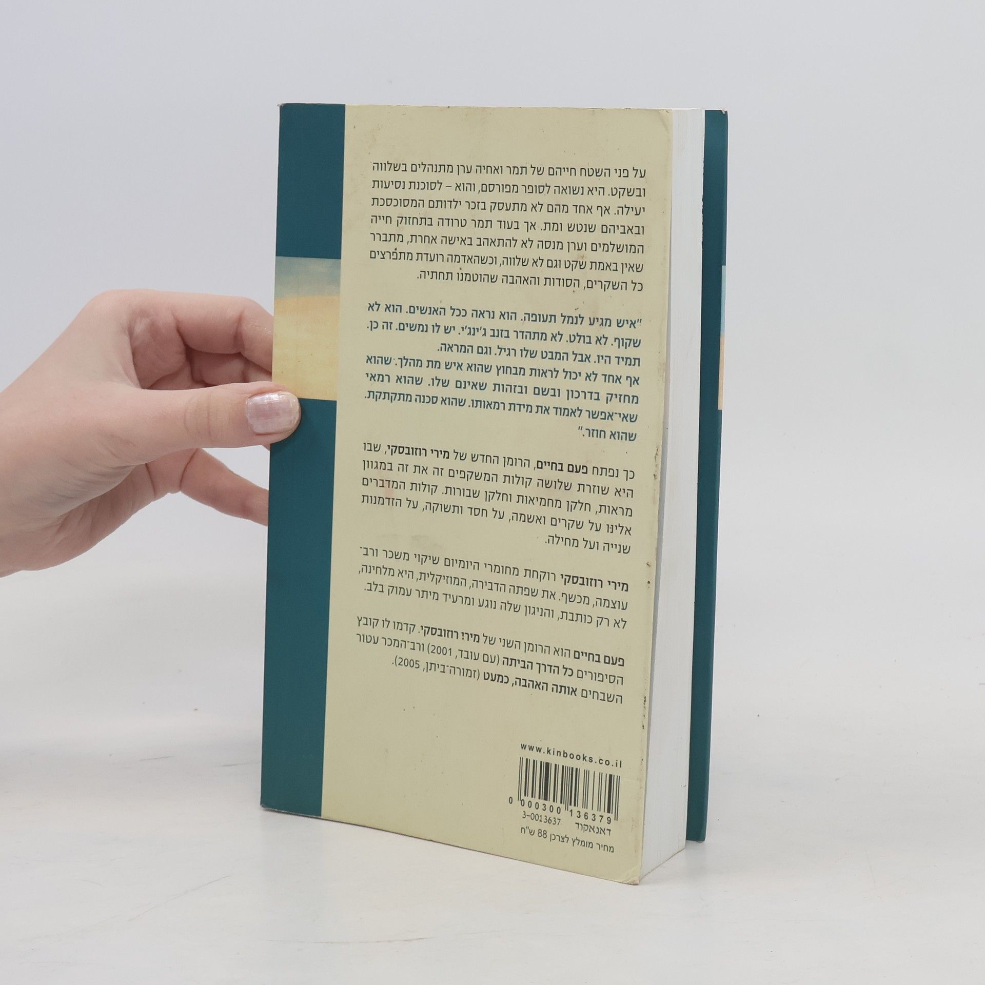 על פני השטח חייהם של תמר ואחיה ערן מתנהלים בשלווה ובשקט. היא נשואה לסופר מפורסם, והוא — לסוכנת נסיעות יעילה. אף אחד מהם לא מתעסק בזכר ילדותם המסוכסכת ובאביהם שנטש ומת. אך בעוד תמר טרודה בתחזוק חייה המושלמים וערן מנסה לא להתאהב באישה אחרת, מתברר שאין באמת שקט וגם לא שלווה, וכשהאדמה רועדת מתפרצים כל השקרים, הסודות והאהבה שהוטמנו תחתיה. "איש מגיע לנמל תעופה. הוא נראה ככל האנשים. הוא לא שקוף. לא בולט. לא מתהדר בזנב ג'ינג'י. יש לו נמשים. זה כן. תמיד היו. אבל המבט שלו רגיל. וגם המראה. אף אחד לא יכול לראות מבחוץ שהוא איש מת מהלך. שהוא מחזיק בדרכון ובשם ובזהות שאינם שלו. שהוא רמאי שאי־אפשר לאמוד את מידת רמאותו. שהוא סכנה מתקתקת. שהוא חוזר." כך נפתח פעם בחיים, הרומן החדש של מירי רוזובסקי, שבו היא שוזרת שלושה קולות המשקפים זה את זה במגוון מראות, חלקן מחמיאות וחלקן שבורות. קולות המדברים אלינו על שקרים ואשמה, על חסד ותשוקה, על הזדמנות שנייה ועל מחילה. מירי רוזובסקי רוקחת מחומרי היומיום שיקוי משכר ורב־עוצמה, מכשף. את שפתה הדבירה, המוזיקלית, היא מלחינה, לא רק כותבת, והניגון שלה נוגע ומרעיד מיתר עמוק בלב. פעם בחיים הוא הרומן השני של מירי רוזובסקי. קדמו לו קובץ הסיפורים כל הדרך הביתה (עם עובד, 2001) ורב־המכר עטור השבחים אותה האהבה, כמעט (זמורה־ביתן, 2005).
