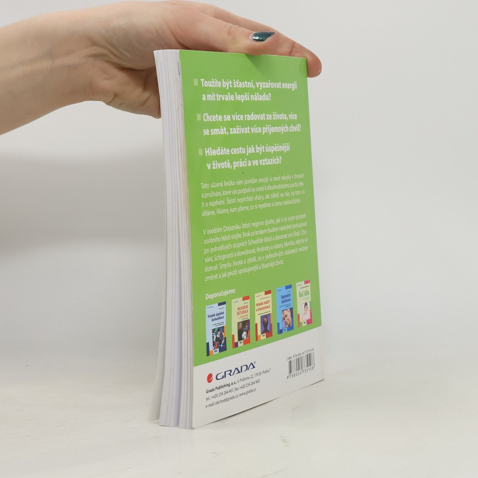 Také toužíte být šťastní, vyzařovat energii a mít trvale lepší náladu? Více se radovat ze života, více se smát, zažívat více příjemných chvil, být úspěšnější v životě, práci a ve vztazích? Tato úžasná knížka vám pomůže osvojit si nové návyky v chování a prožívání, které vás podpoří na cestě k dlouhodobému pocitu štěstí a naplnění. Štěstí nepřichází shůry, ale záleží na nás, na tom, co děláme, říkáme, kam jdeme, co si myslíme a čemu nasloucháme. V úvodním Dotazníku štěstí nejprve zjistíte, jak si se svým pocitem osobního štěstí stojíte. Krok za krokem budete následně postupovat po jednotlivých stupních Schodiště štěstí a zkoumat své Okolí, Chování, Schopnosti a dovednosti, Hodnoty a názory, Identitu, abyste se dobrali Smyslu života a zjistili, co v jednotlivých oblastech můžete změnit a jak prožít spokojenější a šťastnější život.