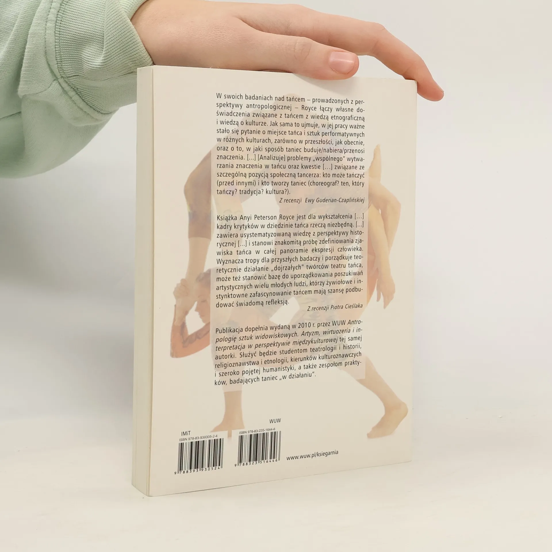 Jest to pozycja ?założycielska? dla nowoczesnego myślenia o tańcu. Będzie stanowić znakomitą całość z inną książką tej samej autorki ?Antropologią sztuk performatywnych. Artyzm, wirtuozeria i interprtacja w perspektywie międzykulturowej ?, opublikowaną wcześniej przez Wydawnictwa Uniwersytetu Warszawskiego. W swoich badaniach nad tańcem, prowadzonych z perspektywy antropologicznej, Royce łączy własne doświadczenia, związane z tańcem, z wiedzą etnograficzną i wiedzą o kulturze, co pozwala jej sytuować taniec w obrębie innych sztuk performatywnych. Podręcznik ten powinien służyć studentom teatrologii i historii, studentom etnologii, zgłębiającym problematykę rytuałów i obrzędów środkowoamerykańskich, studentom kierunków kulturoznawczych i szeroko pojętej humanistyki, a także zespołom praktyków, badającym taniec ?w działaniu? (instruktorom, tancerzom, choreografom), specjalistom od terapii tańcem, neurobiologom. Publikacja będzie znakomitym materiałem dydaktycznym ze względu na bogatą warstwę merytoryczną, a także przejrzystość, uporządkowanie, prostotę wykładu. Uzupełni ciągle zbyt skromne polskie (i polskojęzyczne) zbiory prac na temat tańca.