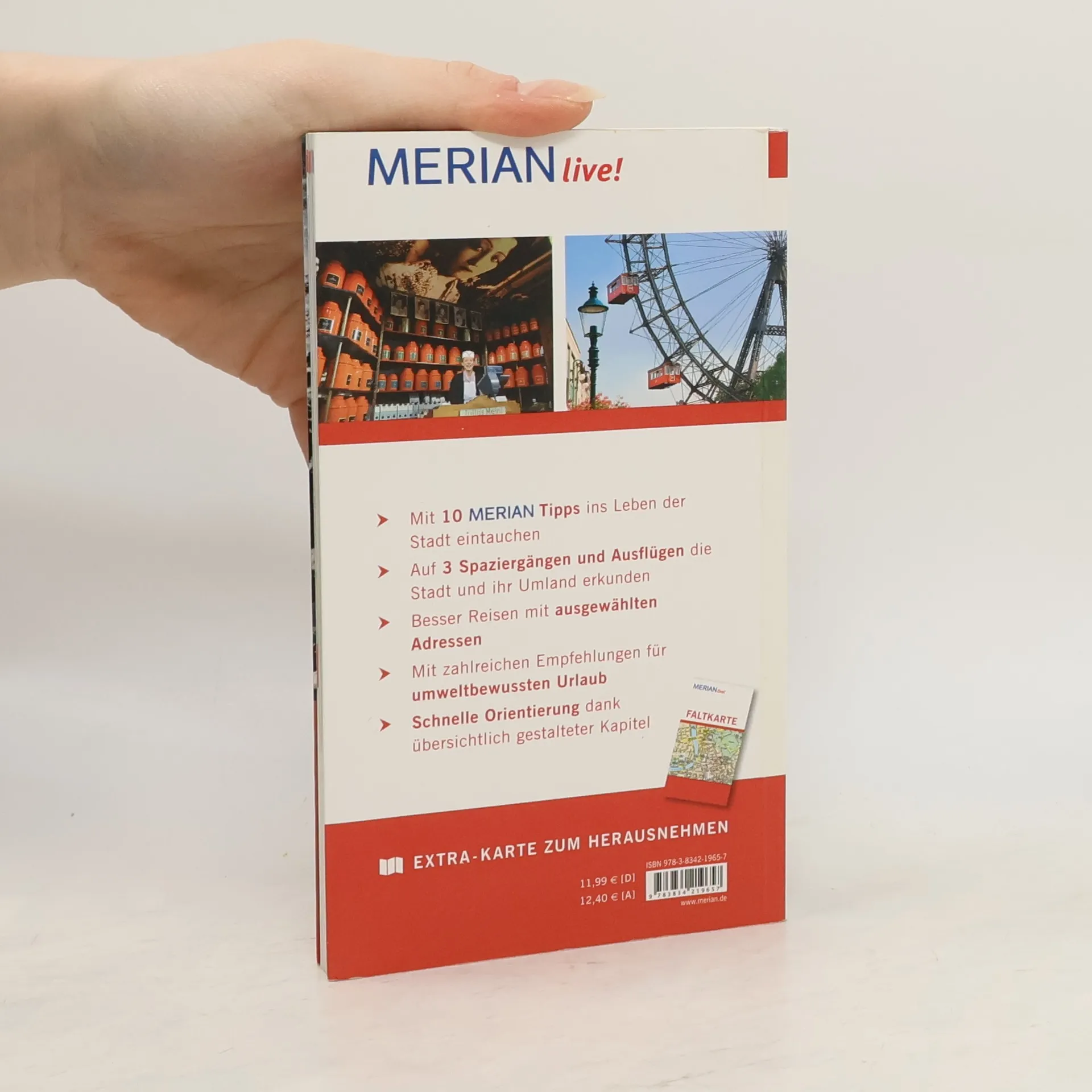 „Leiwand“ ist Wienerisch und bedeutet „toll“ - und diese Bezeichnung trifft auf Österreichs einzige Metropole mit Sicherheit zu. Der schräge Mix von Originalen, Museen, Musik und Gastronomie ist die Seele der Stadt. Würstelstand oder Haubenlokal? Musikvereinssaal oder Gemüseorchester? Caféhaus oder Museumsquartier? Designermode oder Hofreitschule? Wer eine Auszeit braucht, findet Erholung im Wienerwald und genießt Natur und Heurigen. Kompakt und übersichtlich bietet MERIAN live! alles Wissenswerte für einen gelungenen Aufenthalt in Wien: - MERIAN-TopTen: Die 10 wichtigsten Sehenswürdigkeiten auf einen Blick - MERIAN-TopTen 360°: Umgebungskarten mit ausgewählten MERIAN-TopTen und umliegenden Kultur-, Restaurant- und Shoppingadressen - Mit 10 MERIAN-Tipps die weniger bekannten Seiten der Stadt entdecken - FotoTipps für lohnenswerte Motive - Fundierte Beschreibungen aller wichtigen Orte, Sehenswürdigkeiten und Museen von A bis Z - Empfehlungen für Übernachten, Essen und Trinken, Einkaufen, Ausgehen sowie Tipps für den umweltbewussten Urlaub - Zahlreiche Ideen für abwechslungsreiches Reisen mit Kindern - Mit praktischer Extra-Karte zum Herausnehmen
