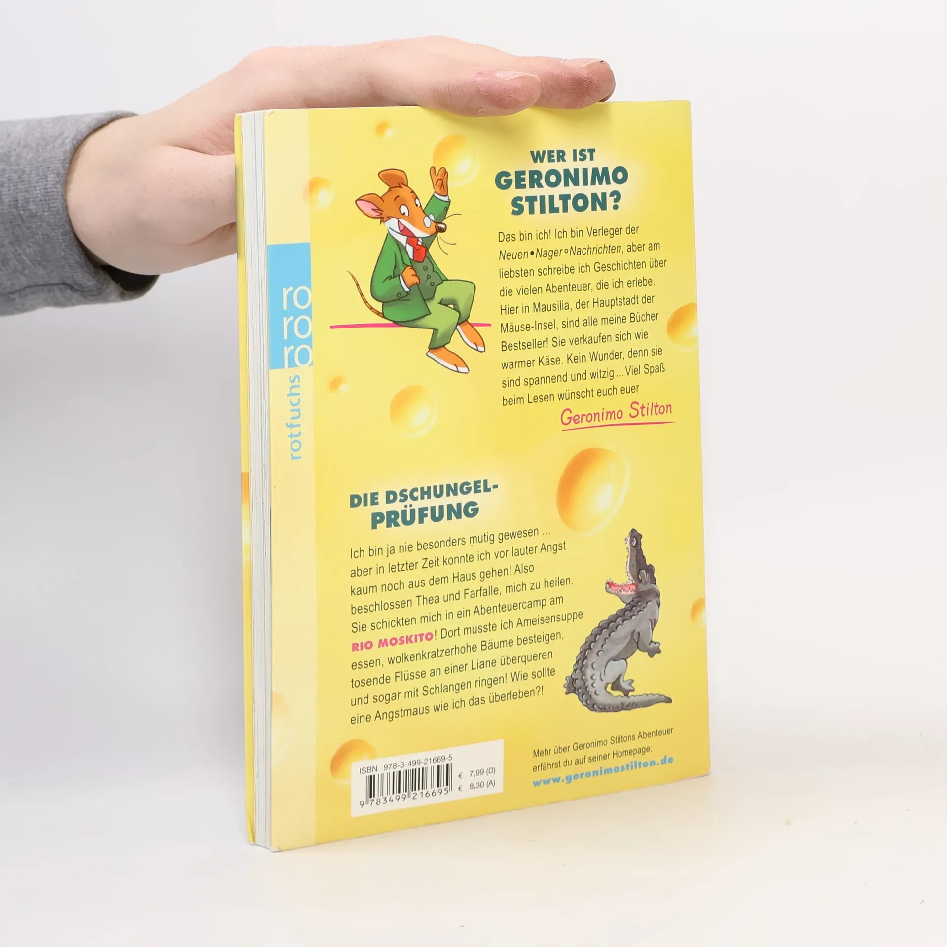 Ich bin nie besonders mutig gewesen... aber in letzter Zeit konnte ich vor lauter Angst kaum noch aus dem Haus gehen. Also beschlossen Thea und Farfalle, mich zu heilen. Sie zerrten mich in ein Flugzeug (ich habe Flugangst!) und flogen mich in den Dschungel. Dort musste ich Käfersuppe essen, wolkenkratzerhohe Bäume besteigen, tobende Flüsse durchschwimmen und sogar mit Schlangen ringen! Wie sollte eine Angstmaus wie ich das überleben?! Mehr über Geronimo Stiltons Abenteuer erfährst du auf seiner Homepage: www.geronimostilton.de