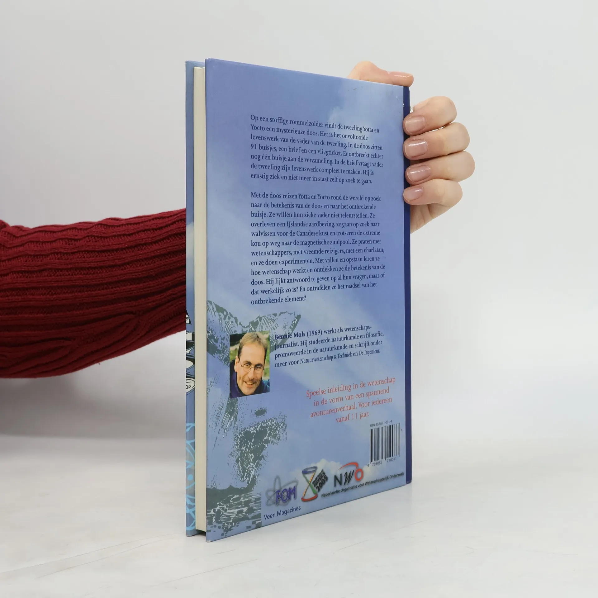 Een speelse inleiding in de wetenschap in de vorm van een spannend avonturenverhaal. Vanaf 11 jaar. Op een stoffige rommelzolder vindt de tweeling Yotta en Yocto een mysterieuze doos. Het is het onvoltooide levenswerk van de vader van de tweeling. In de doos zitten 91 buisjes, een brief en een vliegticket. Er ontbreekt echter nog één buisje aan de verzameling. In de brief vraagt vader de tweeling zijn levenswerk compleet te maken. Hij is ernstig ziek en niet meer in staat zelf op zoek te gaan. Met de doos reizen Yotta en Yocto rond de wereld op zoek naar de betekenis van de doos en naar het ontbrekende buisje. Ze willen hun zieke vader niet teleurstellen. Ze overleven een IJslandse aardbeving, ze gaan op zoek naar walvissen voor de Canadese kust en trotseren de extreme kou op weg naar de magnetische zuidpool. Ze praten met wetenschappers (onder andere bij het CERN), met vreemde reizigers, met een charlatan, en ze doen experimenten. Met vallen en opstaan leren ze hoe wetenschap werkt en ontdekken ze de betekenis van de doos. Hij lijkt antwoord te geven op al hun vragen, maar of dat werkelijk zo is? En ontrafelen ze het raadsel van het ontbrekende element? Bennie Mols (1969) werkt als wetenschapsjournalist. Hij studeerde natuurkunde en filosofie, promoveerde in de natuurkunde en schrijft onder meer voor Natuurwetenschap & Techniek en De Ingenieur.