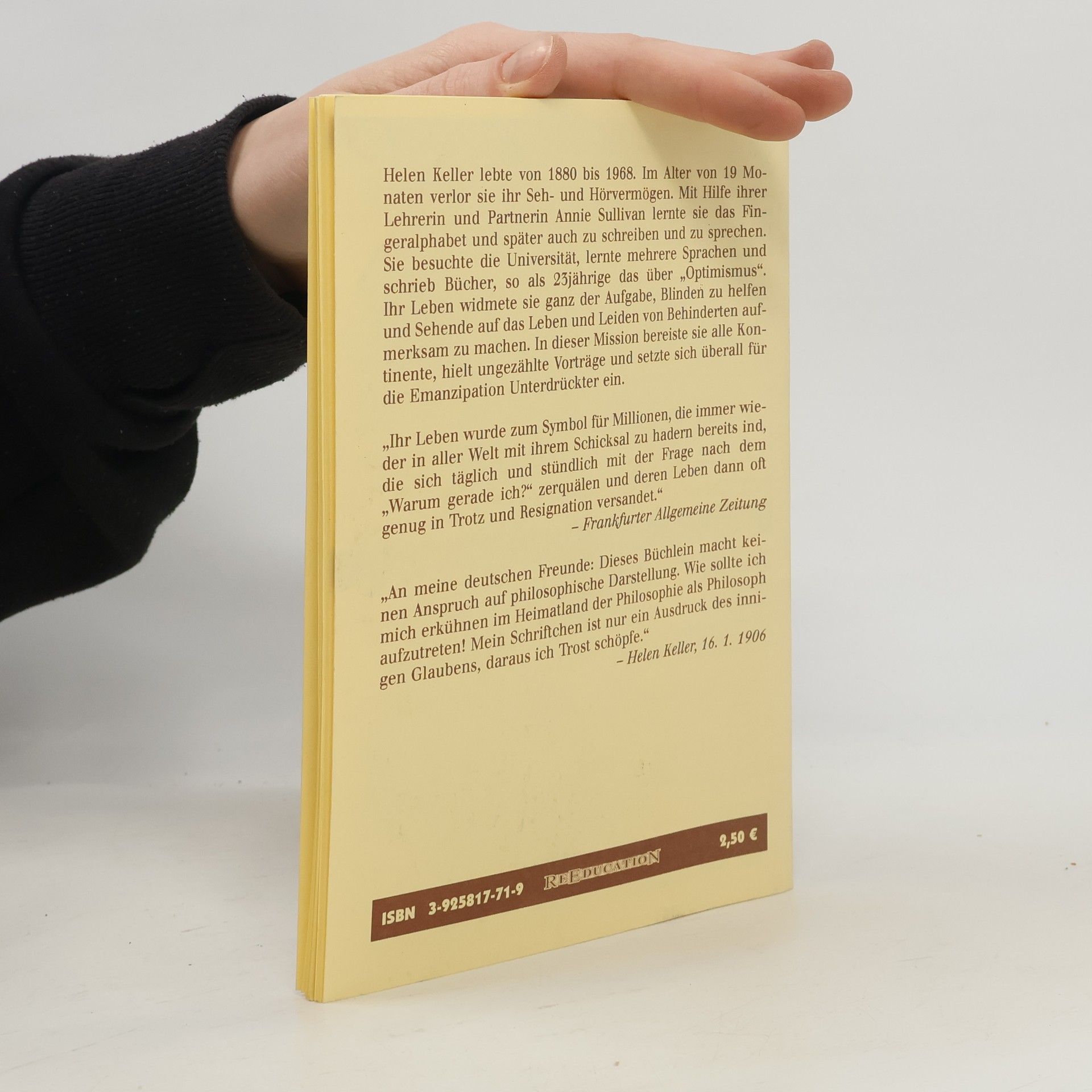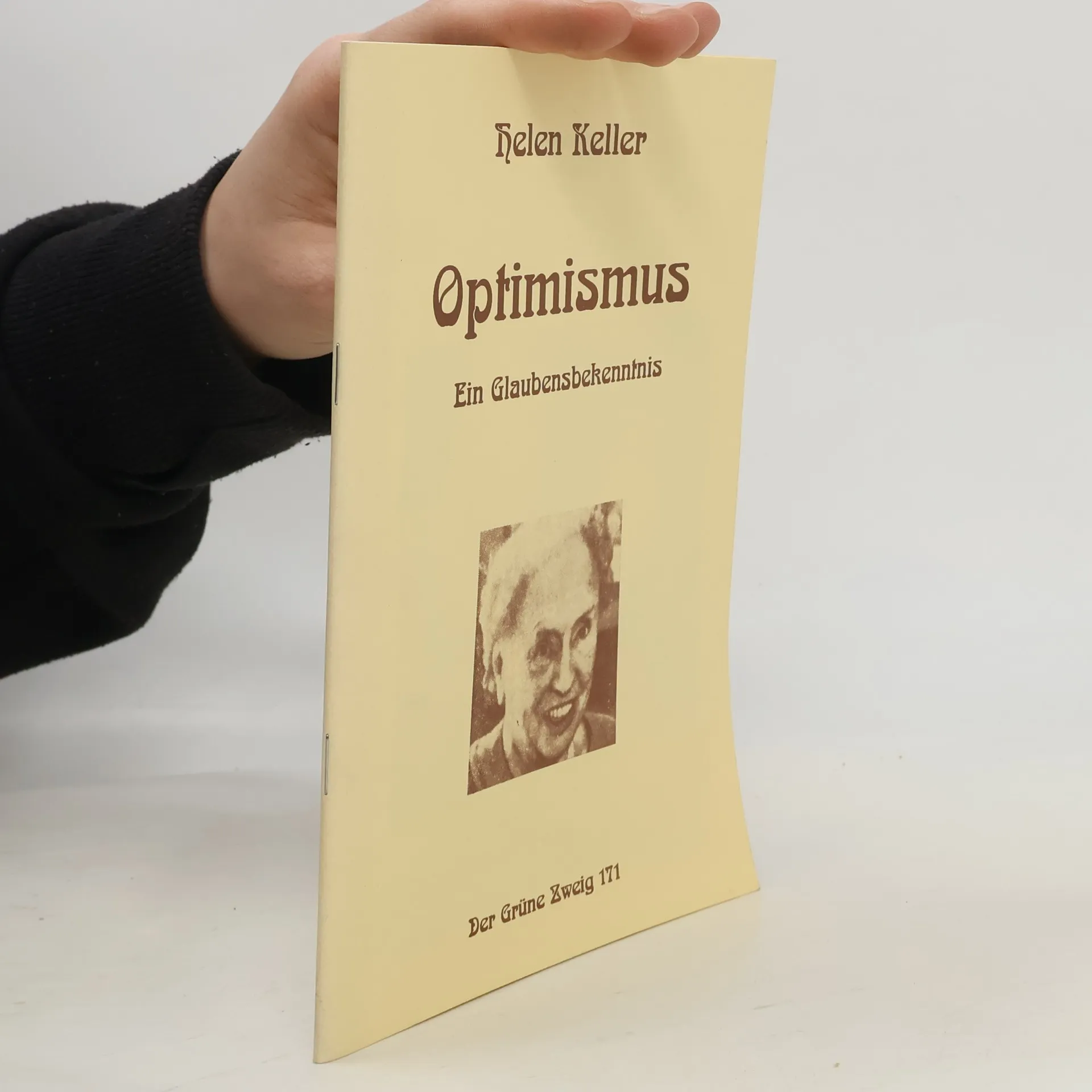 Helen Keller lebte von 1880 bis 1968 und verlor im Alter von 19 Monaten ihr Seh- und Hörvermögen. Mit Unterstützung ihrer Lehrerin Annie Sullivan lernte sie das Fingeralphabet sowie das Schreiben und Sprechen. Sie besuchte die Universität, erlernte mehrere Sprachen und verfasste Bücher, darunter mit 23 Jahren ein Werk über „Optimismus“. Ihr Leben widmete sie der Hilfe für Blinde und der Sensibilisierung der Sehenden für das Leben und Leiden von Menschen mit Behinderungen. In dieser Mission bereiste sie alle Kontinente, hielt zahlreiche Vorträge und setzte sich für die Emanzipation Unterdrückter ein. Der Inhalt umfasst Themen wie inneren, äußeren und praktischen Optimismus. Christoph Wolff beschreibt Kellers Leben als Symbol für Millionen, die mit ihrem Schicksal kämpfen und oft in Trotz und Resignation versinken. Keller selbst äußerte, dass ihr Werk keinen Anspruch auf philosophische Tiefe erhebt, sondern lediglich Ausdruck ihres Glaubens ist, aus dem sie Trost schöpft. Dieser Titel ist Teil der Grünen Zweige NR 171 aus Werner Piepers Medien-Experimenten The Grüne Kraft.
