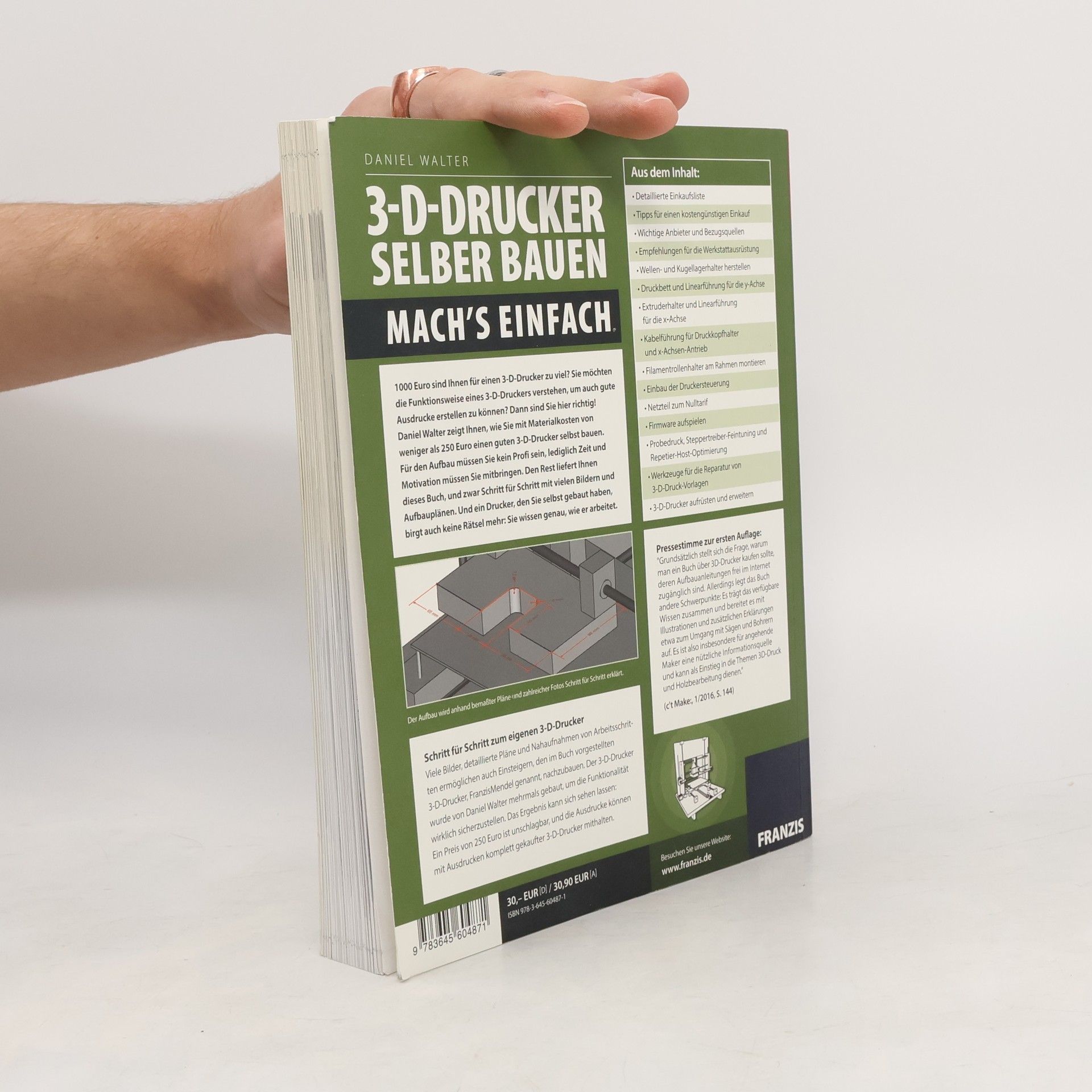 1000 Euro für einen 3D-Drucker sind Ihnen zu viel? Sie möchten die Funktionsweise eines 3D-Druckers verstehen und gute Ausdrucke erstellen? Daniel Walter zeigt Ihnen, wie Sie mit Materialkosten von weniger als 250 Euro einen eigenen 3D-Drucker bauen können. Für den Aufbau sind keine Profi-Kenntnisse erforderlich, lediglich Zeit und Motivation. Dieses Buch bietet Ihnen eine Schritt-für-Schritt-Anleitung mit vielen Bildern und detaillierten Plänen. Ein selbstgebauter Drucker bringt Ihnen das nötige Wissen über seine Funktionsweise. Die Anleitung ermöglicht auch Einsteigern, den im Buch vorgestellten 3D-Drucker, FranzisMendel, nachzubauen. Walter hat den Drucker mehrfach getestet, um die Funktionalität zu gewährleisten. Das Ergebnis ist beeindruckend: Bei einem Preis von 250 Euro können die Ausdrucke mit denen von teureren, komplett gekauften 3D-Druckern mithalten. Im Buch finden Sie eine detaillierte Einkaufsliste, Tipps für kostengünstige Beschaffungen, wichtige Anbieter und Bezugsquellen sowie Empfehlungen zur Werkstattausrüstung. Es werden Anleitungen zur Herstellung von Wellen- und Kugellagerhaltern, zur Einrichtung des Druckbetts und der Linearführungen, zur Kabelführung und zum Einbau der Druckersteuerung gegeben. Außerdem werden Firmware-Installation, Probedruck, Steppertreiber-Feintuning und Werkzeuge zur Reparatur von 3D-Druck-Vorlagen behandelt.