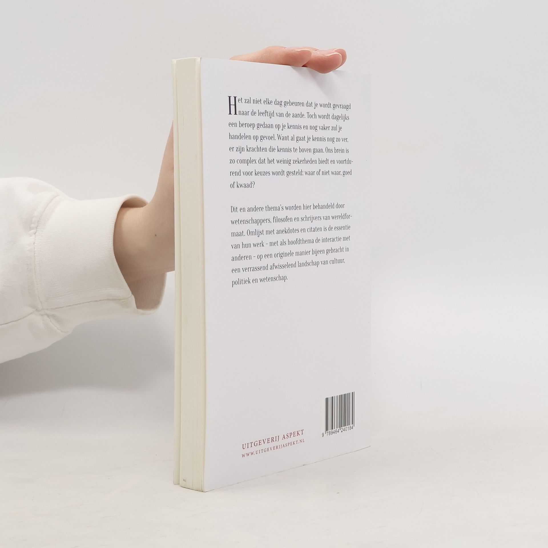 Het zal niet elke dag gebeuren dat je wordt gevraagd naar de leeftijd van de aarde. Toch wordt dagelijks een beroep gedaan op je kennis en nog vaker zul je handelen op gevoel. Want al gaat je kennis nog zo ver, er zijn krachten die kennis te boven gaan. Ons brein is zo complex dat het weinig zekerheden biedt en voortdurend voor keuzes wordt gesteld: waar of niet waar, goed of kwaad? Dit en andere thema’s worden hier behandeld door wetenschappers, filosofen en schrijvers van wereldformaat. Omlijst met anekdotes en citaten is de essentie van hun werk - met als hoofdthema de interactie met anderen - op een originele manier bijeen gebracht in een verrassend afwisselend landschap van cultuur, politiek en wetenschap.