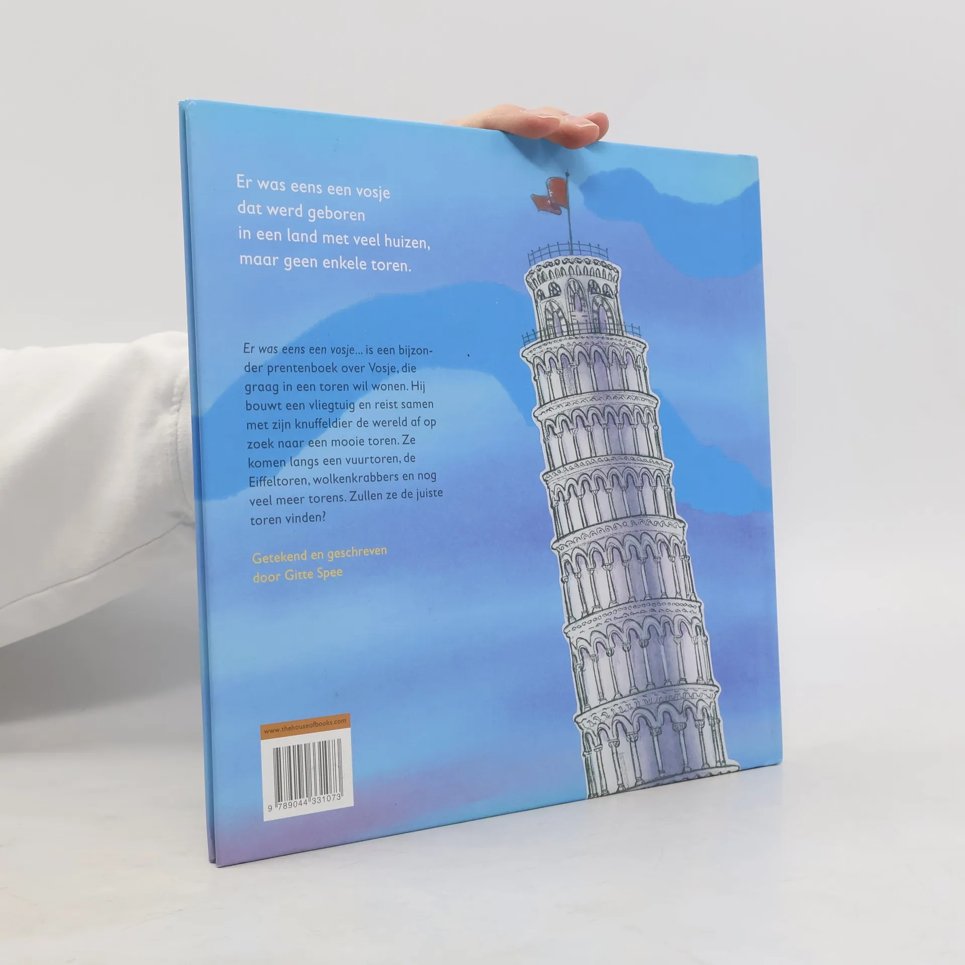 Vosje is geboren in een land met veel huizen, maar geen enkele toren. Hij bouwt een vliegtuig en reist samen met zijn knuffelbeer de wereld af op zoek naar een mooie toren om in te wonen. Ze komen langs een vuurtoren, de Eiffeltoren, wolkenkrabbers en nog veel meer torens. Zullen ze de juiste toren vinden of gaan ze toch liever maar naar huis? Een heerlijk boek over torens, maar ook over zoeken en vinden. Gitte Spee creëert in elk van haar boeken een volledig nieuw universum.