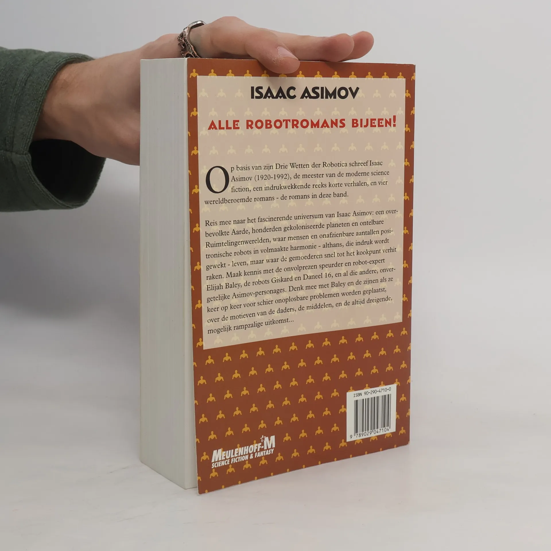 This book contains:1. The Caves of Steel (1953)2. The Naked Sun (1957)3. The Robots of Dawn (1983)4. Robots and Empire (1985)Dit boek bevat:1. De Stalen Holen2. De Blote Zon3. De Robots van de Dageraad4. Robots en ImperiumOp basis van zijn Drie Wetten der Robotica schreef Isaac Asimov (1920-1992), de meester van de moderne science fiction, een indrukwekkende reeks korte verhalen, en vier wereldberoemde romans - de romans in deze band.Reis mee naar het fascinerende universum van Isaac Asimov: een overbevolkte Aarde, honderden gekoloniseerde planeten en ontelbare Ruimtelingenwerelden, waar mensen en onafzienbare aantallen positronische robots in volmaakte harmonie - althans, die indruk wordt gewekt - leven, maar waar de gemoederen snel tot het kookpunt verhit raken. Maak kennis met de onvolprezen speurder en robot-expert Elijah Baley, de robots Giskard en Daneel 16, en al die andere, onvergetelijke Asimov-personages. Denk mee met Baley en de zijnen als ze keer op keer voor schier onoplosbare problemen worden geplaatst, over de motieven van de daders, de middelen, de altijd dreigende, mogelijk rampzalige uitkomst...