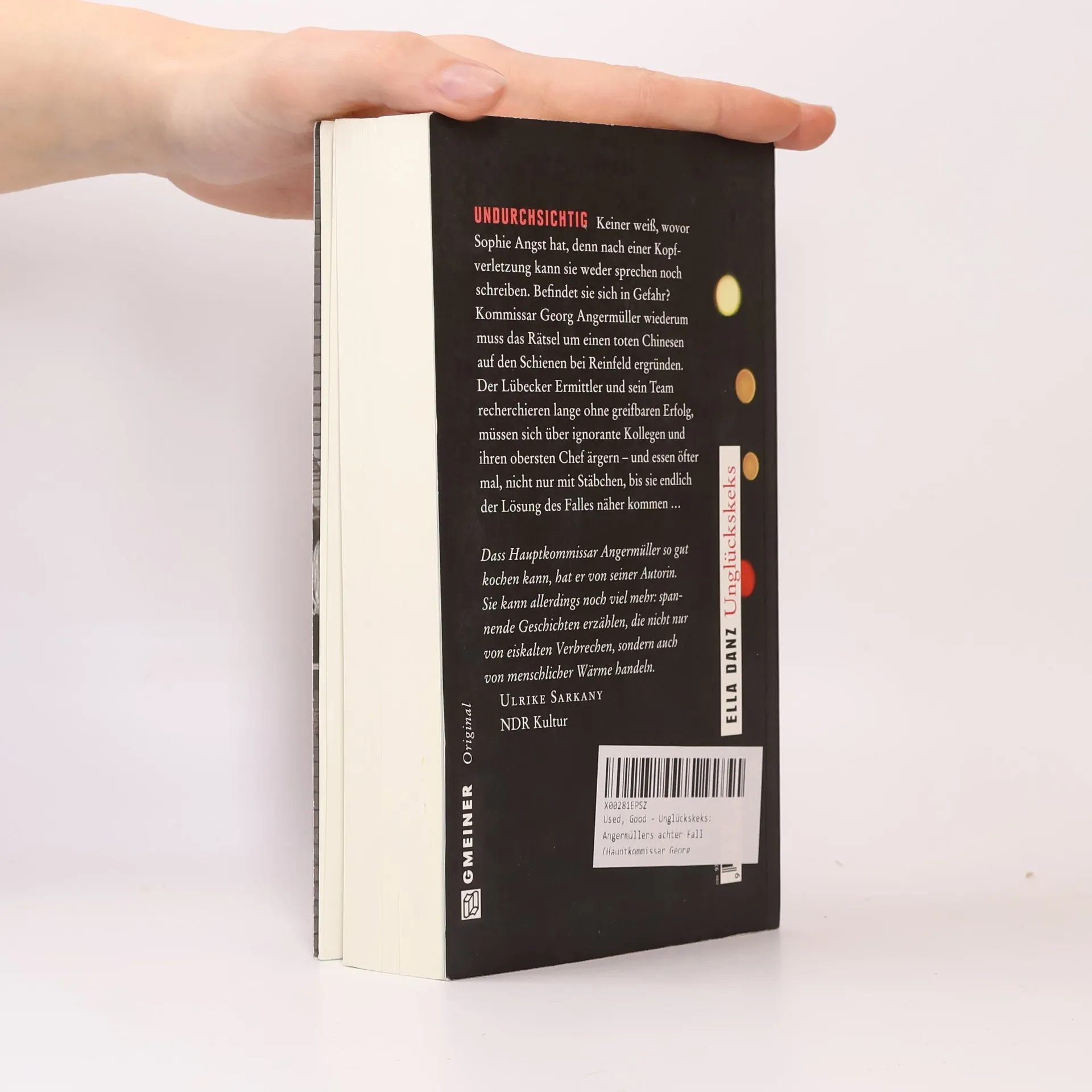 Keiner weiß, wovor Sophie Angst hat, denn nach einer Kopfverletzung kann sie weder sprechen noch schreiben. Befindet sie sich in Gefahr? Kommissar Georg Angermüller wiederum muss das Rätsel um einen toten Chinesen auf den Schienen bei Reinfeld ergründen. Der Lübecker Ermittler und sein Team recherchieren lange ohne greifbaren Erfolg, müssen sich über ignorante Kollegen und ihren obersten Chef ärgern - und essen öfter mal, nicht nur mit Stäbchen, bis sie endlich der Lösung des Falles näher kommen …