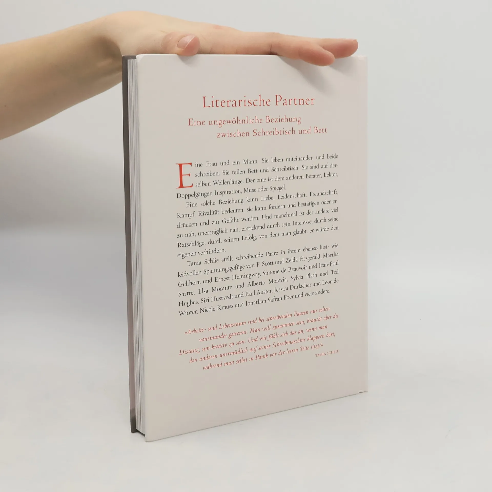 Eine Frau und ein Mann. Sie leben miteinander, und beide schreiben. Sie teilen Bett und Schreibtisch. Sie sind auf derselben Wellenlänge. Der eine ist dem anderen Berater, Lektor, Doppelgänger, Inspiration, Muse oder Spiegel. Eine solche Beziehung kann Liebe, Leidenschaft, Freundschaft, Kampf, Rivalität bedeuten, sie kann fördern und bestätigen oder erdrücken und zur Gefahr werden. Und manchmal ist der andere viel zu nah – durch sein Interesse, durch seine Ratschläge, durch seinen Erfolg, von dem man glaubt, er würde den eigenen verhindern. Und zu dem man vielleicht selbst beigetragen hat, auch wenn dieser Beitrag selten sichtbar wird. Tania Schlie stellt 28 schreibende Paare in ihrem ebenso lust- wie leidvollen Spannungsgefüge vor: F. Scott und Zelda Fitzgerald, Martha Gelhorn und Ernest Hemingway, Simone de Beauvoir und Jean-Paul Sartre, Elsa Morante und Alberto Moravia, Sylvia Plath und Ted Hughes, Siri Hustvedt und Paul Auster, Jessica Durlacher und Leon de Winter, Nicole Krauss und Jonathan Safran Foer und viele andere.