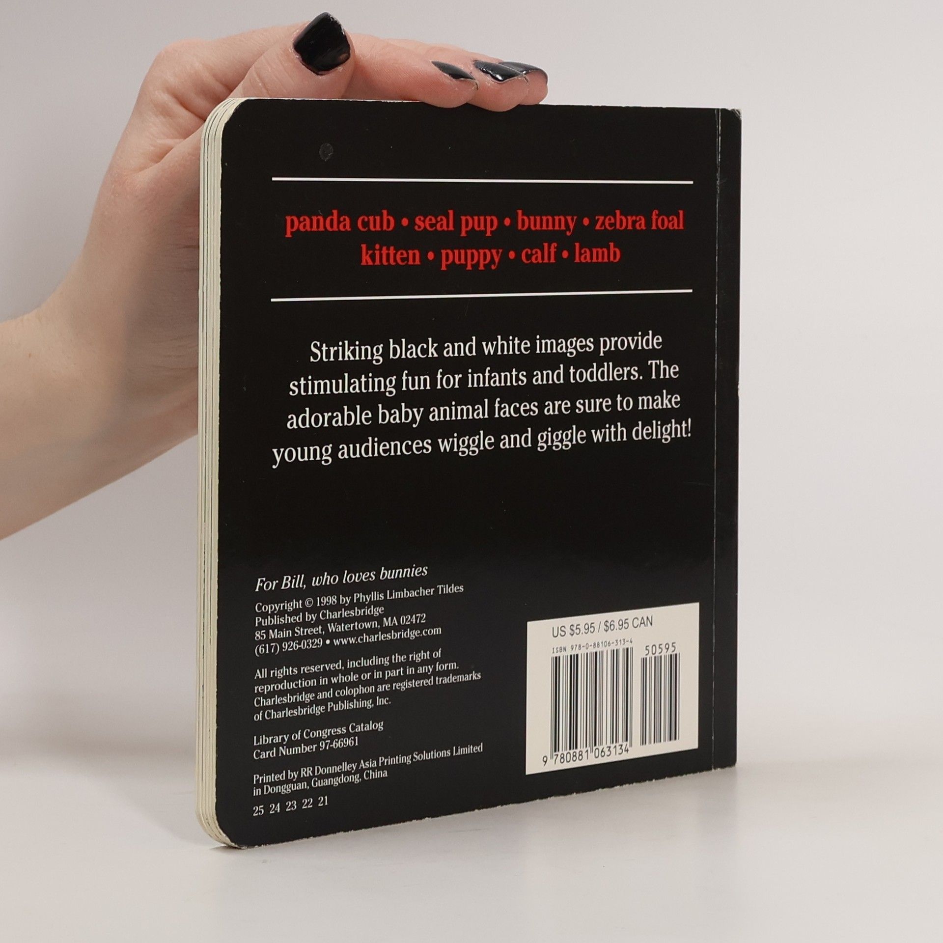 This charming, best-selling board book introduces eight adorable baby animals, featuring high-contrast black-and-white illustrations perfect for babies from birth to age two.Research has shown that infants respond more readily to contrasting black and white images, making this book an ideal choice for the youngest of eyes. Up-close images of a playful Dalmatian puppy, a cuddly panda cub, a striped zebra, and other loveable animals grace each page. A final two-page spread completes this charming book with a clever surprise.