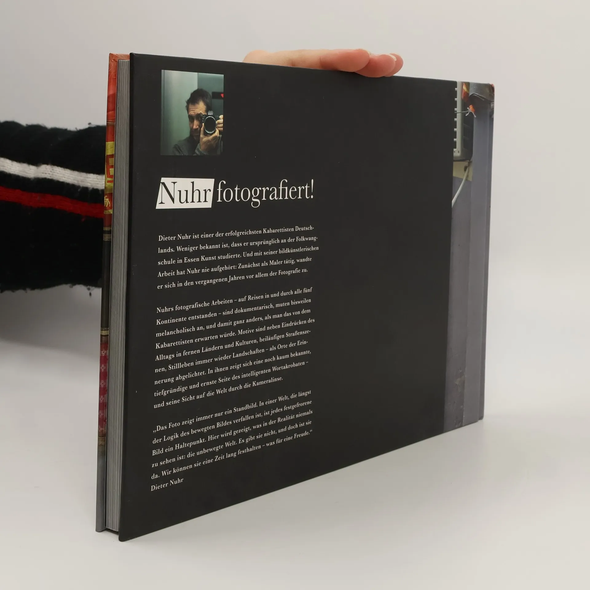 Dieter Nuhr ist einer der erfolgreichsten Kabarettisten Deutschlands. Weniger bekannt ist, dass er ursprünglich an der Folkwangschule in Essen Kunst studierte. Und mit seiner bildkünstlerischen Arbeit hat Nuhr nie aufgehört: Zunächst als Maler tätig, wandte er sich in den vergangenen Jahren vor allem der Fotografie zu. Nuhrs fotografische Arbeiten – auf Reisen in und durch alle fünf Kontinente entstanden – sind dokumentarisch, muten bisweilen melancholisch an, und damit ganz anders, als man das von dem Kabarettisten erwarten würde. Motive seiner Fotografien sind neben Eindrücken des Alltags in fernen Ländern und Kulturen, beiläufigen Straßenszenen, Stillleben immer wieder Landschaften – als Orte der Erinnerung abgelichtet. Nuhrs Fotokunst zeigt eine noch kaum bekannte, tiefgründige und ernste Seite des intelligenten Wortakrobaten – und seine Sicht auf die Welt durch die Kameralinse.