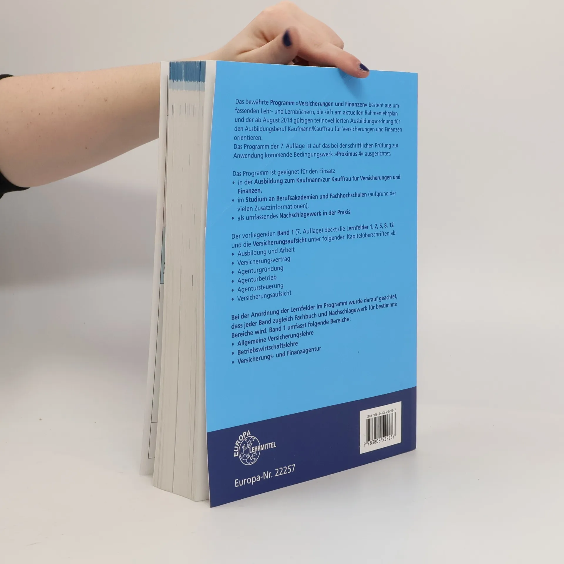 Dieses Lehr- und Lernbuch deckt den größten Teil der Lerninhalte des 1. Ausbildungsjahres als Kaufmann/frau für Versicherungen und Finanzen ab. Inhalt: Ausbildung und Arbeit; Versicherungsvertrag, Agenturgründung, Agenturbetrieb, Agentursteuerung, Versicherungsaufsicht Lernfelder 1, 2 und 5 (1. Ausbildungsjahr), 8 und teilweise 9 (2. Ausbildungsjahr) sowie 12 (3. Ausbildungsjahr) Band 1 deckt durch den inhaltlichen Aufbau den größten Teil der Lernfelder des 1. Ausbildungsjahres ab. Die Anschaffung der Bände 2 und 3 kann dadurch auf einen späteren Zeitpunkt verlegt werden. Die 7. Auflage der Buchreihe „Versicherungen und Finanzen“ ist durch folgende wesentlichen Aktualisierungen, Änderungen und inhaltlichen Ergänzungen gekennzeichnet: - Anpassung an das neue Bedingungswerk 4 „Proximus Versicherung“ - Neuregelungen im VVG, der VersVermV, dem VAG und der GewO aufgrund der Insurance Distribution Directive (IDD) - Einarbeitung der Datenschutzvorgaben durch die DSGVO - Änderungen/Erweiterungen im Rahmen der Versicherungsaufsicht durch das neue VAG - neu: Schaden- und Leistungsbearbeitung, dargestellt an Beispielfällen (für die Fachrichtung Versicherung gem. Rahmenlehrplan) - neu: Vermittlung von Finanzanlagen, dargestellt an Beispielfällen