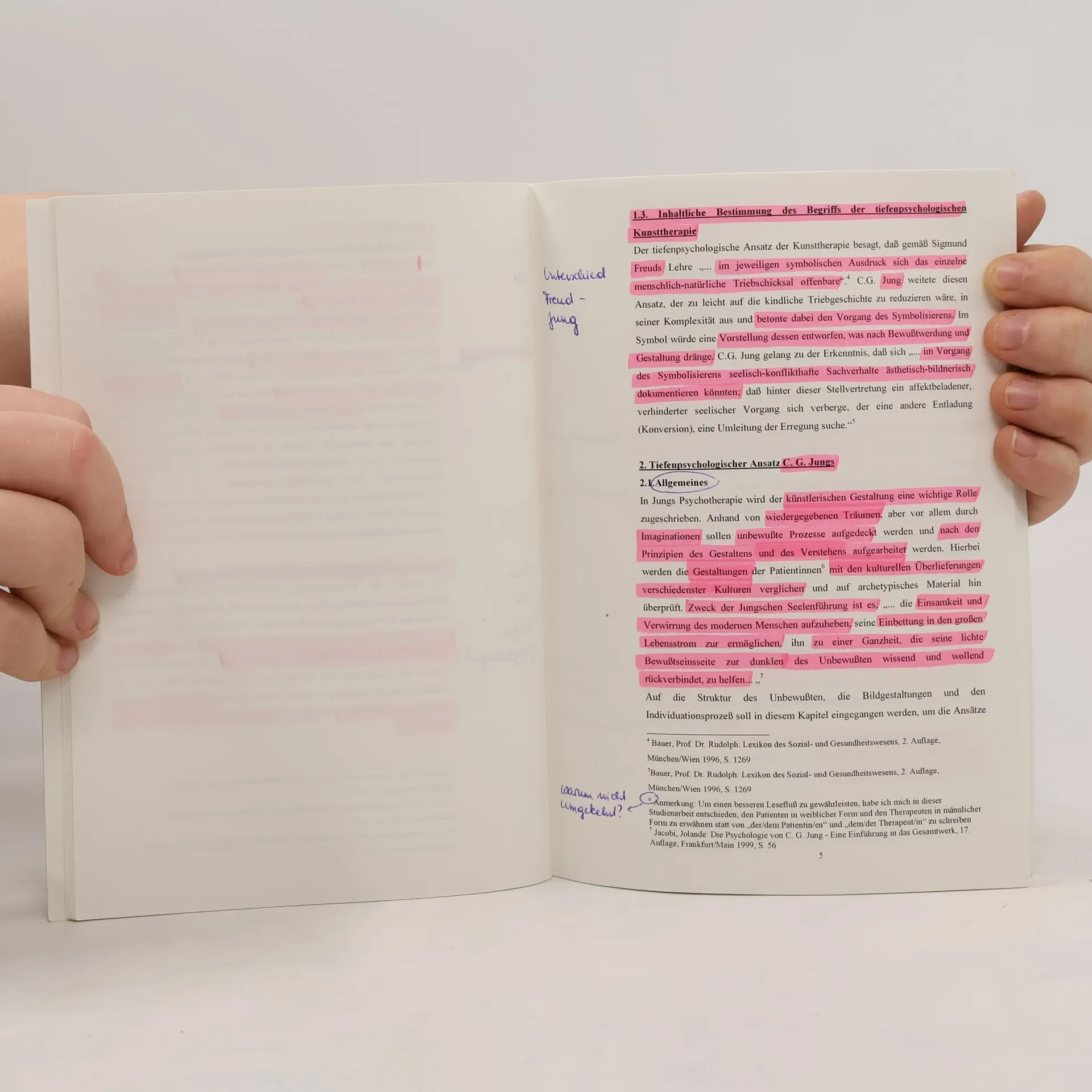 Studienarbeit aus dem Jahr 2001 im Fachbereich Psychologie - Beratung, Therapie, 1,0, Universität Kassel (Fachbereich Sozialwesen), Deutsch, Die Kunsttherapie ist eine "Therapie mit bildnerischen Mitteln, also Therapie mit den Mitteln der Zeichnung, der Graphik, der Malerei, der Plastik, der Drucktechnik, der Photographie [...]." Sie bezieht ebenso Bewegung, Tanz, Psychodrama, Theater- und Puppenspiel, Poesie und Musik in ihrer therapeutische Bandbreite mit ein. Es hat sich gleichbedeutend zur Kunsttherapie auch der Begriff der "Kreativitäts- und Gestalttherapie" als Synonym entwickelt. Während einer Therapie mit künstlerischen Mitteln findet ein innnerpsychischer Formbildungs- und Gestaltungsvorgang statt, der zur "... individuell-psychischen und psychosozialen Umstrukturierung eines Konflikts ..." führen soll. Es können fünf Ansätze in der Kunsttherapie unterschieden Ein Ansatz, der sich im Übergang von ästhetischer Theorie zu ästhetischer Psychologie befindet, desweiteren ein kunstpädagogisch-didaktischer, ein beschäftigungstherapeutischer, ein gestaltungstherapeutischer und ein spezifisch tiefenpsychologischer/psychotherapeutischer Ansatz. Aufgrund meines Interesses und des begrenzten Umfangs dieser Studienarbeit werde ich lediglich den letzten Ansatz weitergehend erläutern und versuchen, mit diesem Aufsatz zu beleuchten.