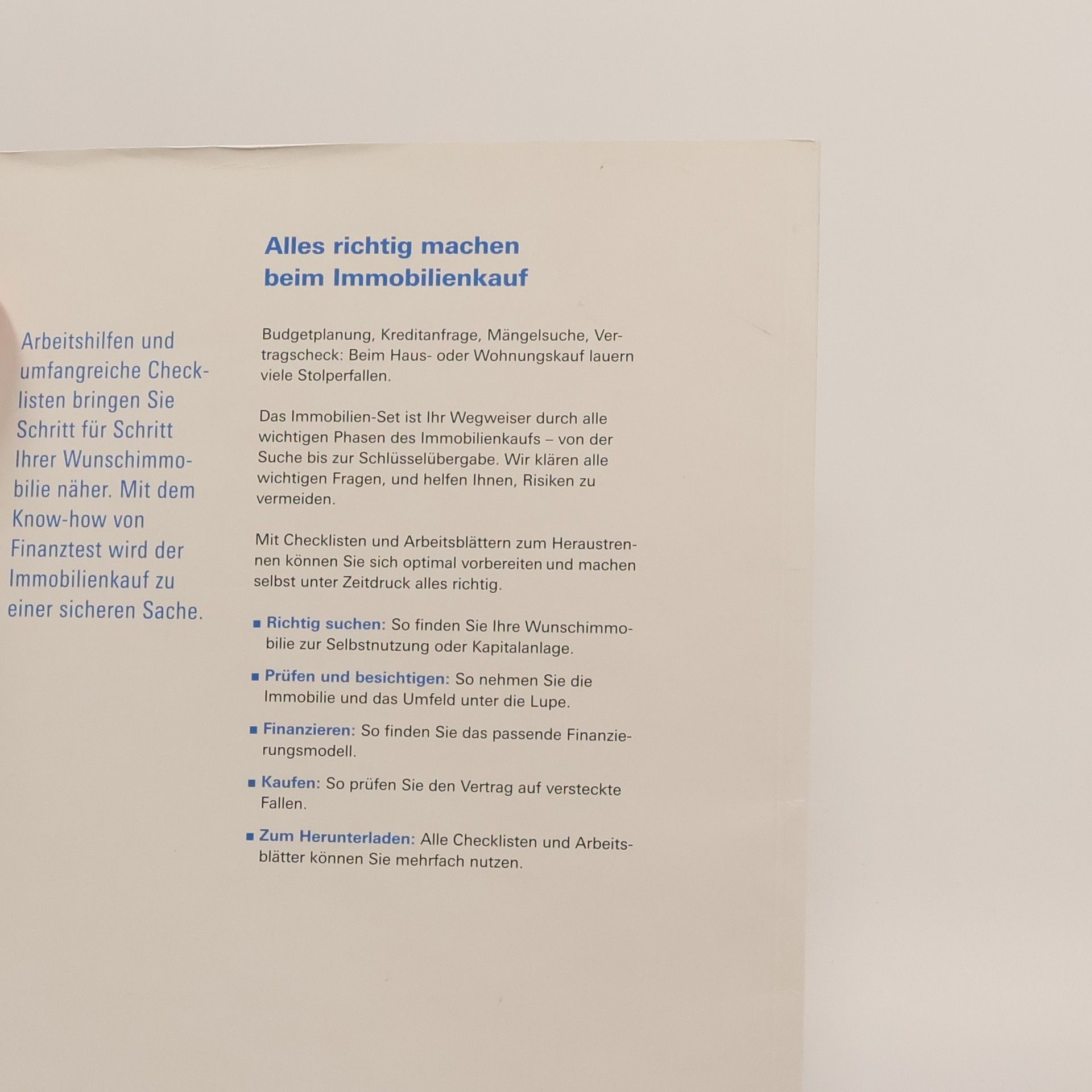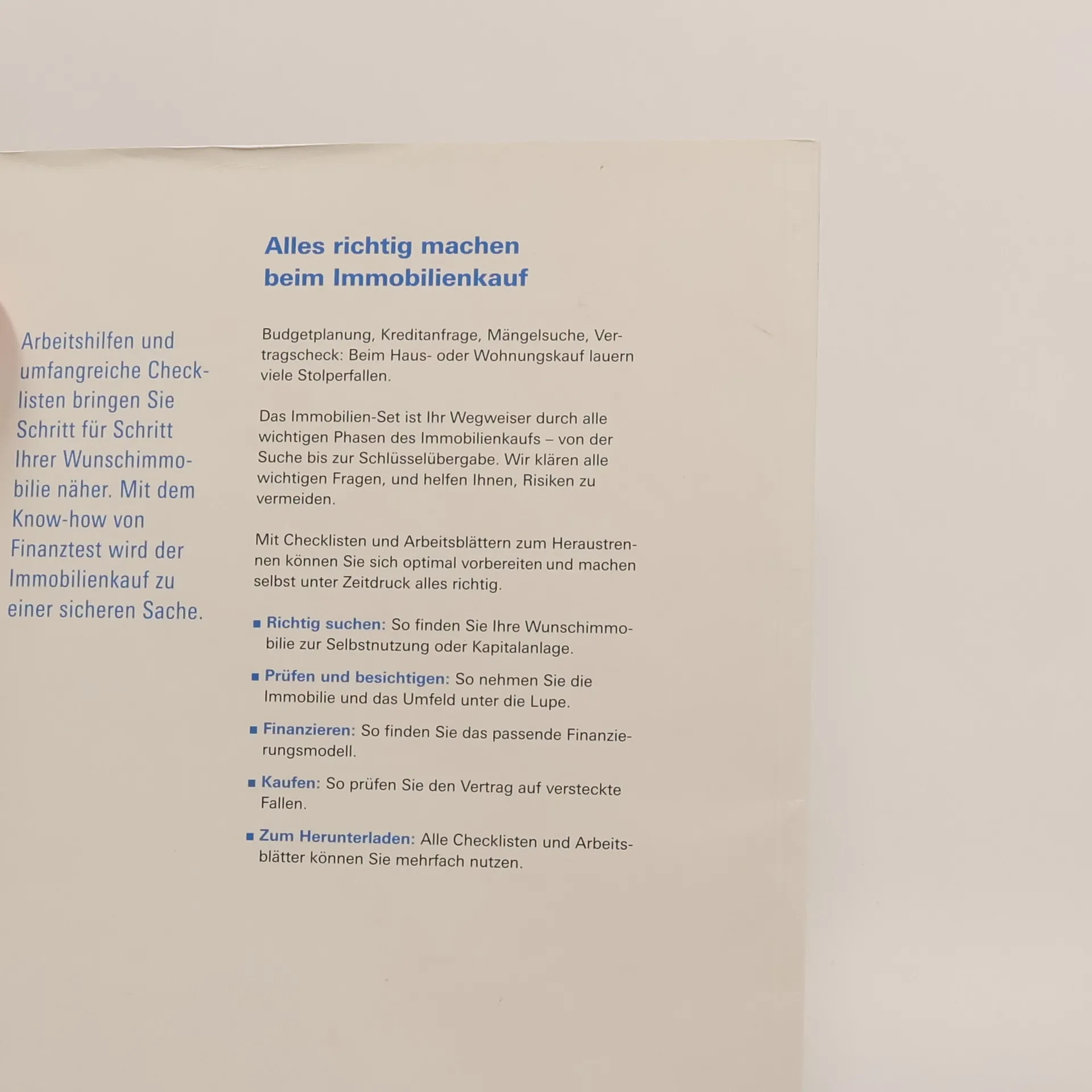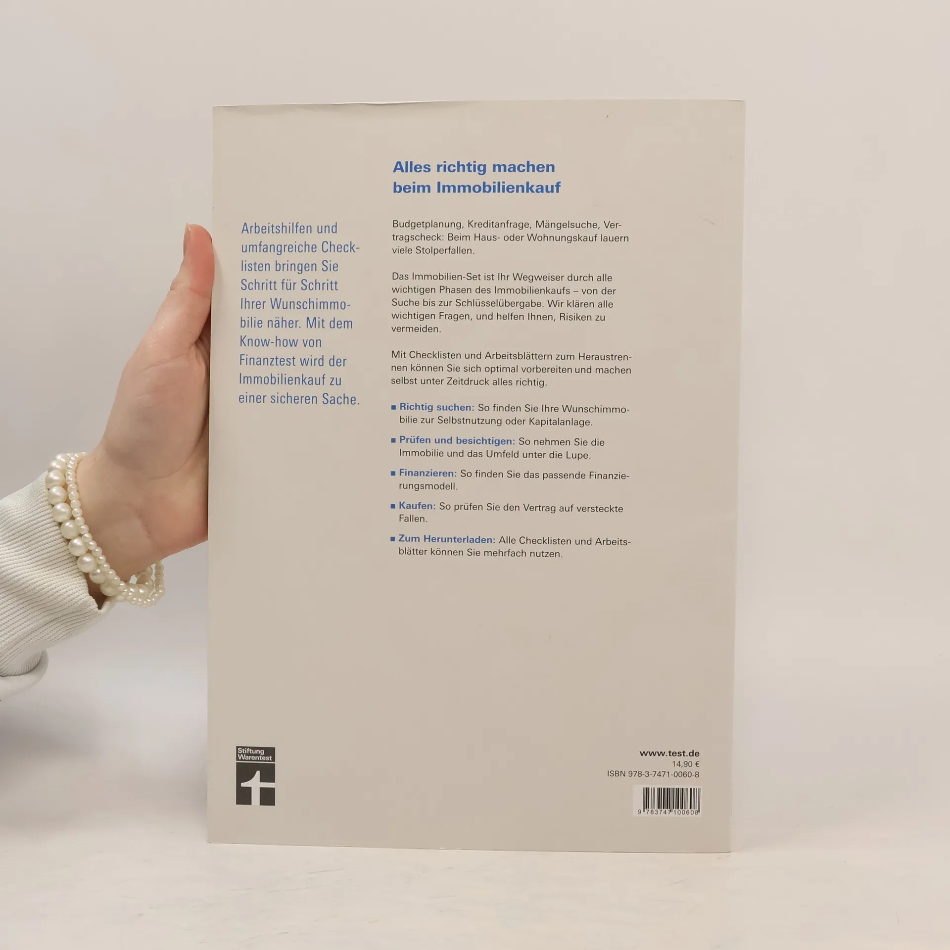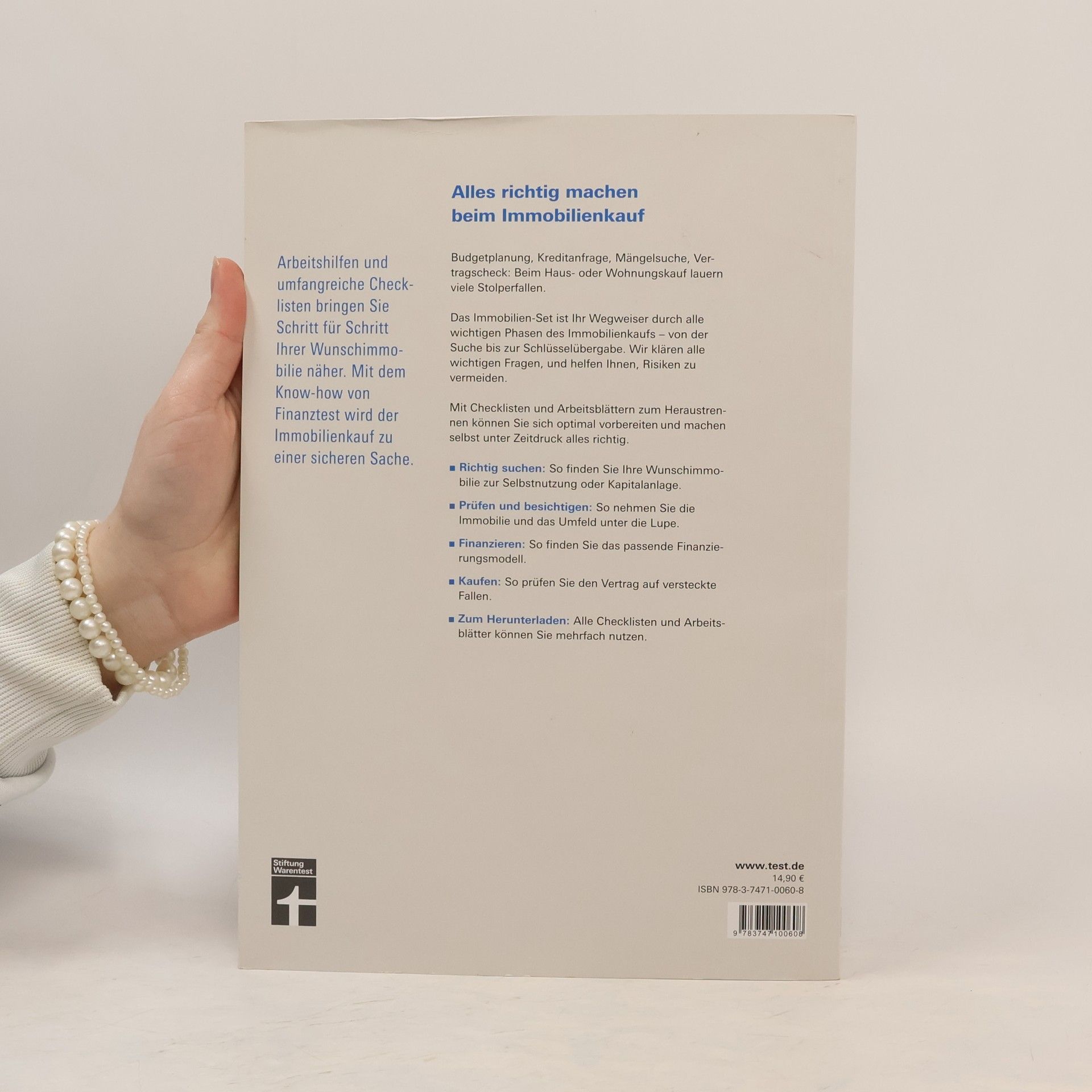 Gute Vorbereitung ist das A und O beim Immobilienkauf. Von der Suche bis zur Übergabe: Das Immobilien-Set der Stiftung Warentest zeigt, wie Sie beim Wohnungs- oder Hauskauf wirklich alles richtig machen und dabei auch unter Zeitdruck anderen immer eine Nasenlänge voraus sind. Umfangreiche Checklisten und Arbeitsblätter, z. B. zum Kaufvertrag, zur Exposé-Prüfung, Immobilienfinanzierung, Grundbuchprüfung, Maklerrechnung und zum Übergabeprotokoll helfen bei der Vorbereitung und begleiten Sie bis zum erfolgreichen Kauf. Zahlreiche Tipps und Tricks verschaffen Ihnen Sicherheit bei Verhandlungen mit Verkäufern, Maklern und Banken. Dieser Ratgeber bereitet Sie schnell, übersichtlich und gründlich auf alle Phasen bis zur Schlüsselübergabe vor. Mit den aktuellen Regelungen zum Baukindergeld.