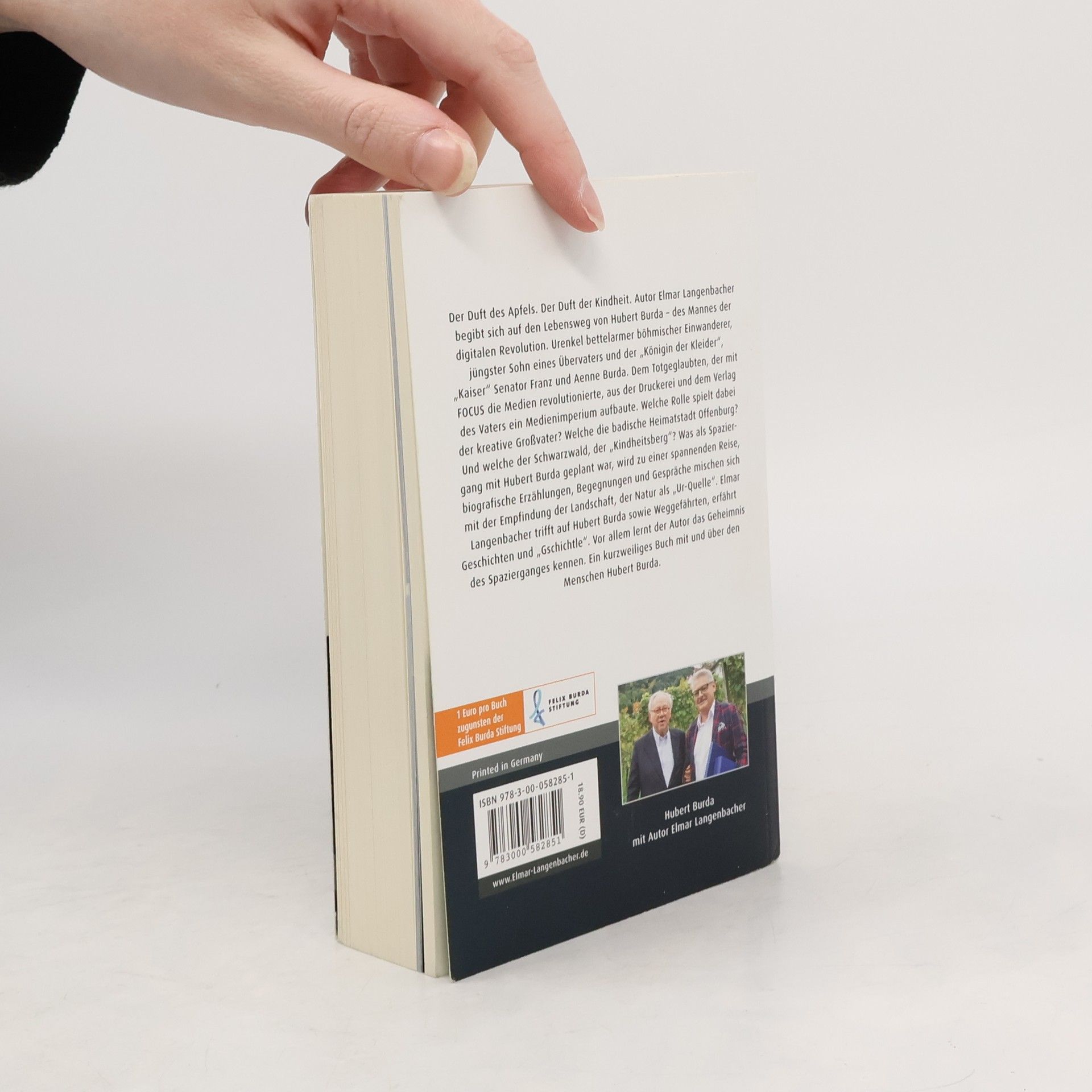 Eine neue Art der Biografie! Der Autor begibt sich auf Spurensuche, vermittelt Emotionen. Die Natur als Kreativquelle. Durch den ICH-Erzählstil ist der Leser im Geschehen. Bewusst sparsam eingesetzte Abbildungen unterstreichen die Erzählung. Rückentext: Der Duft des Apfels. Der Duft der Kindheit. Autor Elmar Langenbacher begibt sich auf den Lebensweg von Hubert Burda - des Mannes der digitalen Revolution. Urenkel bettelarmer böhmischer Einwanderer, jüngster Sohn eines Übervaters und der Königin der Kleider, Kaiser Senator Franz und Aenne Burda. Dem Totgeglaubten, der mit FOCUS die Medien revolutionierte, aus der Druckerei und dem Verlag des Vaters ein Medienimperium aufbaute. Welche Rolle spielt dabei der kreative Großvater? Welche die badische Heimatstadt Offenburg? Und welche der Schwarzwald, der Kindheitsberg? Was als Spaziergang mit Hubert Burda geplant war, wird zu einer spannenden Reise, biografische Erzählungen, Begegnungen und Gespräche mischen sich mit der Empfindung der Landschaft, der Natur als Ur-Quelle. Elmar Langenbacher trifft auf Hubert Burda sowie Weggefährten (u.a. Skilegende Georg Thoma), erfährt Geschichten und Gschichtle. Vor allem lernt der Autor das Geheimnis des Spazierganges kennen. Ein kurzweiliges Buch mit und über den Menschen Hubert Burda.