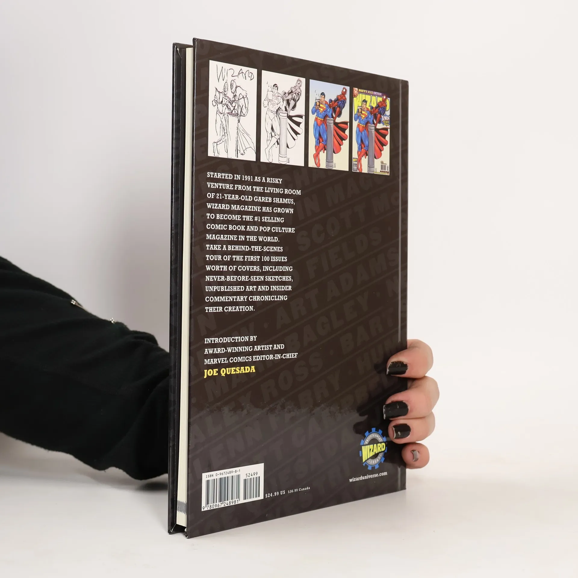 Wizard Entertainment proudly presents Wizard Big Covers Book—Limited Deluxe Hardcover. Behold over 200 pieces of fantastic cover artwork by the greatest collection of artists ever assembled in one volume—Alex Ross, Glenn Fabry, Adam Hughes, Simon Bisley, Jim Lee, Michael Turner, Todd McFarlane, George Pérez, Bart Sears, Marc Silvestri, Jeff Scott Campbell, Rob Liefeld, Joe Madureira, Carlos Pacheco, Joe Linsner, Humberto Ramos, Frank Miller and many more from the first 100 issues of Wizard. The greatest heroes and villains from all of your favorite comics of the past 10 years are represented. See Spider-Man by Todd McFarlane, Mark Bagley, Mike Wieringo, Jeff Scott Campbell, Alex Ross along with John Romita Jr. and Sr. See Superman by Joe Quesada, Joe Madureira, Ed McGuinness, Howard Porter and Tim Sale. See Wolverine by Mark Texeira, Bart Sears, Leinil Yu, Carlos Pacheco and Adam Warren. Revisit classic match-ups like Cable/Youngblood by Liefeld, Spawn/Angela by Capullo, Tomb Raider/Witchblade by Turner, Spider-Girl/Batgirl by Campbell along with Batman/Darkness by Silvestri and the Image/Valiant crossover. Check out covers that we’re commissioned but never ran from brilliant artists like Travis Charest, John Byrne, Joe Jusko, Bart Sears, Mark Texeira and others. This is by far the ultimate compendium of comic book characters and artwork. In addition to comics’ greatest heroes pop-culture icons like Bart Simpson, Beavis And Butt-Head, The X-Files, Buffy The Vampire Slayer, Cartman from South Park, Austin Powers, Darth Maul and KISS will also appear in this lavishly illustrated collectors item.
