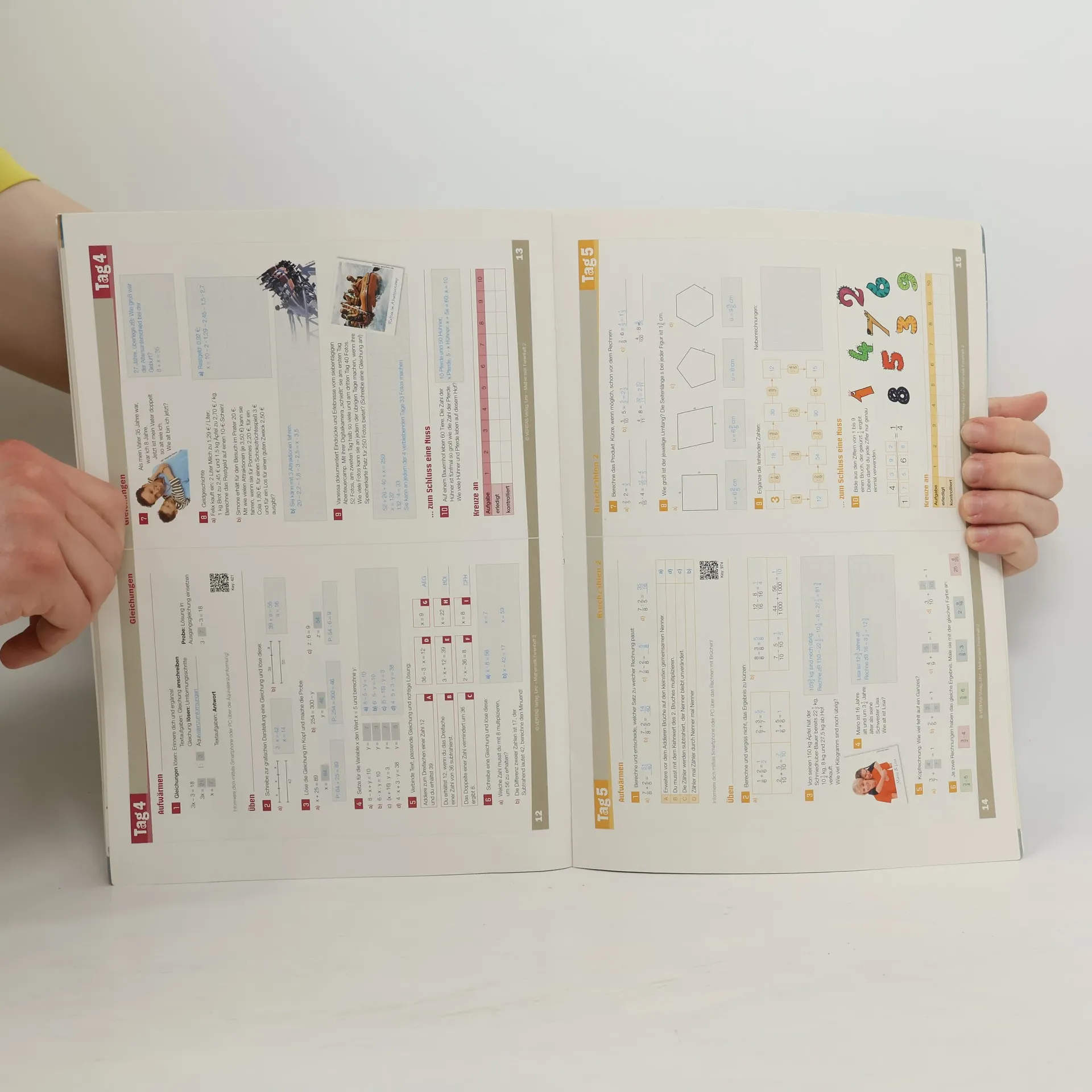 Das Mathematik-Ferienheft für die 2. Klasse Mittelschule/AHS (6.Schulstufe) wiederholt in überschaubaren Portionen die wichtigsten Kapitel der 2. Klasse und bereitet so ideal auf die 3.Klasse vor. In zehn Tagen zu je einer Doppelseite werden die mathematischen Themenbereiche der 2.Klasse wohlproportioniert behandelt. Dabei wird auf die Bildungsstandards Bezug genommen. Nach jeweils fünf Übungstagen gibt es Vergnügliches in Form von mathematischen Rätseln und Denksportaufgaben. Die Vorteile: - QR-Codes helfen bei schwierigeren Übungen via Smartphone weiter. - 4-färbiges Lösungsheft zum Herausnehmen - durch übersichtliches Layout noch kindgerechter - weniger vergessen - Wissenslücken schließen Aus dem Inhalt: - Dezimalzahlen und Bruchzahlen - Gleichungen - Dreiecke - Vierecke und Prismen - Statistik Nach österreichischem Lehrplan!