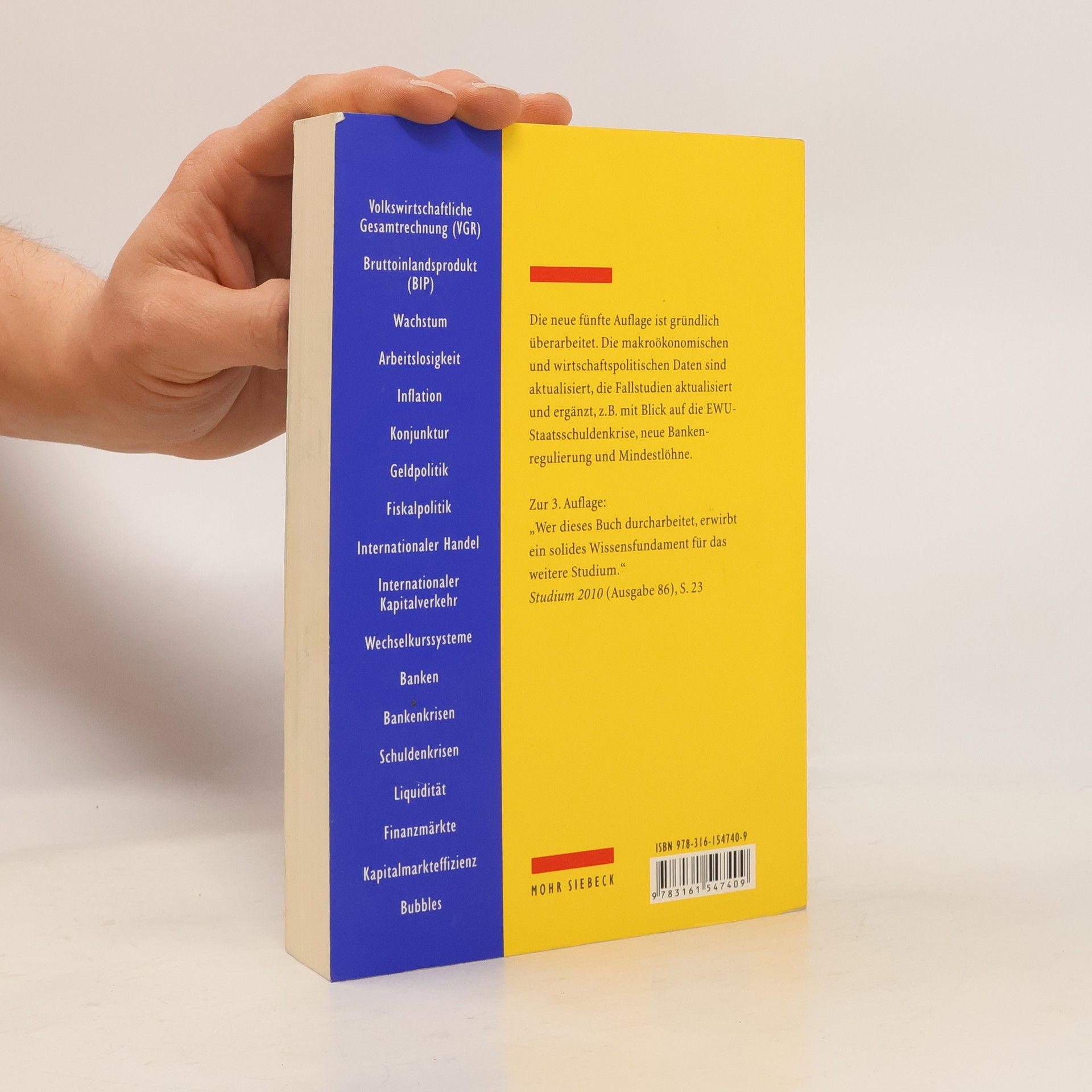Die neue fünfte Auflage ist gründlich überarbeitet. Die makroökonomischen und wirtschaftspolitischen Daten sind aktualisiert, die Fallstudien aktualisiert und ergänzt, z. B. mit Blick auf die EWU-Staatsschuldenkrise, neue Bankenregulierung und Mindestlöhne. Aus Rezensionen zur 3. Auflage: „Im Vergleich zu den meisten englischsprachigen Einführungen zeichnet es sich durch größeren analytischen Tiefgang aus. Die vorgestellten Ansätze erläutert der Autor jeweils anhand von Beispielen und Fallstudien, zudem werden alle Modell-Ergebnisse schrittweise hergeleitet, was das ökonomische Denken schult. Die Neuauflage wurde gründlich aktualisiert und in wichtigen Bereichen [] auf den neuesten Stand gebracht. Wer dieses Buch durcharbeitet, erwirbt ein solides Wissensfundament für das weitere Studium.“ Studium 2010 (Ausgabe 86), S. 23