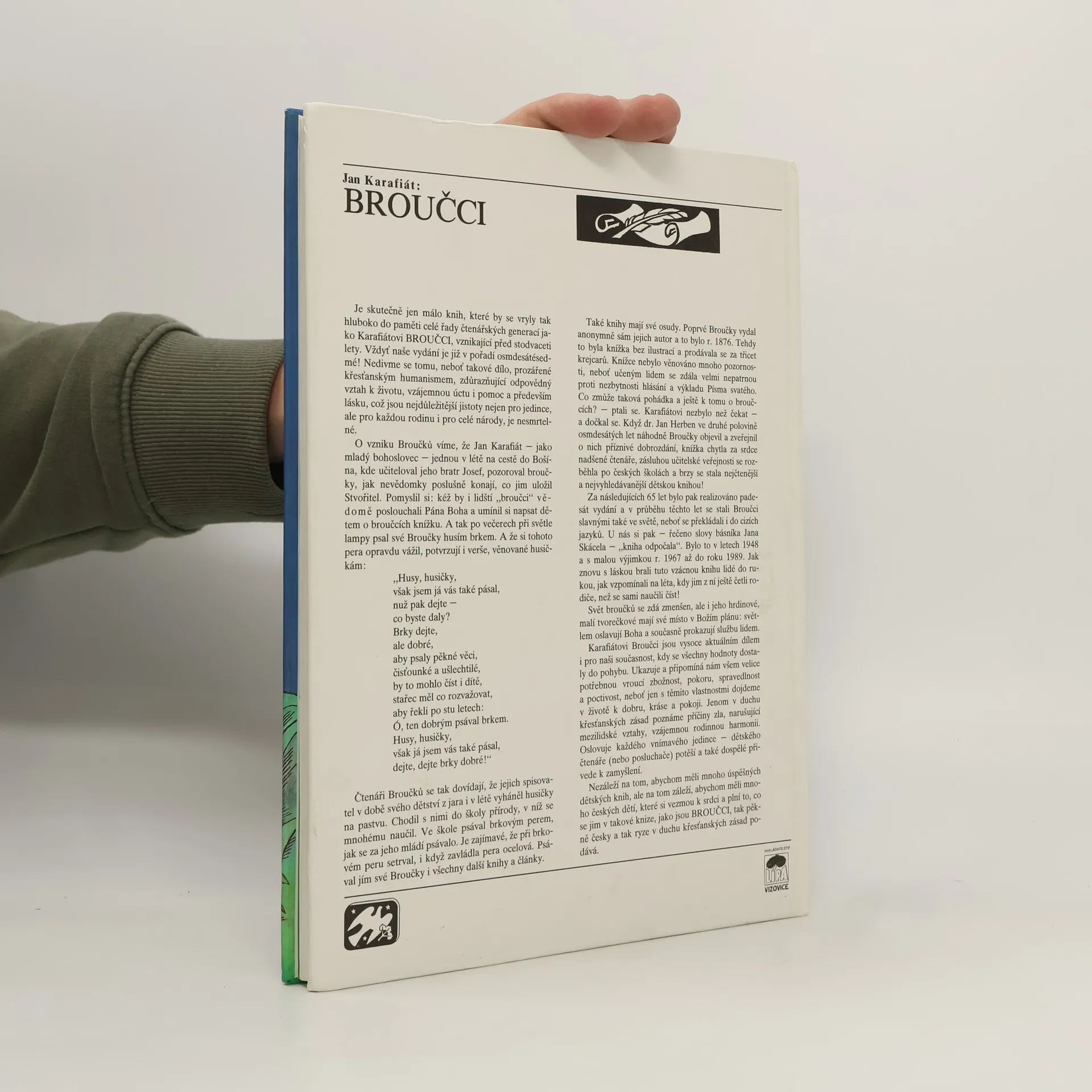 Broučky, jediné umělecké literární dílo Jana Karafiáta (1846–1929), potkaly nejednoduché osudy. Roku 1876 anonymně vyšel skromný, neilustrovaný svazek – tehdy s názvem Broučci pro malé i velké děti – a zapadl vcelku bez povšimnutí. Až teprve po sedmnácti letech knížku objevil a zpopularizoval novinář Gustav Jaroš, který ji označil jako „snad nejkrásnější květ naší české literatury dětské“ a jejího autora nazval „českým Andersenem“. Poetická obraznost Broučků, citlivý přírodní lyrismus a ušlechtilý humanismus si dále uchovávají nepomíjející platnost. I jazykově, svým jadrným básnickým slohem šťastně spojujícím hovorovost lidové řeči s vytříbenými biblismy, je dílo Jana Karafiáta pozoruhodné. Čtenářsky i posluchačsky stále přitažlivé zůstávají postavičky malých hrdinů, broučků a berušek, které při všech svých světlých stránkách nejsou zbaveny pravdivých lidských vlastností. Spolehlivým průvodcem Broučků jsou ilustrace národního umělce Jiřího Trnky, které přes časový odstup od svého vzniku na počátku čtyřicátých let nic nepozbyly ze svého půvabu.