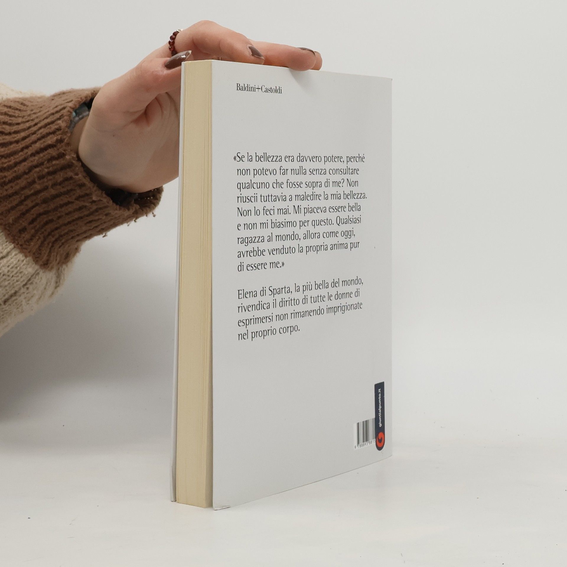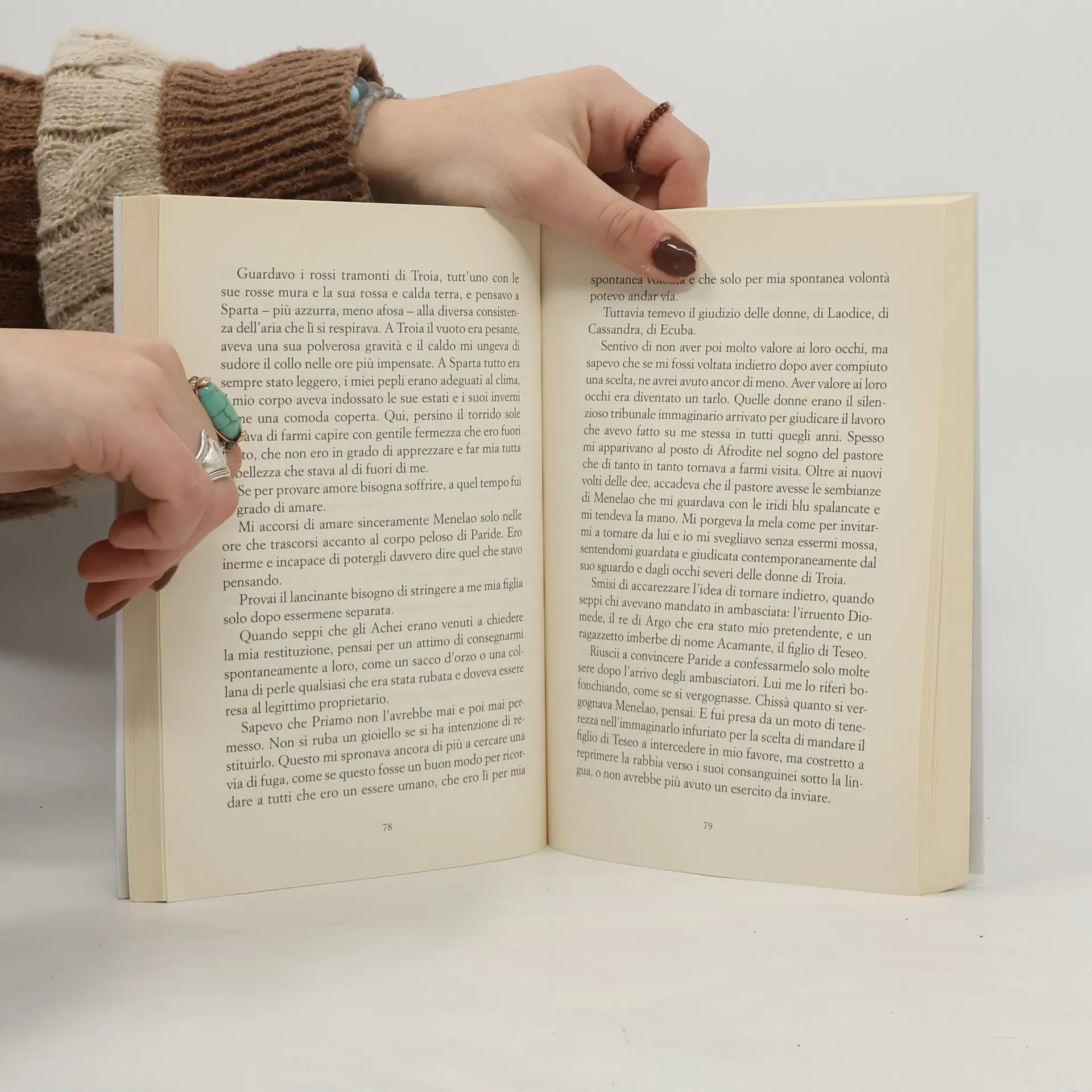 Quando, dopo dieci anni e dopo il famoso assedio di Troia da parte dei Greci, Elena viene riportata in patria, Menelao ha solo una domanda da farle: perché? Perché ha deciso di scatenare una guerra? La risposta di Elena è semplice. Le sembrava l'unico modo per dimostrare a tutti l'esistenza di Elena di Sparta, l'unico modo che aveva di essere ascoltata. «Racconta, all'ora», le dice Menelao. Ed Elena comincia a raccontare. Fin da piccola l'idea di essere considerata una dea le era parso qualcosa di grandioso, presto quella pura illusione si infrange. Teseo la rapisce e la stupra, quando Castore e Polluce, suoi fratelli, vanno a riprendersela viene data in sposa a Menelao e diventa la regina di Sparta. Ma Elena non si accontenta e decide di fuggire con Paride verso Troia, città in cui le donne contano quanto gli uomini, in cui possono scegliersi i mariti. Presto però si rende conto che anche lì il suo parere non è richiesto. Elena racconta non per ammettere colpe né per giustificarsi. Non vuole essere compresa o perdonata, lo fa perché la sua storia, quella di una donna prigioniera del proprio corpo o identificata con esso agli occhi degli uomini, possa infine uscire dalle sue viscere e trovare pace.