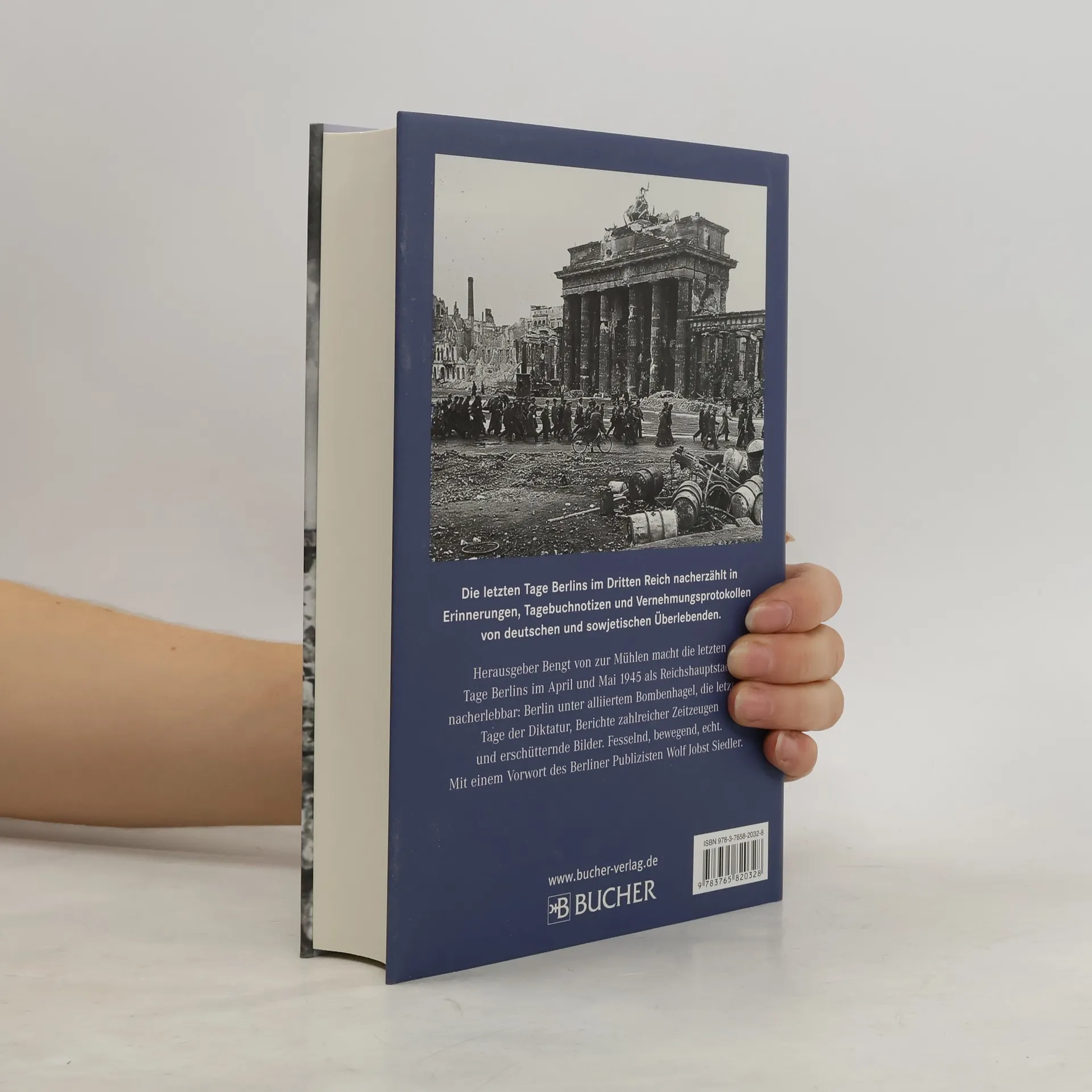 Herausgeber Bengt von zur Mühlen bediente sich des größten privaten Filmarchivs Deutschlands – und macht die letzten Tage Berlins im April und Mai 1945 als Reichshauptstadt nacherlebbar: Berlin unter alliiertem Bombenhagel, die letzten Tage der Diktatur, Berichte zahlreicher Zeitzeugen und erschütternde, teils bisher unbekannte Bilder. Fesselnd, bewegend, echt. Mit einem Vorwort des Berliner Publizisten Wolf Jobst Siedler.