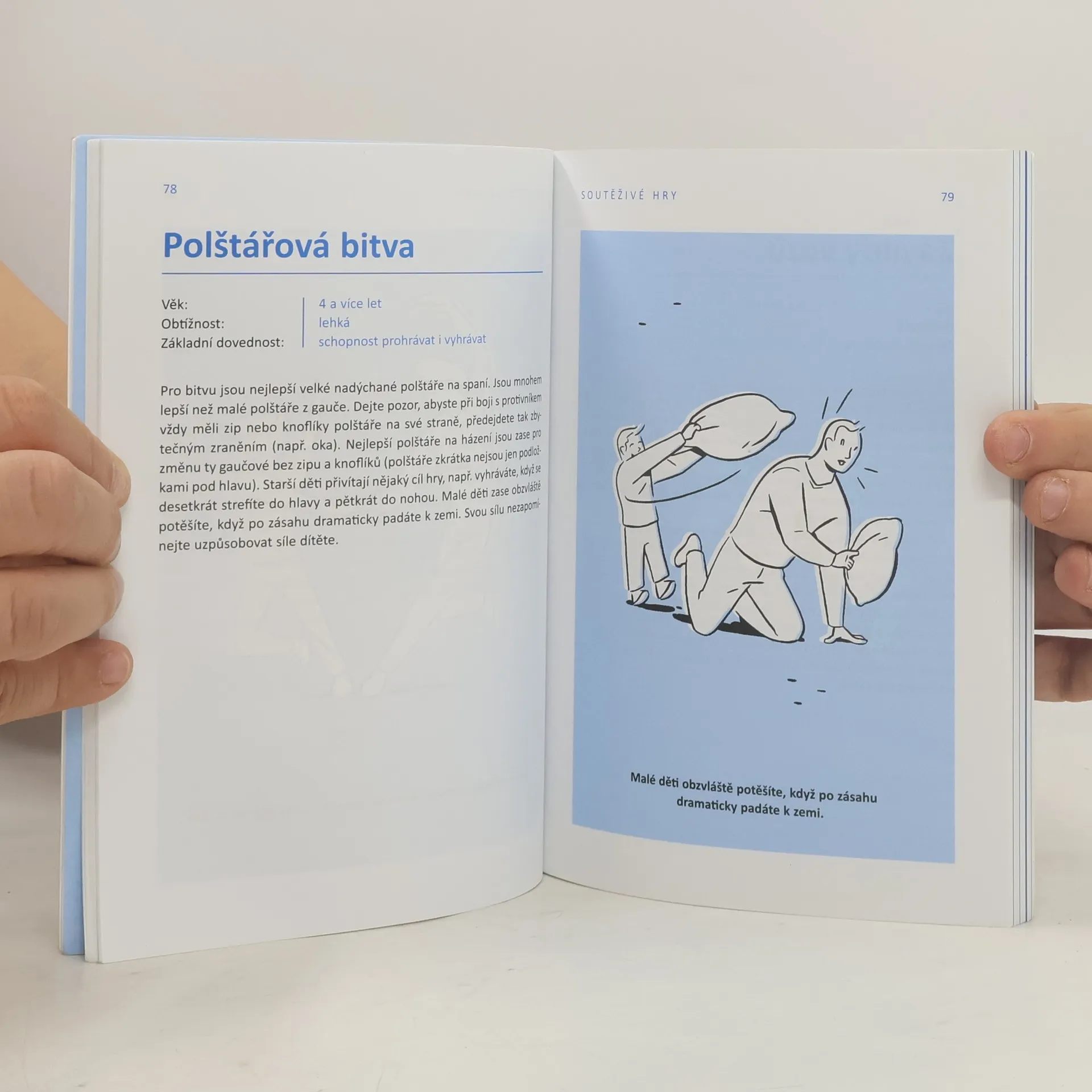 Polštářové bitvy a jiné hry: o starém dobrém dovádění a o tom, proč je děti potřebují. Ojedinělá publikace dvojice autorů přináší soubor her a aktivit vycházejících z přirozených, spontánních, improvizovaných aktivit, k nimž většinou nepotřebujeme žádné zvláštní pomůcky či podmínky, jen radost z pohybu a hravost. Hry rozvíjejí známé a intuitivní motivy polštářových bitev, velké množství různých druhů „zápasů“, ale především přinášejí množství nových inspirací – hromadné kradení ponožek přímo z cizí nohy jen za pomocí vlastního chodidla, hry na „záchrany“ na vrcholku vulkánu, „lezení na věž v Pise“ apod. Hry prohlubují kontakt dítěte a dospělého, pocit vzájemné důvěry, spolupráce, komunikace, v dětech rozvíjejí pohybové dovednosti, emoční inteligenci, sebedůvěru, představivost, tvořivost. Publikace obsahuje základní metodické pokyny, každá hra je označena doporučeními věku, stupněm obtížnosti, případně poznámkami o bezpečnosti, pomůckách apod. Knihu ocení především rodiče a pedagogové dětí předškolního věku, inspirativní je však i pro práci se staršími dětmi.