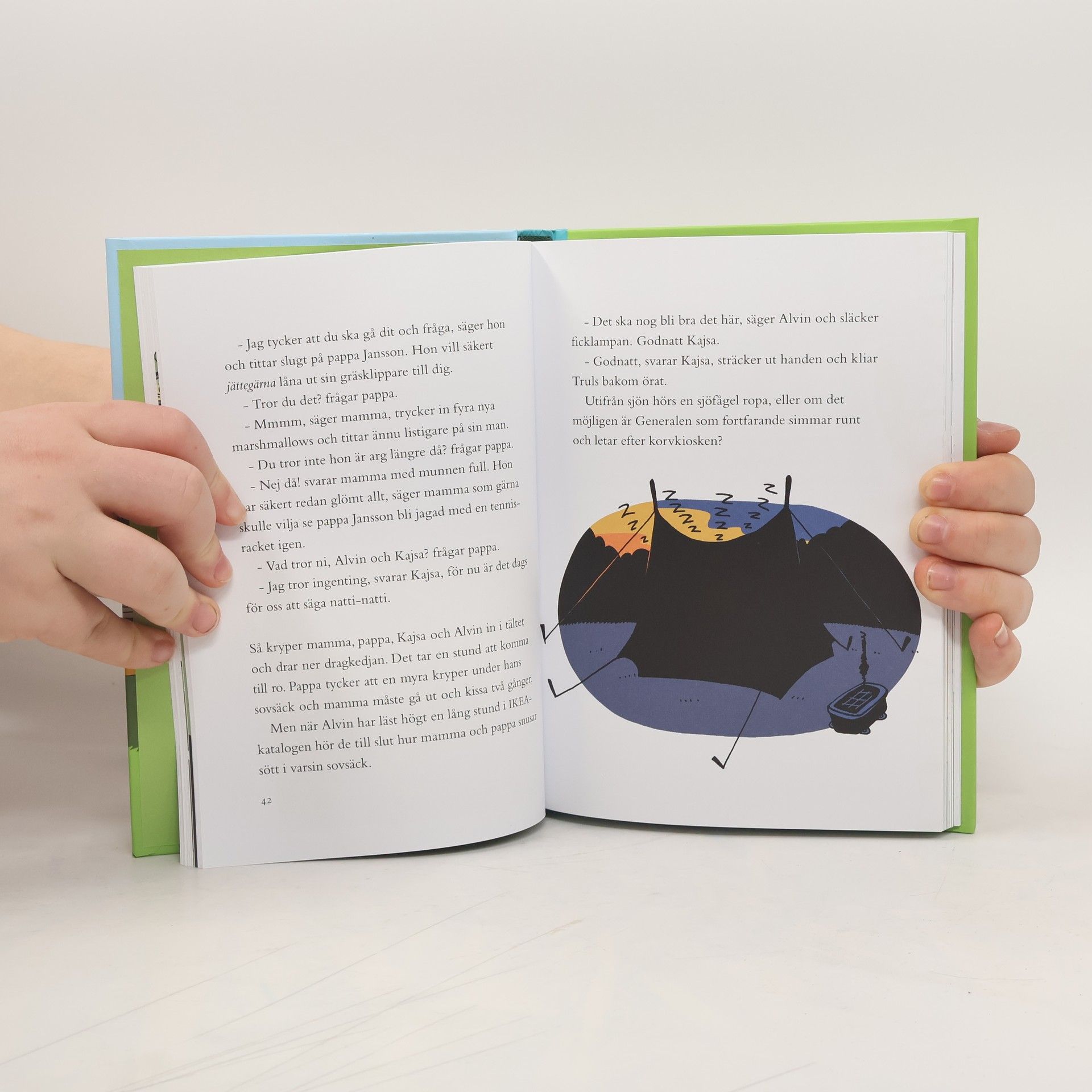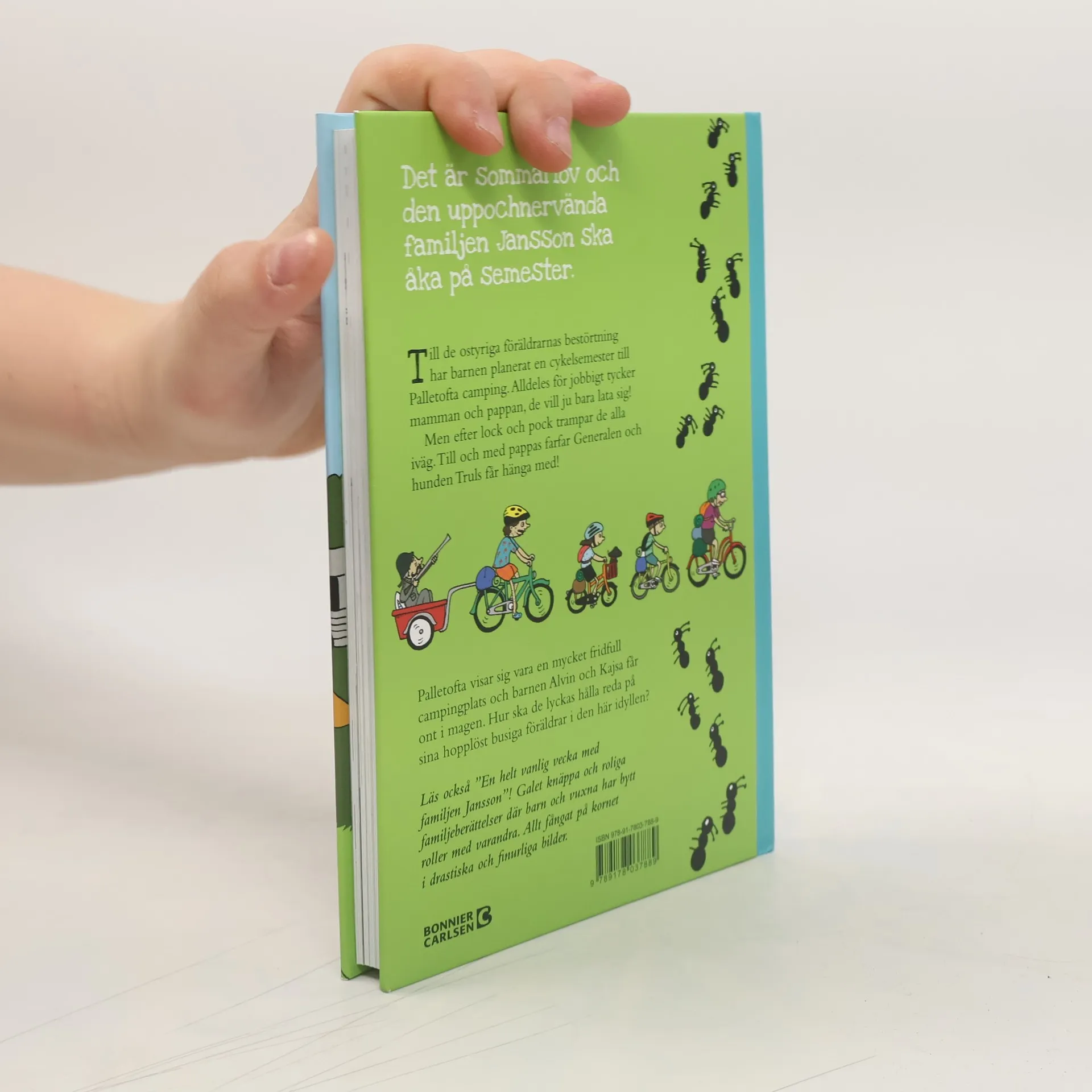 Håll i er! För i Martin Widmarks högläsningsbok om den uppochnervända familjen Jansson kan i princip allting hända.Hela familjen Jansson ska åka på cykelsemester till Palletofta camping. Där är det inte helt lätt för barnen Kajsa och Alvin att hålla reda på sina retsamma, lekfulla och hopplöst busiga föräldrar. Låter det märkligt? Inte alls. Det är för att det här är en galet knäpp och rolig familjeberättelse där barn och vuxna har bytt roller med varandra. Barnen Kajsa och Alvin har axlat föräldrarollen medan deras mamma och pappa har ruskat av sig den. Istället bygger nu föräldrarna myrfängelser, ordnar kobingo och klipper gräset på campingplatsen hejvilt (till föreståndarinnans fasa!). Det är tur att familjen Janssons grannar, familjen Yolmaz, också dyker upp på campingen. Deras familjesituation är nämligen exakt densamma.Och så får vi absolut inte glömma generalen... han som älskar "körv" med räksallad. I den här berättelsen simmar han iväg ut på äventyr och återvänder som "General Amour".Böckerna om Familjen Jansson är en fyndig lek med roller och förväntningar som ursprungligen skapades i ett samarbete mellan författarna Martin Widmark och Petter Lidbeck. Även denna bok, nr 2 i serien, bjuder på igenkänning för hela familjen att skratta åt tillsammans. Allt fångat på kornet i illustratören Pelle Forsheds drastiskt, crazy bilder.