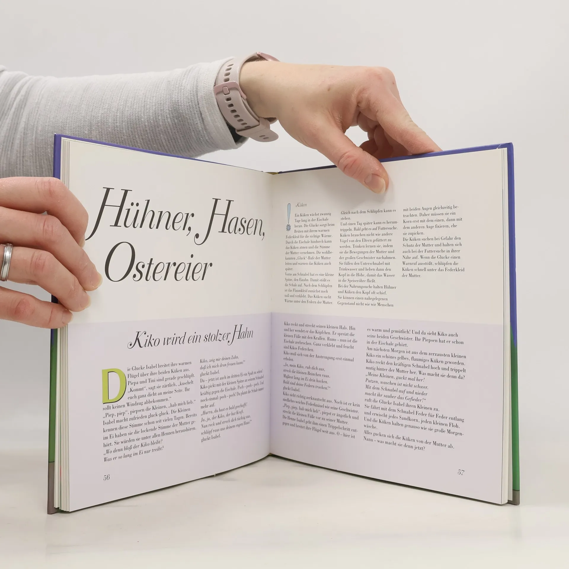 "Das Mitmachbuch zur Frühlings- und Osterzeit" bietet Geschichten über Frühlingspflanzen, Tiere und Osterbräuche sowie zahlreiche kreative Vorschläge zum Basteln, Spielen und Feiern. Es enthält Anleitungen für Papierblumen, Fingerpuppen, Spiele, Dekorationen, Tipps zum Eierbemalen und Rezepte für Ostergebäck.