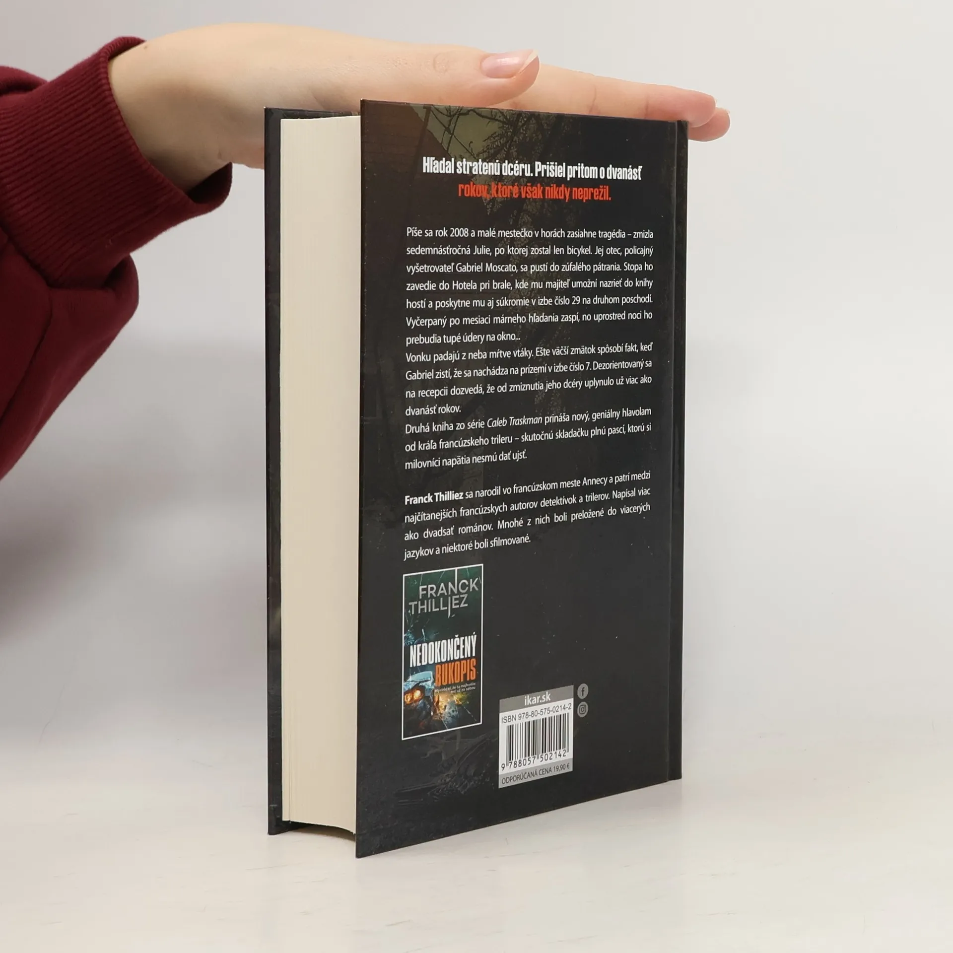 Hľadal stratenú dcéru. Stratil pritom dvanásť rokov, ktoré však nikdy neprežil. Píše sa rok 2008 a malé mestečko v horách zasiahne tragédia – zmizla sedemnásťročná Julie, po ktorej zostal len bicykel. Jej otec, poručík Gabriel Moscato, sa pustí do zúfalého pátrania. Stopa ho zavedie do Hotela pri brale, kde mu majiteľ umožní nazrieť do knihy hostí a zároveň mu ponúkne možnosť medzitým zotrvať v izbe číslo 29 na druhom poschodí. Vyčerpaný po mesiaci márneho hľadania zaspí, no uprostred noci ho prebudia tupé údery na okno... Vonku padajú z neba mŕtve vtáky. Ešte väčší zmätok spôsobí fakt, keď Gabriel zistí, že sa nachádza na prízemí v izbe číslo 7. Dezorientovaný sa na recepcii dozvedá, že od zmiznutia jeho dcéry uplynulo už viac ako dvanásť rokov. Druhá kniha zo série Caleb Traskman prináša nový, geniálny hlavolam od kráľa francúzskeho trileru – skutočnú skladačku plnú pascí, ktorú si milovníci napätia nesmú nechať ujsť.
