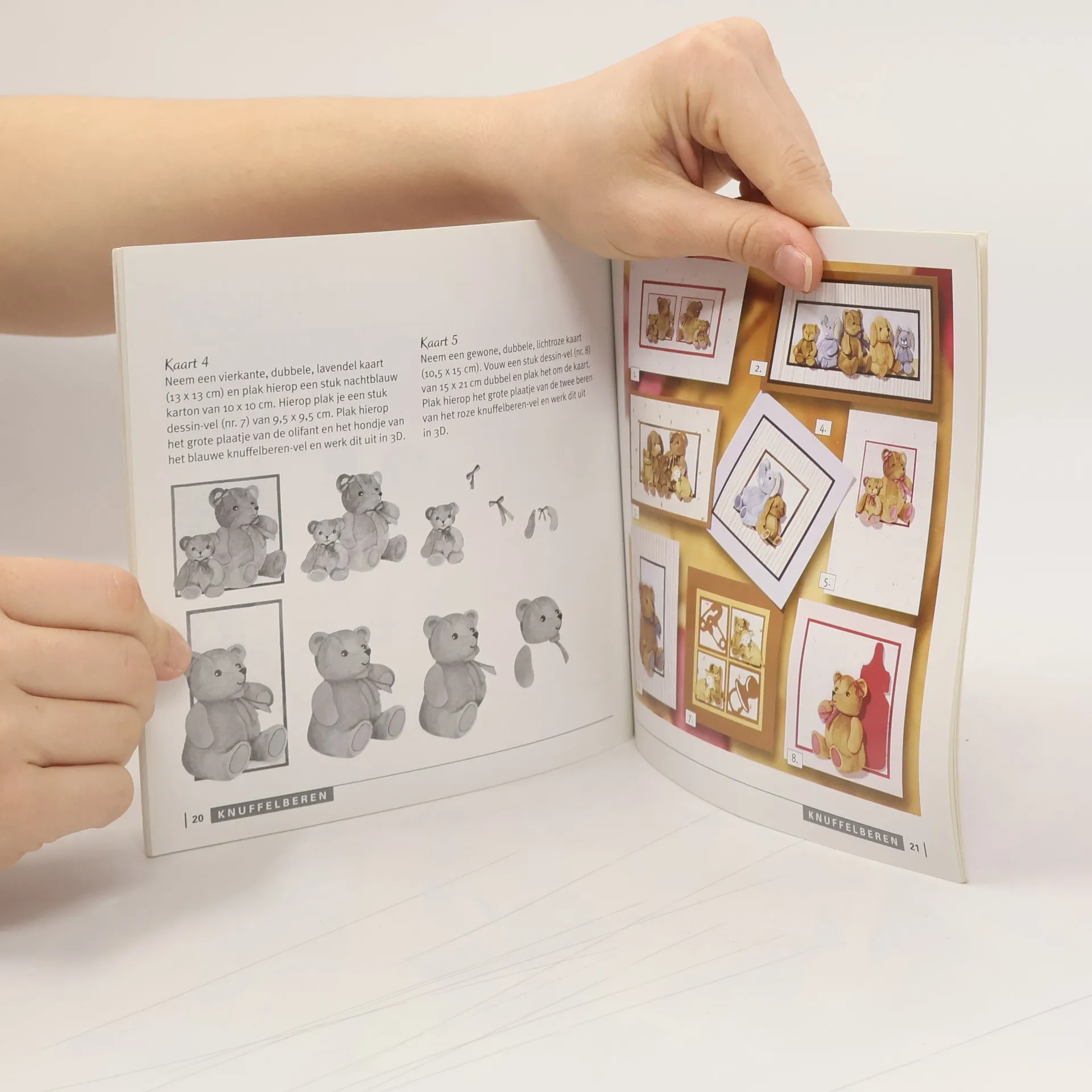 Voorbeelden van wenskaarten met driedimensionale decoraties en voornamelijk bloemfiguren uit knipvellen.