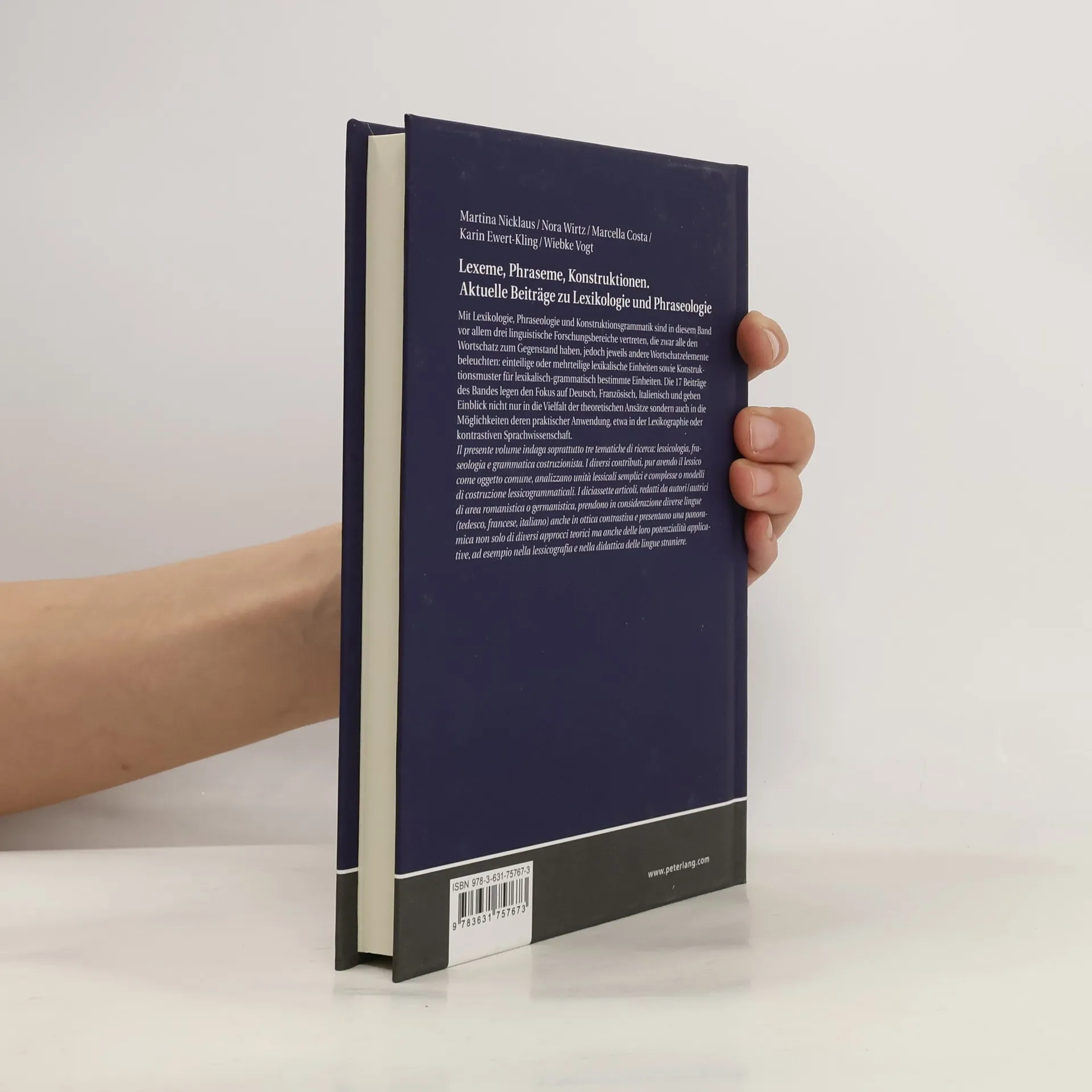 Mit Lexikologie, Phraseologie und Konstruktionsgrammatik sind in diesem Band vor allem drei linguistische Forschungsbereiche vertreten, die zwar alle den Wortschatz zum Gegenstand haben, jedoch jeweils andere Wortschatzelemente beleuchten: einteilige oder mehrteilige lexikalische Einheiten sowie Konstruktionsmuster für lexikalisch-grammatisch bestimmte Einheiten. Die 17 Beiträge des Bandes legen den Fokus auf Deutsch, Französisch, Italienisch und geben Einblick nicht nur in die Vielfalt der theoretischen Ansätze sondern auch in die Möglichkeiten deren praktischer Anwendung, etwa in der Lexikographie oder kontrastiven Sprachwissenschaft. Il presente volume indaga soprattutto tre tematiche di ricerca: lessicologia, fraseologia e grammatica costruzionista. I diversi contributi, pur avendo il lessico come oggetto comune, analizzano unità lessicali semplici e complesse o modelli di costruzione lessicogrammaticali. I diciassette articoli, redatti da autori/autrici di area romanistica o germanistica, prendono in considerazione diverse lingue (tedesco, francese, italiano) anche in ottica contrastiva e presentano una panoramica non solo di diversi approcci teorici ma anche delle loro potenzialità applicative, ad esempio nella lessicografia e nella didattica delle lingue straniere.