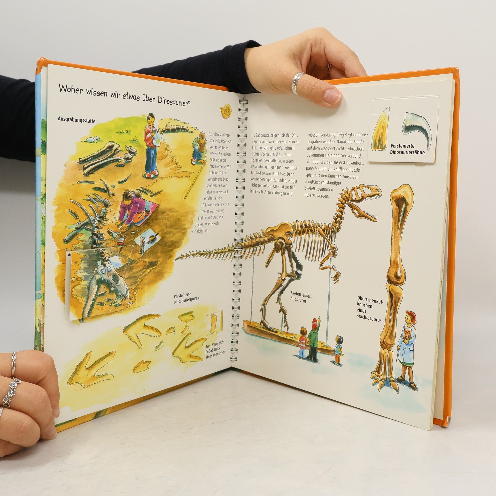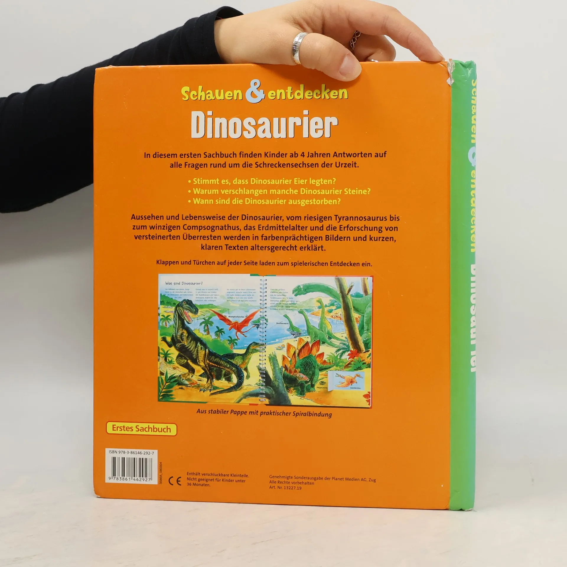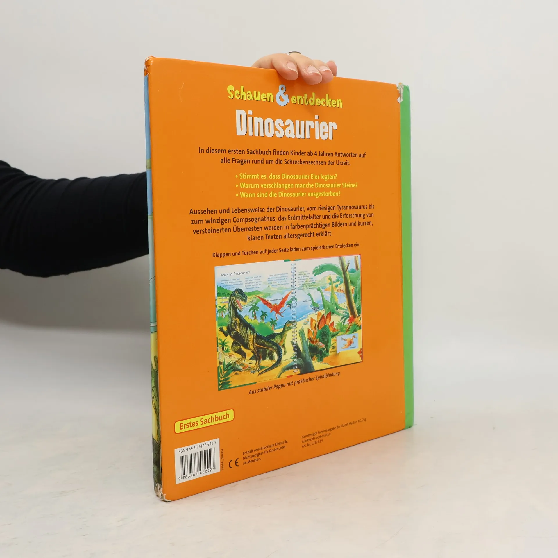 Ein Sachbuch für Kinder ab 4 Jahren. Antworten auf Fragen rund um die Schreckensechsen der Urzeit, mit Klappen und Türchen auf jeder Seite.