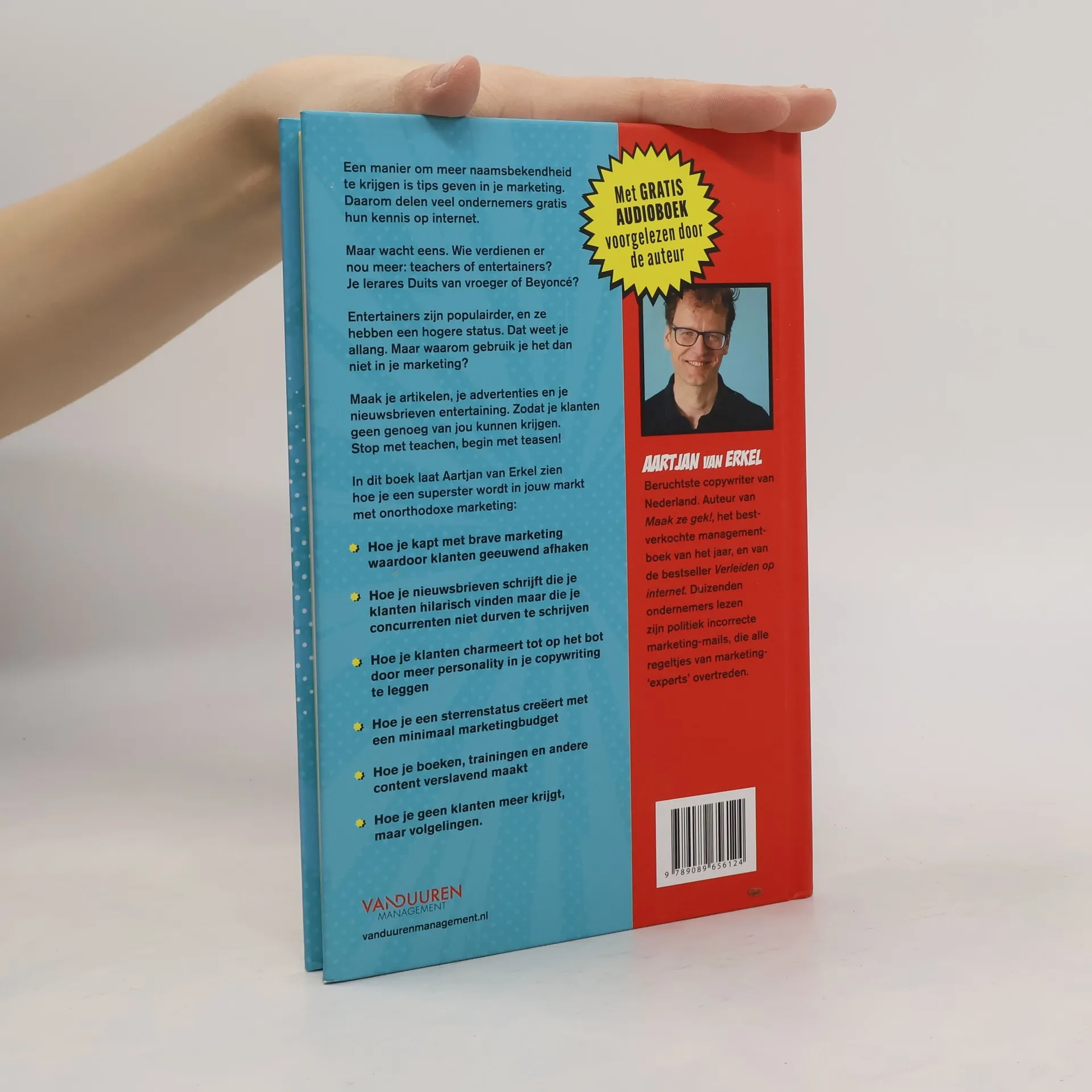 Een manier om meer naamsbekendheid te krijgen is tips geven in je marketing. Daarom delen veel ondernemers gratis hun kennis op internet.Maar wacht eens. Wie verdienen er nou meer: teachers of entertainers? Je lerares Duits van vroeger, of Beyoncé? Entertainers zijn populairder, en ze hebben een hogere status. Dat weet je allang. Maar waarom gebruik je het dan niet in je marketing? Wanneer je artikelen, advertenties en nieuwsbrieven entertaining zijn, zullen klanten geen genoeg van je kunnen krijgen. Dus: Stop met teachen, en begin met teasen!In dit boek laat Aartjan van Erkel zien hoe je een superster wordt in jouw markt met onorthodoxe marketing:- hoe je kapt met brave marketing waardoor klanten geeuwend afhaken- hoe je nieuwsbrieven schrijft die je klanten hilarisch vinden maar die je concurrenten niet durven te schrijven- hoe je klanten charmeert tot op het bot door meer personality in je copywriting te leggen- hoe je een sterrenstatus creëert met een minimaal marketingbudget- hoe je boeken, trainingen en andere content verslavend maakt- hoe je geen klanten meer krijgt, maar volgelingen.