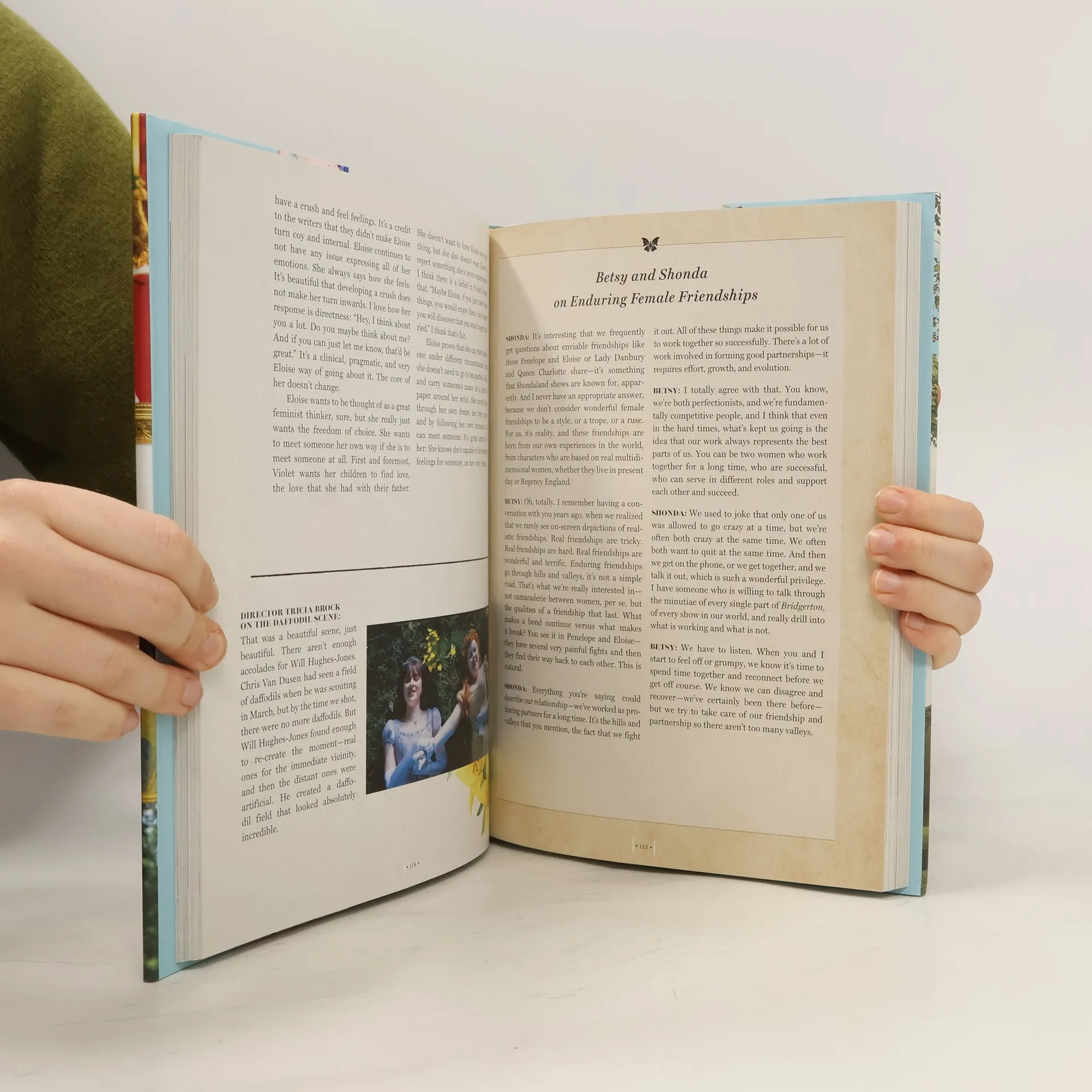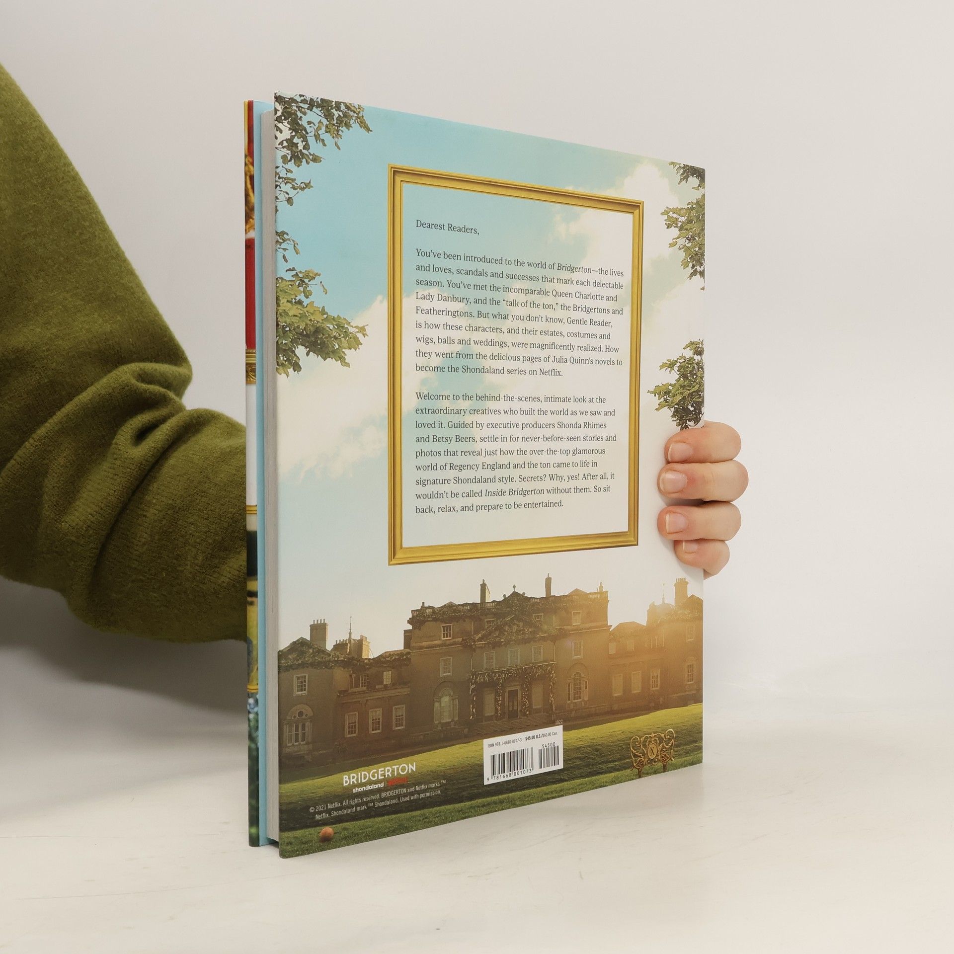 The stunning, full-color, behind-the-scenes look at Shondaland’s hit series on Netflix. Inside Bridgerton is the intimate behind-the-scenes story of the hit Shondaland series on Netflix. Shondaland executive producers Shonda Rhimes and Betsy Beers offer exclusive insights, and introduce you to the series writers, producers, directors, cast, crew, and talented creatives who brought Julia Quinn’s beloved novels to the screen. Full-color and beautifully designed, Inside Bridgerton is the official book about the show, and includes never-before-seen photographs, firsthand accounts on casting, insight into the decisions behind the costumes and sets, directors’ accounts on filming your favorite scenes, and more from the creative minds that launched a cultural phenomenon. From the Introduction to Inside Bridgerton: SHONDA: Shall we take everyone back to the beginning? Not to the 1800s, but to 2017 and that hotel room where I was sick, and needed something to read, and there happened to be a copy of The Duke & I by Julia Quinn, the first of the Bridgerton novels. I’m not someone who was into romance novels—I really didn’t even know much about the genre. But I picked it up, couldn’t put it down, and then immediately got my hands on the rest of them because they were a fabulous read. And then I passed them to you. BETSY: I thought you were high. Or that you had hit your head in that hotel room while you had the flu. Romance novels? But you insisted that they would be a fabulous show and you have excellent taste. I was deeply skeptical because I hadn’t read a romance novel since I was a teen—I’d certainly never read a period romance novel. SHONDA: Totally—you read the ones of the 1980s, when everyone wore huge shoulder pads and diamonds. BETSY: Right. So there’s some continuity here because these guys were wearing diamonds, too. SHONDA: Fair—but as far as a period romance, I mean, if it wasn’t Jane Austen, I didn’t really know about it. I’m not going to diss Jane Austen because I’m not an idiot… BETSY: She might get upset. SHONDA: She might roll over in her grave. But Julia Quinn’s novels were just so much juicier than Austen, and they’re written by someone who was far less confined and less proper. After all, Julia is a modern woman, not stuck in the constraints of the age. BETSY: Without a doubt. And I never knew that the ton existed: Austen wrote about a pastoral society where everyone is in relatively drab clothes and spent a lot of time in chapels and churches. SHONDA: Totally. And they recycled their dresses more. BETSY: Meanwhile, this was an amazing world of luxury and excess. And she had this crazy device of a gossip columnist, pulling the strings, which was such a cool concept. Julia Quinn created an entirely new, glamorous, bright world that you had actually never seen before.