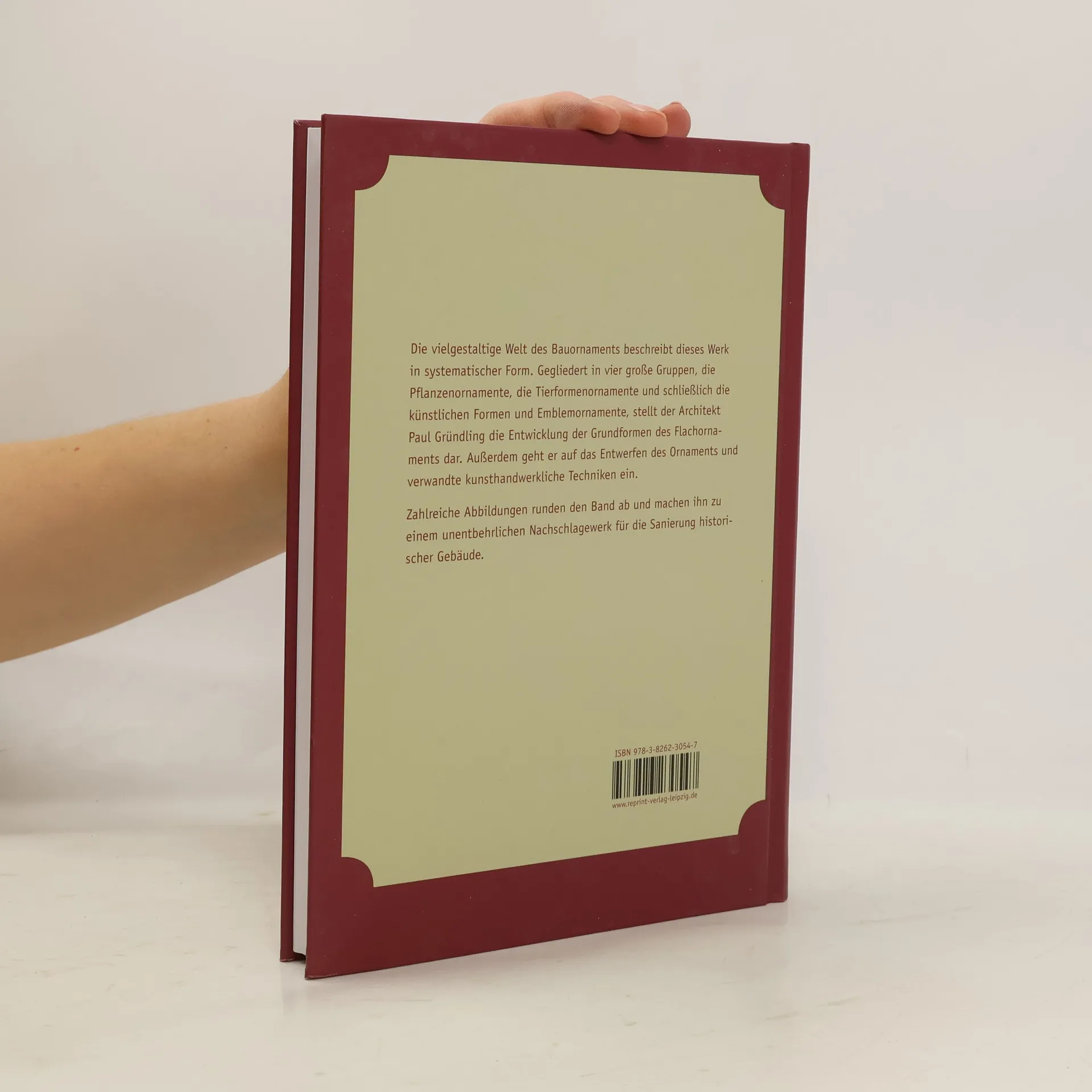 Der Architekt Paul Gründling stellt das schier unerschöpfliche Gebiet der Bauornamentik systematisch dar, gegliedert in vier große Gruppen: die geometrischen Ornamente, die naturalistischen und stilistischen Pflanzenornamente, die naturalistischen und stilistischen Tierformenornamente und schließlich die künstlichen Formen und Emblemornamente. Zugleich bietet der Autor eine historische Herleitung der verschiedenen Ornamentformen. In drei Hauptkapiteln beschreibt Gründling die Entwicklungen der Grundformen des Flachornaments, die verschiedenen Einzelornamente in Geschichte und Gegenwart sowie das Entwerfen des Ornaments und verwandte kunsthandwerkliche Techniken. Viele der vorgestellten Bauformen beziehen sich auf die Fassadengestaltung. Das Buch ist daher auch heute für die Erhaltung und Rekonstruktion historischer Gebäude ein wichtiges Referenzwerk. Aber auch die Innendekoration nimmt breiten Raum ein. Eine ausführliche „Erklärung technischer und fremdsprachiger Ausdrücke“ im Anhang erleichtert auch dem interessierten Laien den Zugang zum Buch.