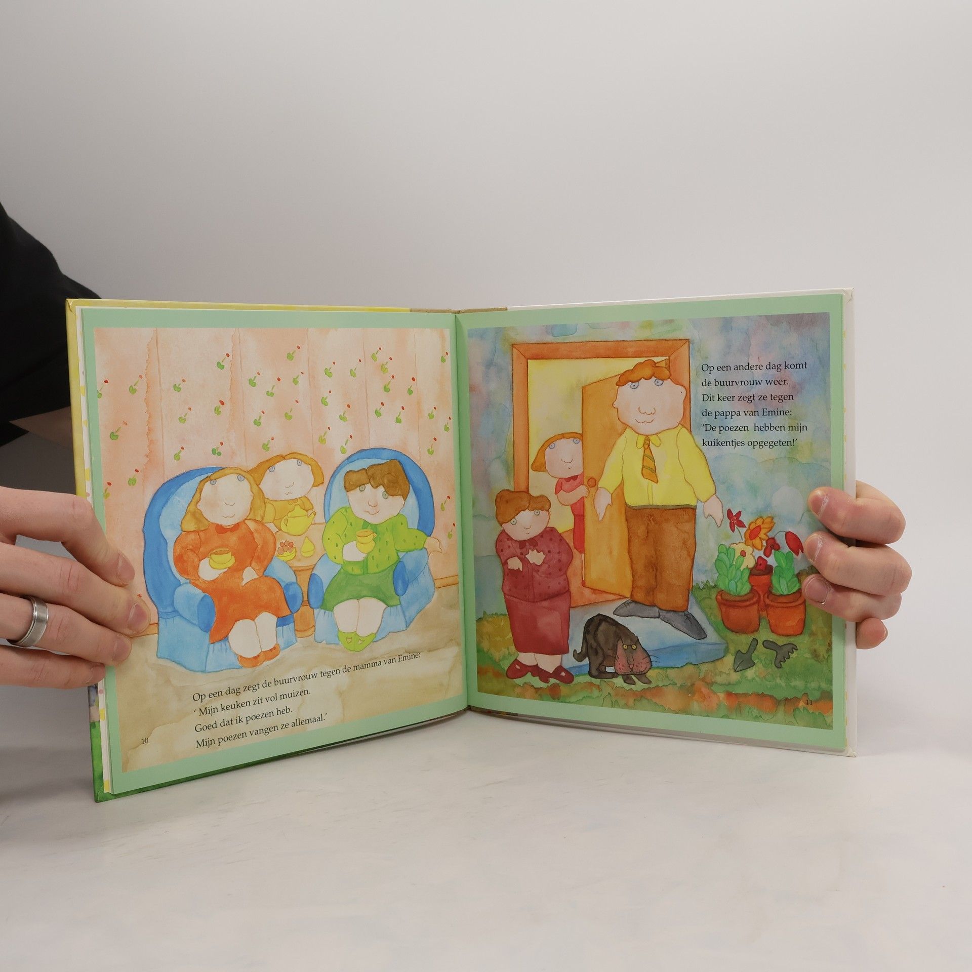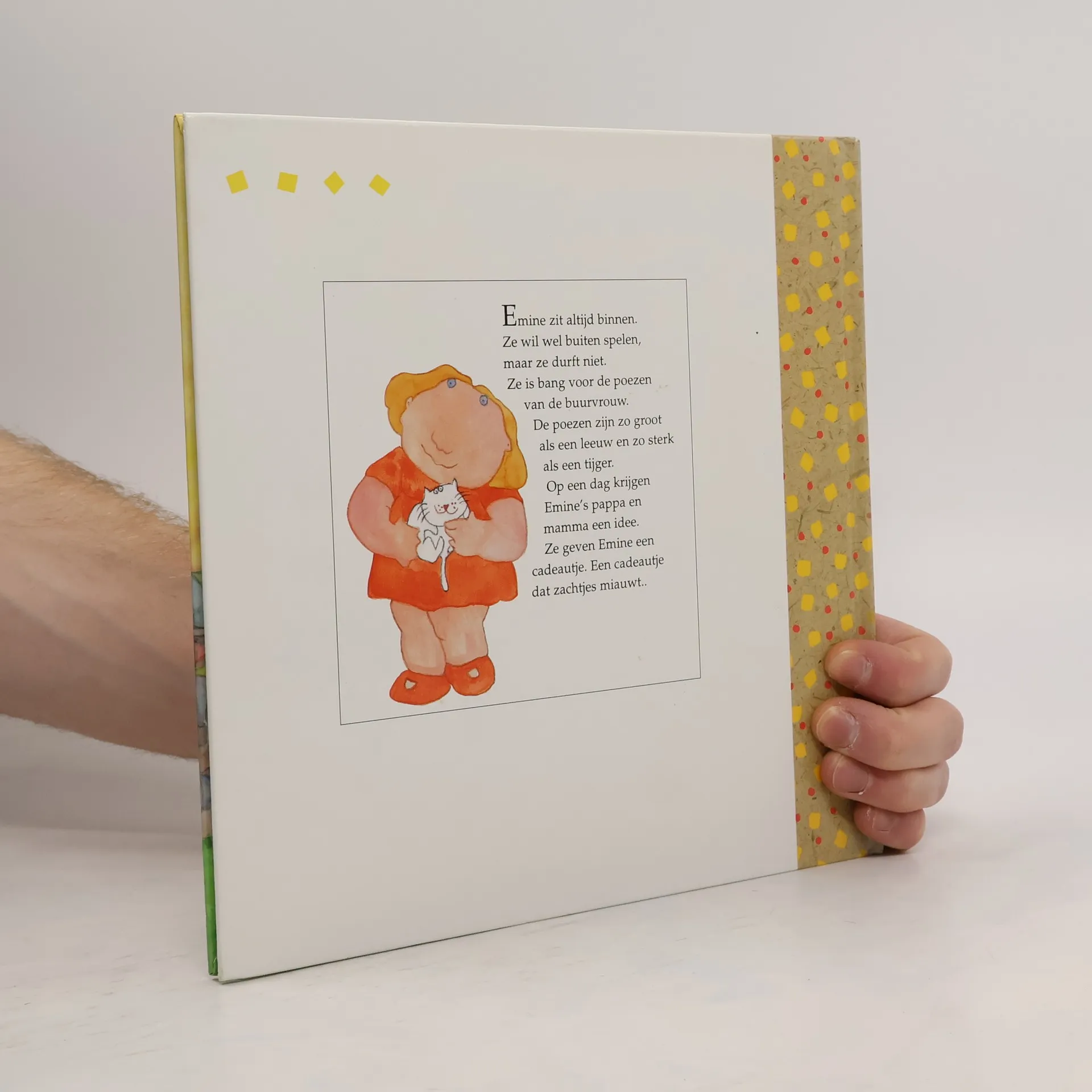 Emine kan haar angst voor de katten van de buurvrouw overwinnen als ze zelf een klein katje krijgt. Prentenboek met grote kleurrijke schilderingen. Vanaf ca. 4 jaar.