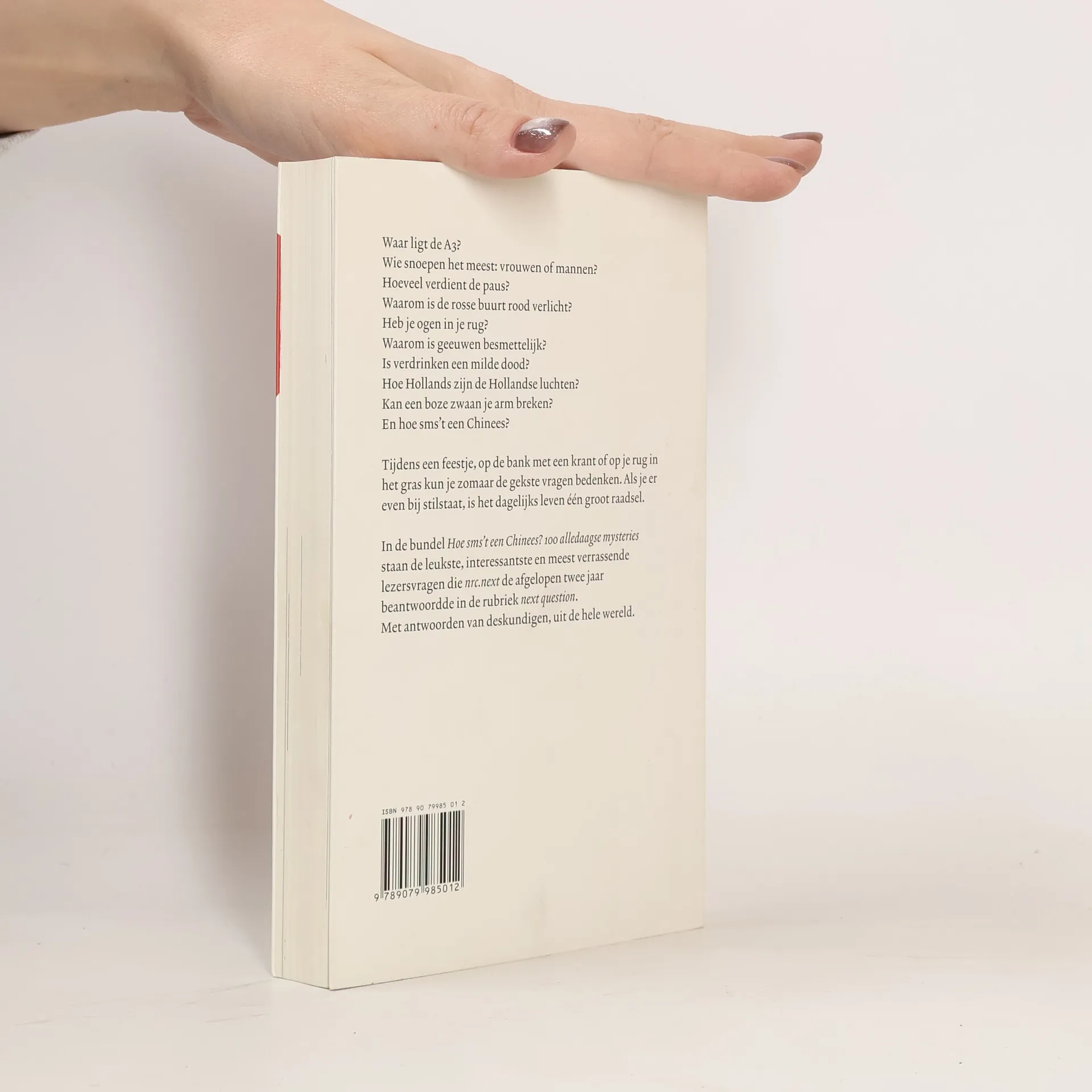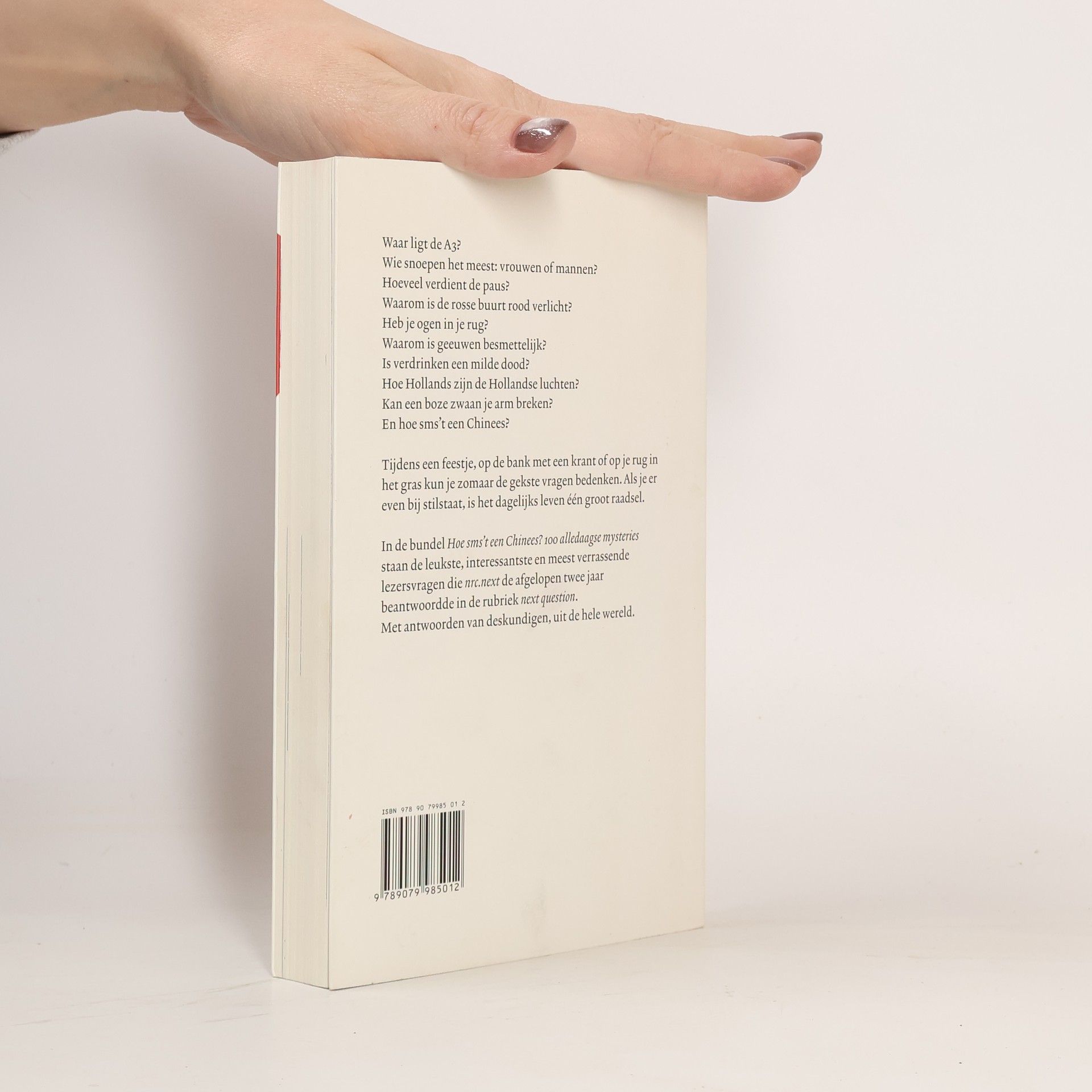 Hoe sms’t een Chinees?Tijdens een feestje, met een krant op de bank of liggend op je rug in het gras kun je zomaar de gekste vragen bedenken. Als je er even bij stilstaat, is het dagelijks leven één groot raadsel. Op de 100 meest bizarre, leukste en vreemdste vragen geeft nrc.next antwoord.Eppo König, redacteur binnenland van nrc.next, maakte een selectie uit de honderden lezersvragen die bij de populaire rubriek next questions binnen kwamen. Uiteraard mét de antwoorden erbij, van deskundigen van over de hele wereld.Waar ligt de A3?Hoe kweek je pitloze druiven?Waarom is geeuwen besmettelijk?Wie snoepen het meest: vrouwen of mannen?Hoeveel verdient de paus?Hoe sms’t een Chinees?Waarom hebben mannen tepels?
