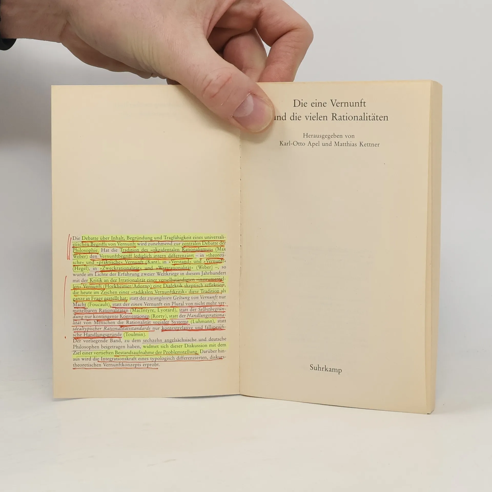 Die Debatte über einen universalistischen Vernunftbegriff wird zunehmend zentral in der Philosophie. Während die Tradition des „okzidentalen Rationalismus“ den Vernunftbegriff intern differenziert hat – in theoretische und praktische Vernunft (Kant), Verstand und Vernunft (Hegel), sowie Zweck- und Wertrationalität (Weber) – führte die Erfahrung zweier Weltkriege zu einer kritischen Reflexion der Irrationalität einer verselbständigten „instrumentellen“ Vernunft (Horkheimer/Adorno). Diese Reflexion hinterfragt die gesamte Tradition im Kontext einer „radikalen Vernunftkritik“. Anstelle der zwanglosen Geltung von Vernunft wird Macht (Foucault) thematisiert, und es wird ein Plural von nicht mehr vermittelbaren Rationalitäten (MacIntyre, Lyotard) anstelle einer einheitlichen Vernunft postuliert. Zudem wird die Selbstbegründung durch kontingente Konventionen (Rorty) ersetzt, und die Handlungsrationalität von Individuen wird durch die Rationalität sozialer Systeme (Luhmann) in Frage gestellt. Der vorliegende Band, zu dem sechzehn Philosophen aus dem angelsächsischen Raum und Deutschland beigetragen haben, widmet sich dieser Diskussion und zielt auf eine vertiefte Bestandsaufnahme der Problemstellung. Zudem wird die Integrationskraft eines differenzierten, diskurstheoretischen Vernunftkonzepts erprobt.