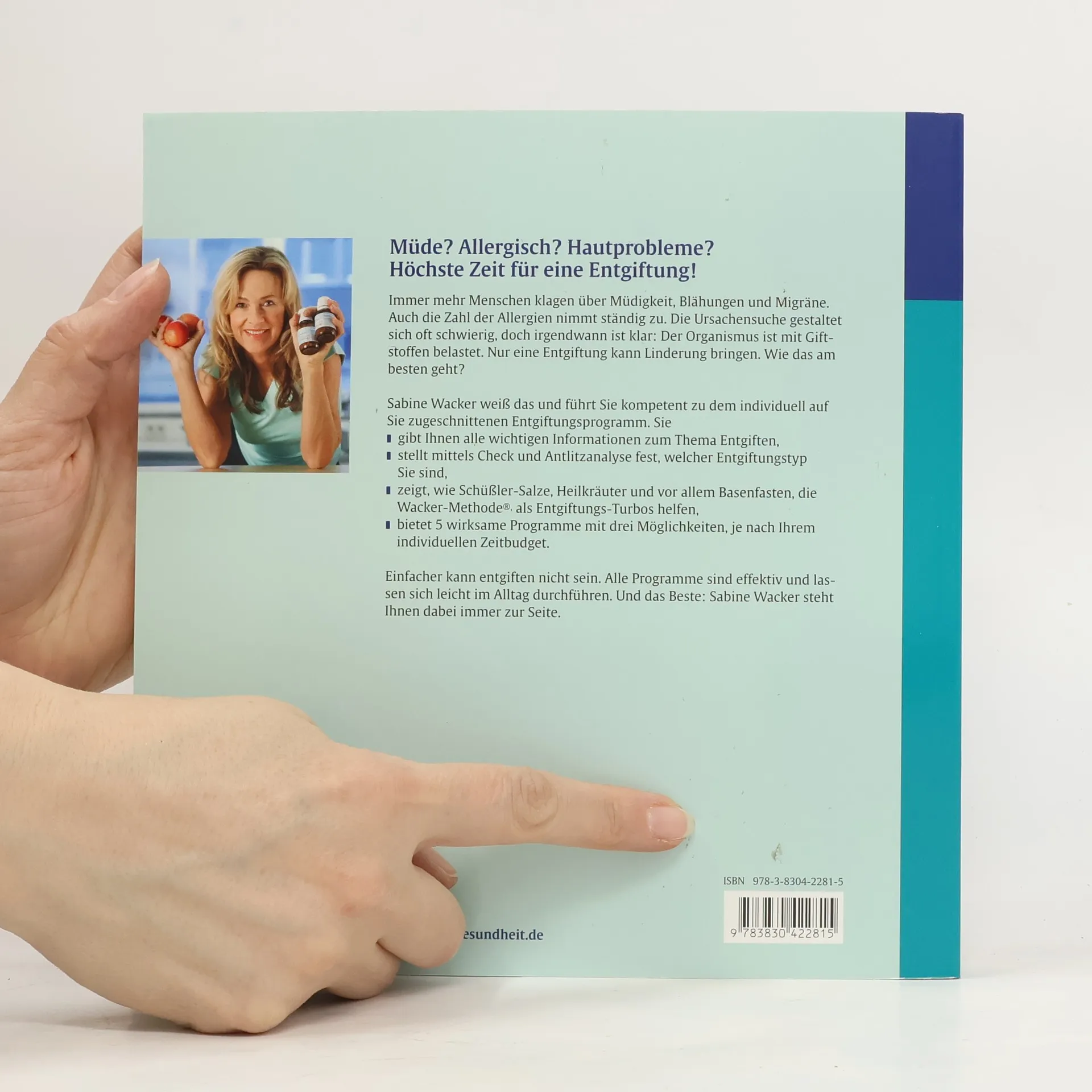 Müde? Allergisch? Hautprobleme? Höchste Zeit für eine Entgiftung! Immer mehr Menschen klagen über Müdigkeit, Blähungen und Migräne. Auch die Zahl der Allergien nimmt ständig zu. Die Ursachensuche gestaltet sich oft schwierig, doch irgendwann ist klar: Der Organismus ist mit Giftstoffen belastet. Nur eine Entgiftung kann Linderung bringen. Wie das am besten geht? Sabine Wacker weiß das und führt Sie kompetent zu dem individuell auf Sie zugeschnittenen Entgiftungsprogramm. Sie gibt Ihnen alle wichtigen Informationen zum Thema Entgiften. stellt mittels Check und Antlitzanalyse fest, welcher Entgiftungstyp Sie sind. zeigt, wie Schüßler-Salze, Heilkräuter und vor allem Basenfasten, die Wacker-Methode®, als Entgiftungs-Turbos helfen. bietet 5 wirksame Programme mit drei Möglichkeiten, je nach Ihrem individuellen Zeitbudget. Einfacher kann entgiften nicht sein. Alle Programme sind effektiv und lassen sich leicht im Alltag durchführen. Und das Beste: Sabine Wacker steht Ihnen dabei immer zur Seite.