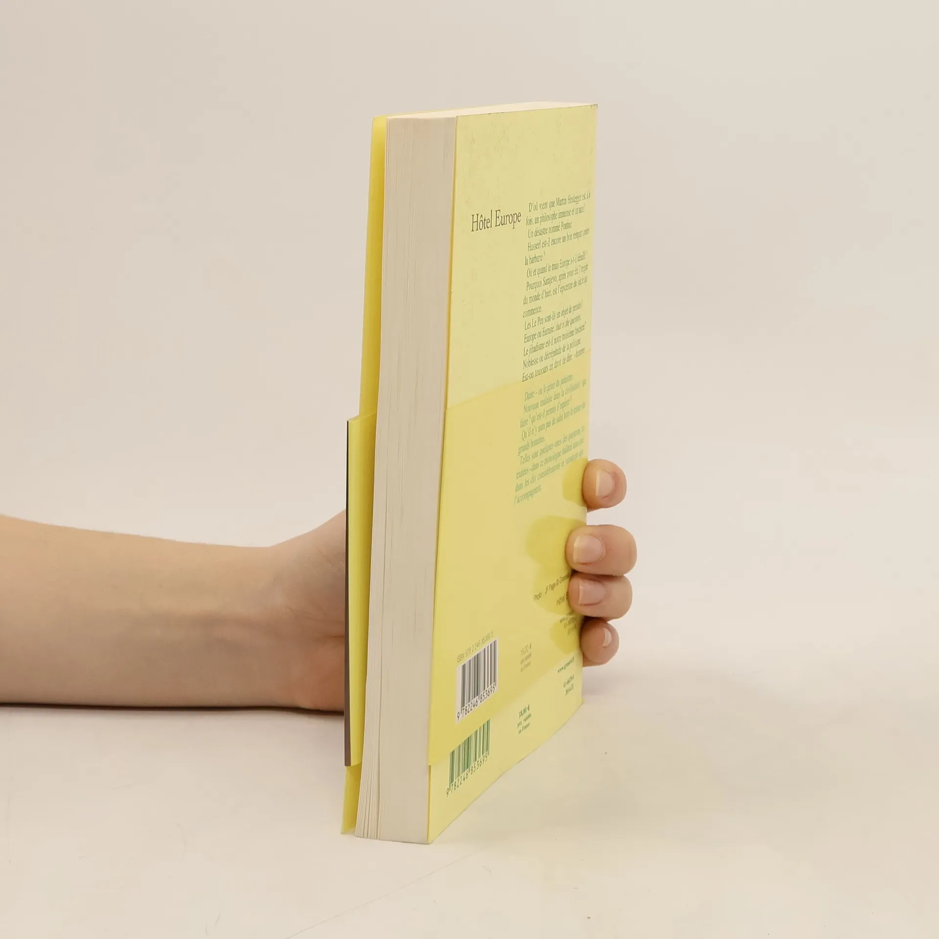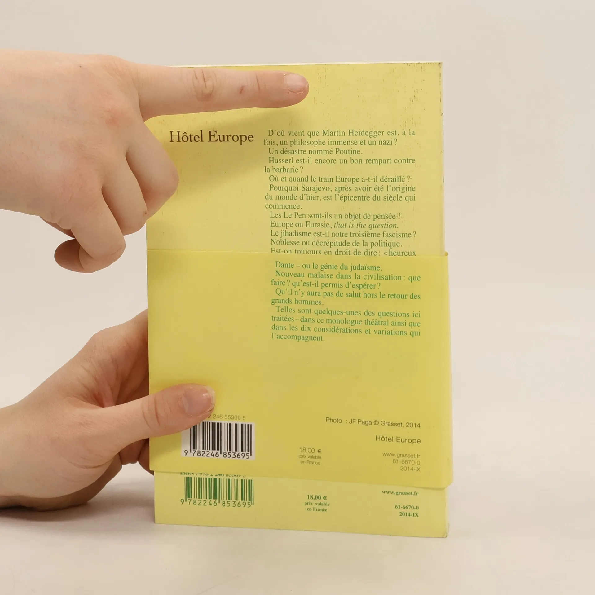 Deux textes en verite.D abord Hotel Europe, monologue en cinq actes, dont l'action se deroule le 27 juin 2014, a Sarajevo, en pleine ceremonie de commemoration du declenchement de la guerre de 1914. Un homme, sans doute un ecrivain, est enferme entre les quatre murs d'une chambre d'hotel qu'il a connue vingt ans plus tot et ou il est cense preparer le discours qui lui a ete commande pour la circonstance et qui doit porter sur l'Europe, ses valeurs constitutives, son futur et l etat present de son esprit. Il est seul. Le monde exterieur ne lui parvient qu a travers l indistincte clameur qui monte de la rue en fete. Et il a, pose devant lui, un ordinateur ou il navigue en quete de vieilles photos, de documents vagues, d inspiration.Ensuite, Nouvelles vues sur l Europe, un essai philosophico-politique developpant ou elucidant les points les plus enigmatiques du texte theatral. Il y est question de Husserl, de Heidegger, de la montee des populismes et des souverainismes, du malaise (ou de l impasse ) dans la civilisation d aujourd'hui ainsi que des progres, partout, du nihilisme et puis, aussi, de la facon dont peut et doit se nouer, ici et maintenant, le triple fil, constitutif du genie europeen, de l esprit d Athenes, de celui de Rome et du genie de Jerusalem. Un diagnostic. Des solutions. Et des raisons de croire et d esperer."