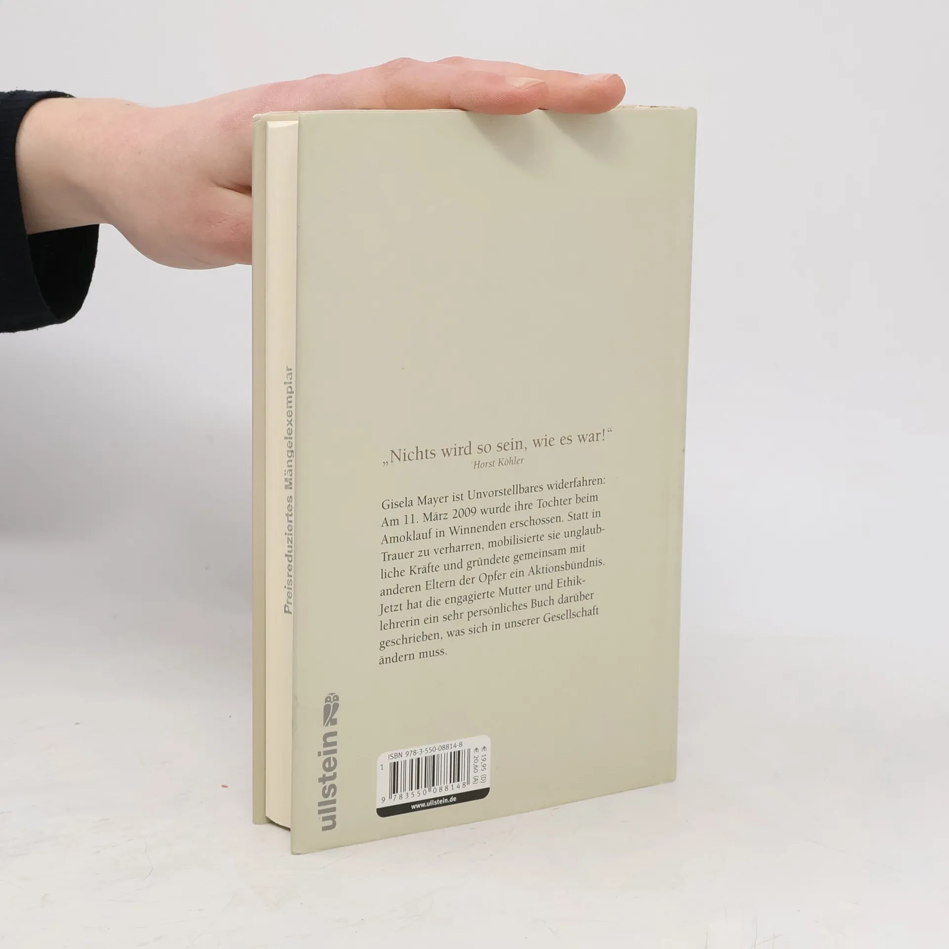 Ihre Tochter starb in Winnenden. Jetzt schreibt Gisela Mayer ein sehr persönliches Buch darüber, was sich in unserer Gesellschaft ändern muss. Der 11. März 2009 war der schwärzeste Tag im Leben von Gisela Mayer: Es war der Tag, an dem ihre Tochter von einem jugendlichen Amokläufer in den Tod gerissen wurde. Wie konnte es zu diesem entsetzlichen Verbrechen kommen? Was läuft in unserer Gesellschaft schief? Gisela Mayer ist engagierte Mutter und Ethiklehrerin. Seit langem schon kämpft sie gegen die Gleichgültigkeit und Kälte, die sich in unserer Gesellschaft immer stärker verbreiten. Sie fragt, warum viele Kinder und Jugendliche keinen Respekt mehr vor anderen Menschen haben; sie lehnt Killerspiele und Gewaltvideos ab, weil sie uns immer mehr abstumpfen lassen; und sie zeigt, was sich ändern muss, damit es kein zweites Winnenden mehr geben kann. Ein mutiges Buch, das durch seine Klarheit und Haltung überzeugt.
