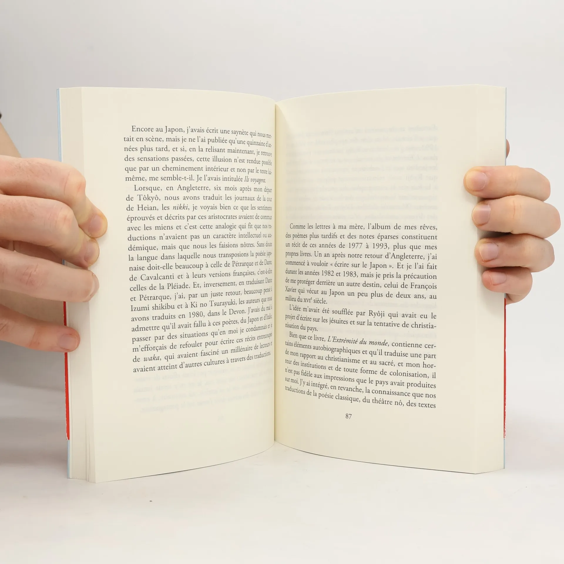 «Dès mon arrivée à Tôkyô, j’avais été frappé par la beauté exceptionnelle de sa lumière. La nuit tombant, des marchands de patates douces cuites à la braise avançaient leurs carrioles, éclairées de lanternes en papier, en chantonnant des mélopées lugubres comme des thrènes qui invitaient la clientèle. Dans la journée, d’autres voiturettes, elles modernes, collectaient les vieux journaux, elles aussi en faisant retentir des ritournelles, mais moins tristes.»René de Ceccatty relate ici son lointain séjour au Japon et les années qu’il a consacrées à la littérature de ce pays. Dans cette évocation, il nous livre un autoportrait sans complaisance, puisant dans ses souvenirs comme dans certaines lettres envoyées et conservées par sa mère… Le Japon et la découverte d’une nouvelle forme de pensée et de rapport au monde l’auront marqué à jamais, comme une deuxième naissance, influençant son parcours artistique et sentimental. Avec beaucoup de détermination et d’énergie, René de Ceccatty réussit à s’arracher au temps présent en écrivant, et à ranimer non le passé comme passé, mais «le présent du passé».